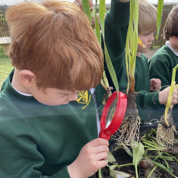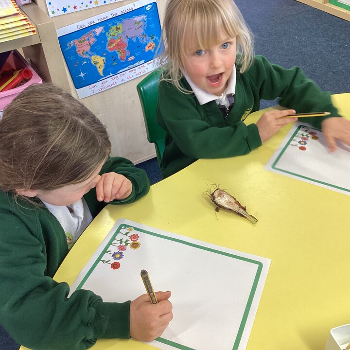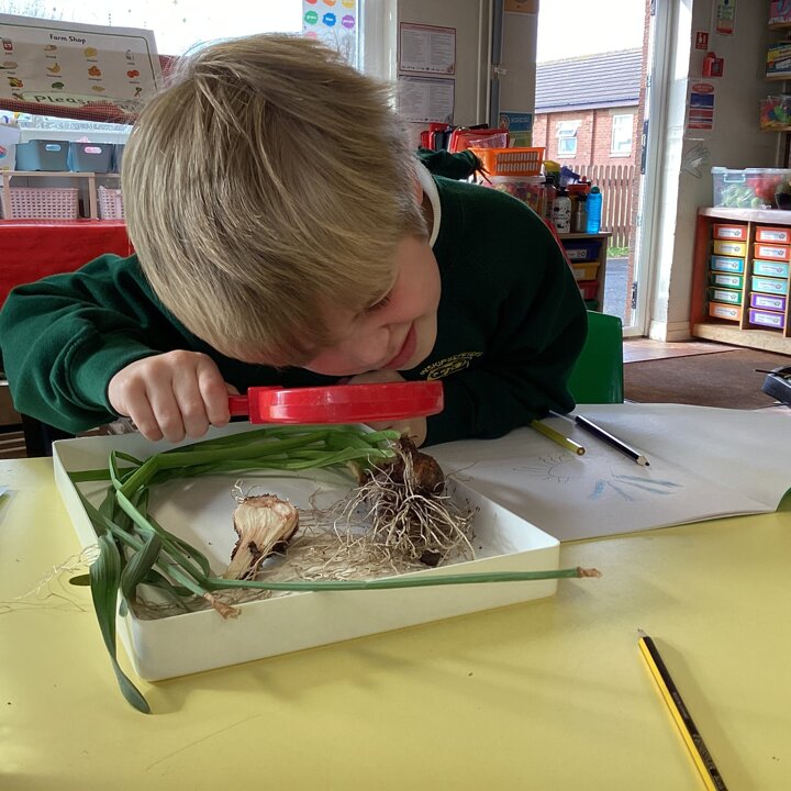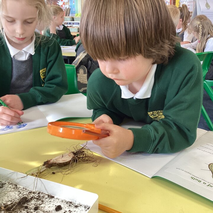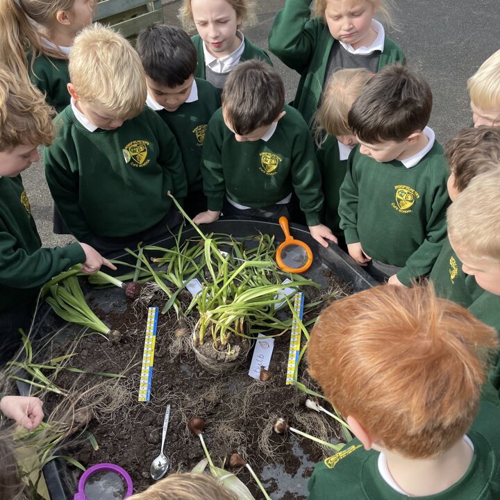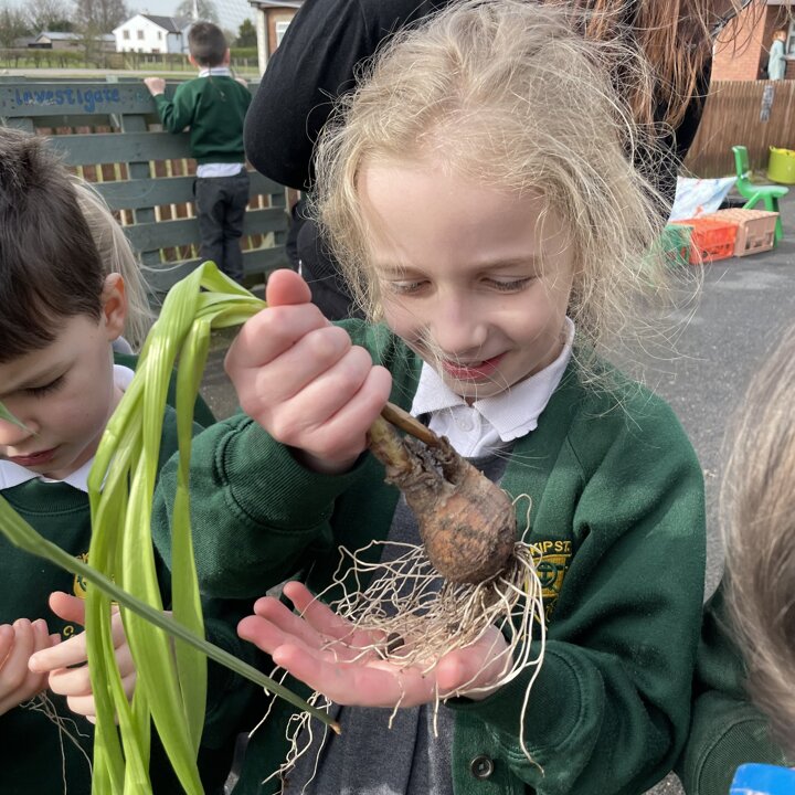 In science we have looked closely at bulbs developing our scientific skills of investigating, observing and questioning. If you look back through our blog posts to the 21st January here https://inskip.lancs.sch.uk/blog/2022-01-21-19-45-00-what-are-they you’ll find a post where I surprised the children by bringing into school some daffodil plants (but didn’t tell them that the plants were daffodils!). The children cared for the plants and watched them grow. I added to the activity by bringing two hyacinths and some tulips growing in pots for the children to observe as well once the daffodils had grown. Over time the children have watched the flowers bloom and then die.