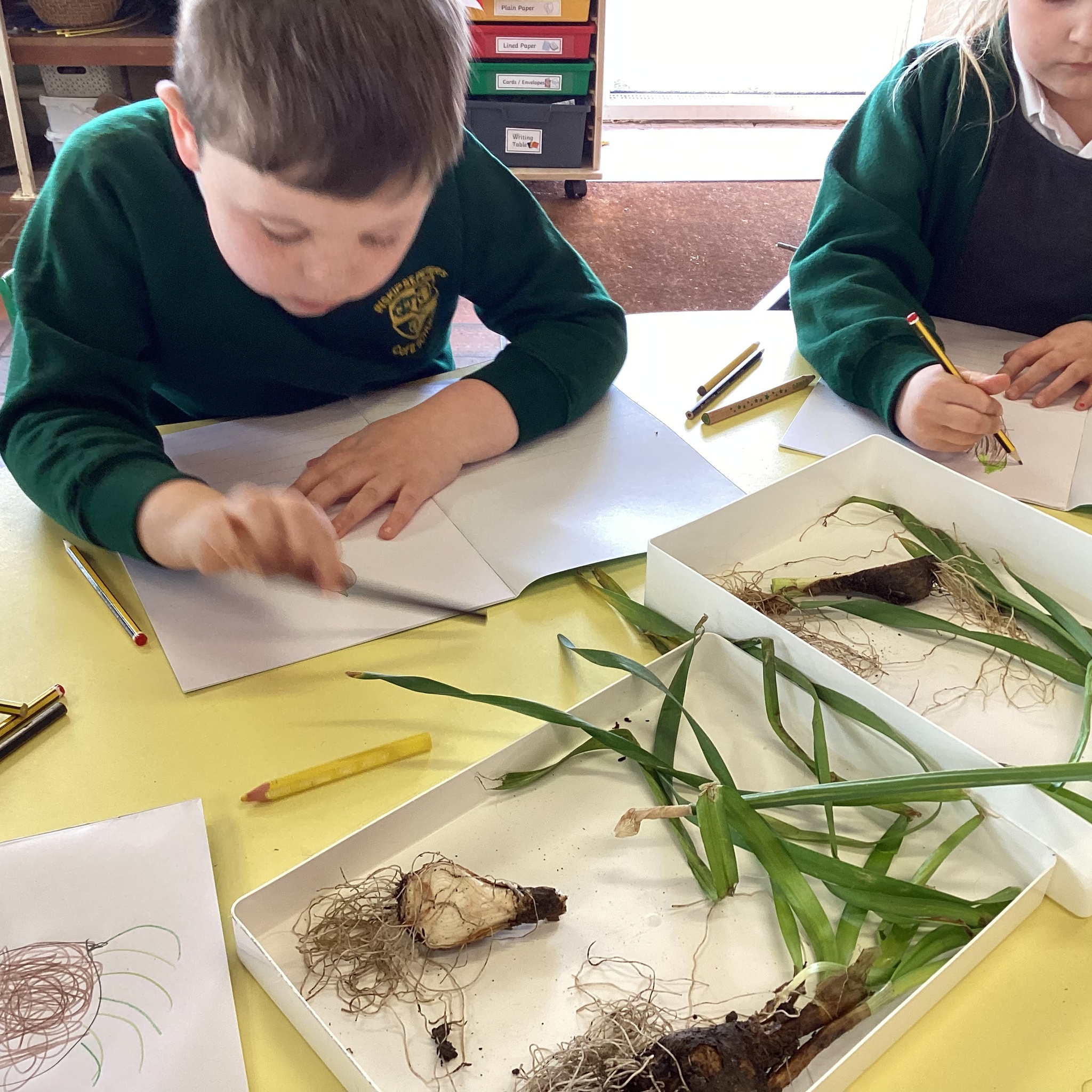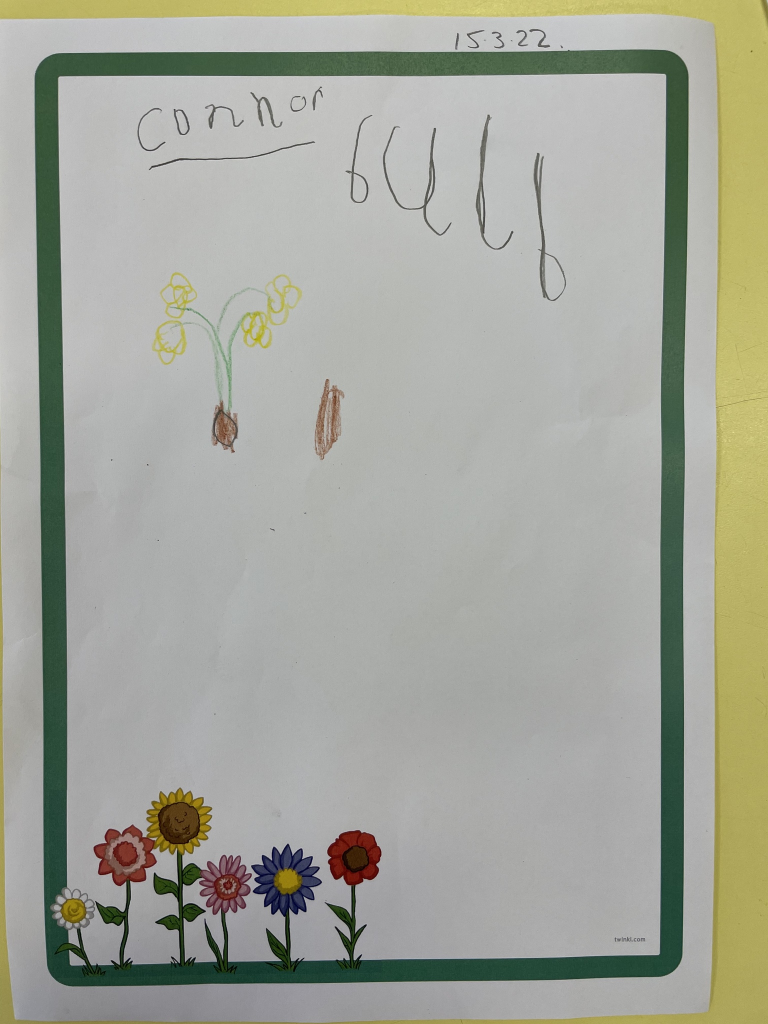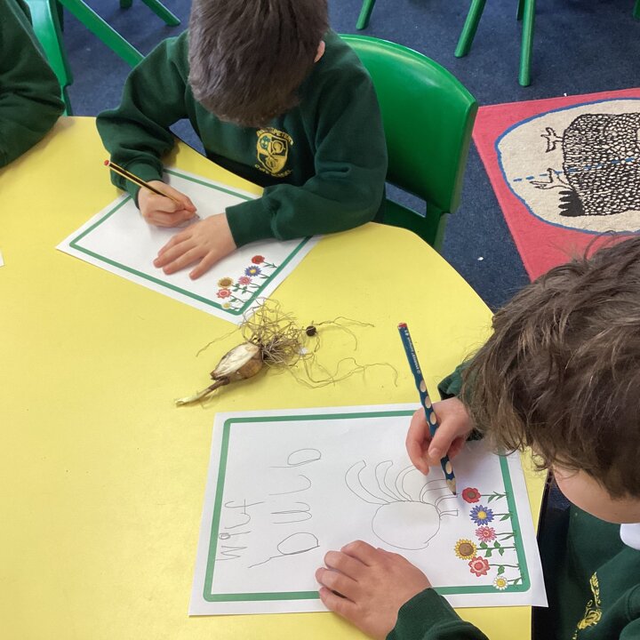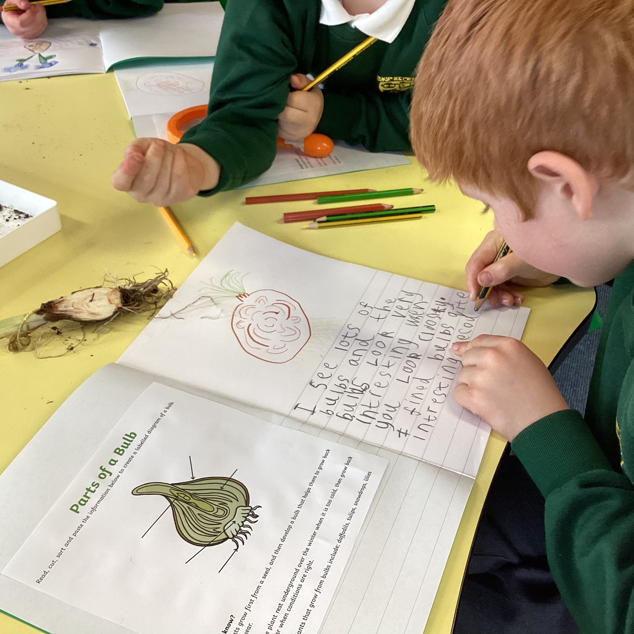 Firstly the children had a good look at the different bulbs “they look like onions”, “that looks like a radish” lots of comparisons to familiar things were made. They felt the roots and measured the different lengths “they are like spaghetti”, “ooooo they feel funny”, “they’re thin and they break” were a few of the comments. Then I cut some of the daffodil bulbs in half and the children had a close look and lots of discussion. Our Reception children drew what they saw and used their phonics to sound out the word bulb whilst year 1 and 2 made observational drawings and wrote about what the bulbs.