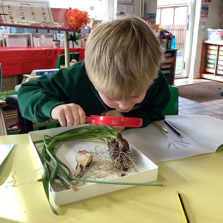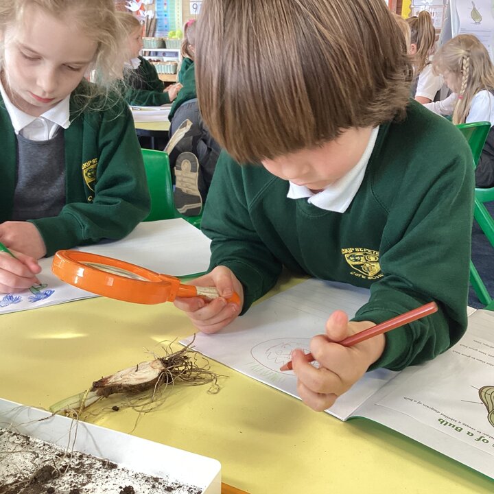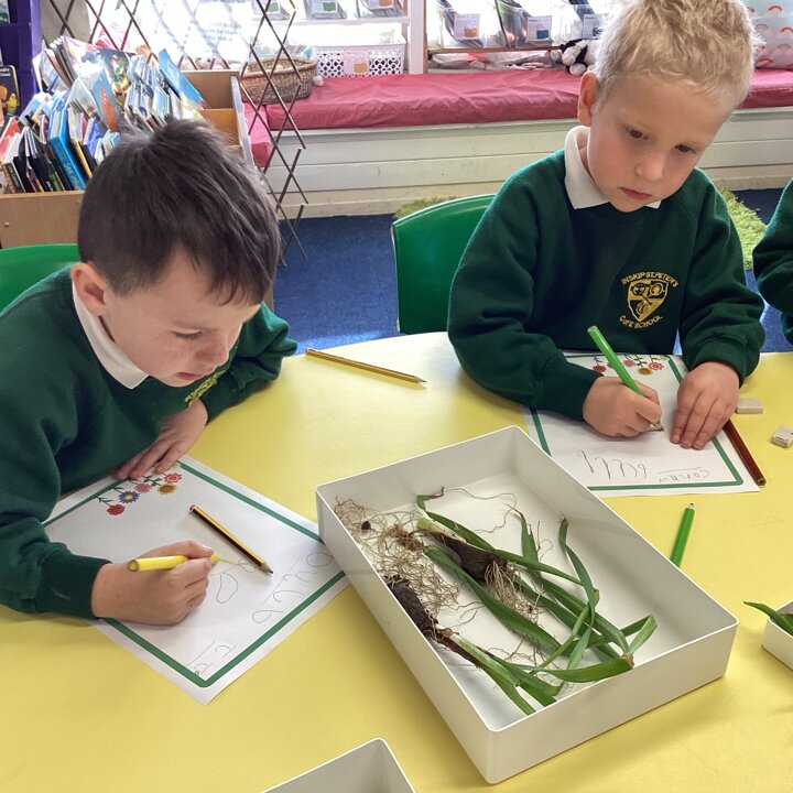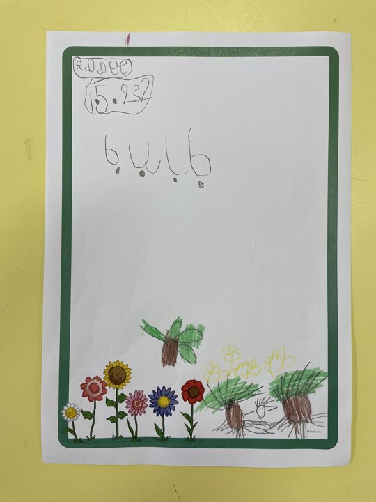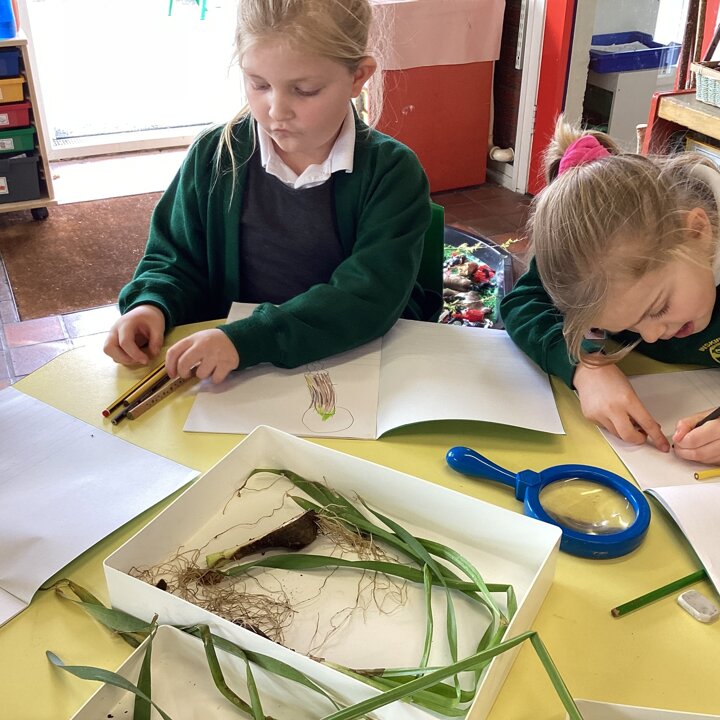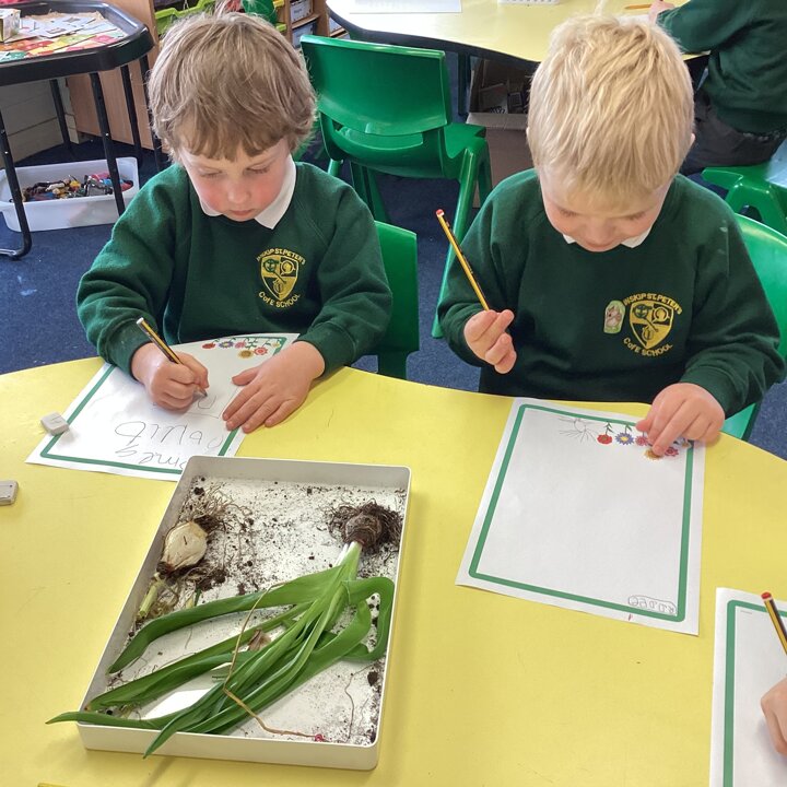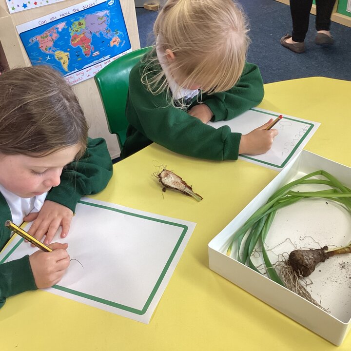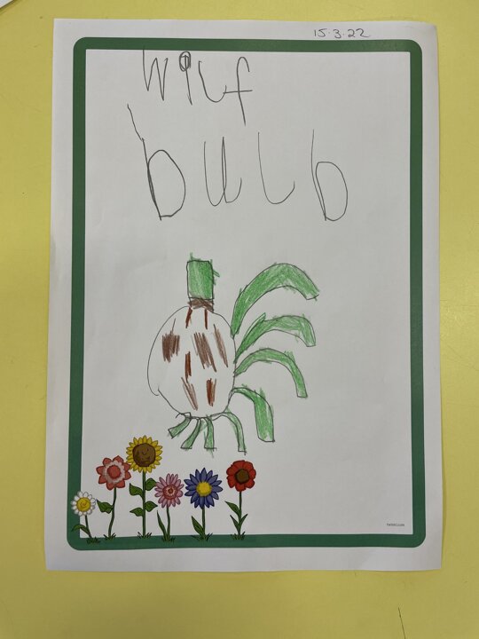 Firstly the children had a good look at the different bulbs “they look like onions”, “that looks like a radish” lots of comparisons to familiar things were made. They felt the roots and measured the different lengths “they are like spaghetti”, “ooooo they feel funny”, “they’re thin and they break” were a few of the comments. Then I cut some of the daffodil bulbs in half and the children had a close look and lots of discussion. Our Reception children drew what they saw and used their phonics to sound out the word bulb whilst year 1 and 2 made observational drawings and wrote about what the bulbs.