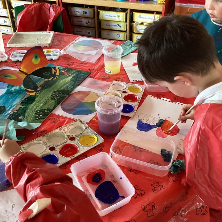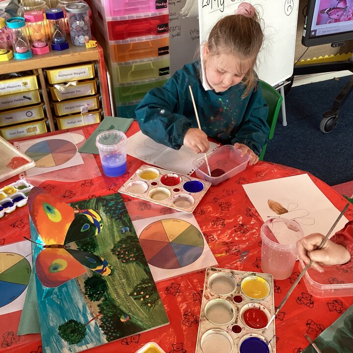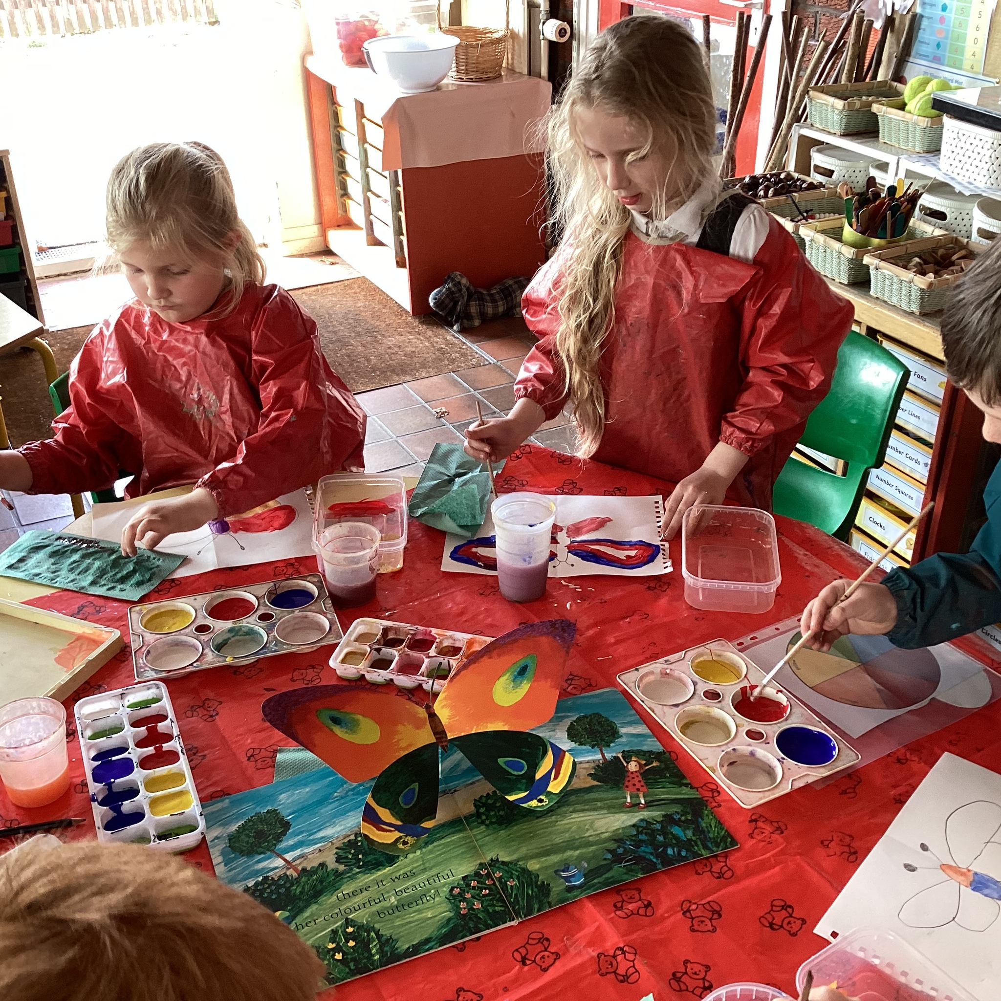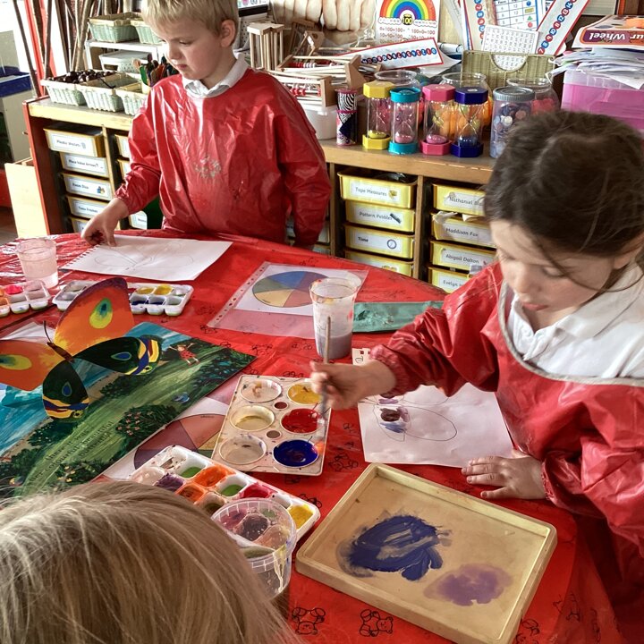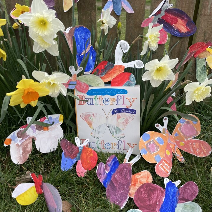 Our art topic this week learning about colour (see previous posts https://inskip.lancs.sch.uk/blog/2022-03-24-15-15-00-colour and https://inskip.lancs.sch.uk/blog/2022-03-24-15-30-17-tertiary-colours). Petr’s use of colour is fantastic, the children have been inspired by the illustrations in each book we've read so far, so I chose ‘Butterfly Butterfly’ to be the hook for our final art activity this week for the children to apply the skills they’ve learnt and it has been a great success!