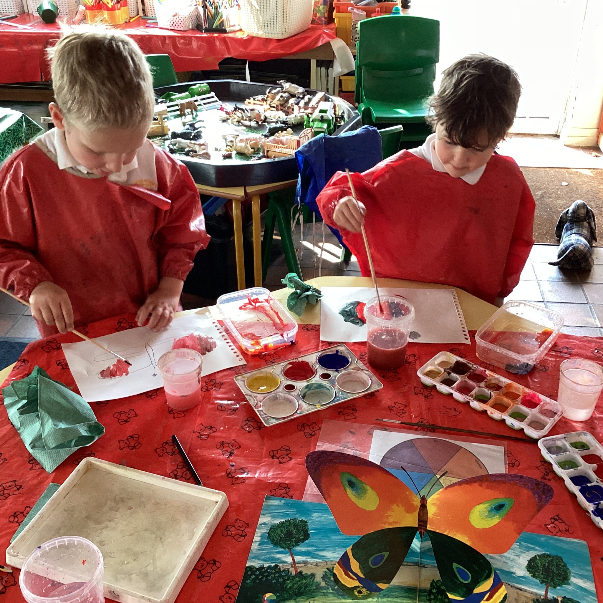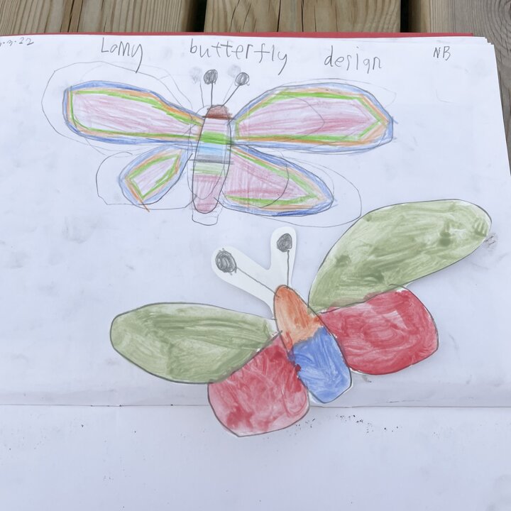 After the previous two colour mixing activities I gave the children the primary colours, white and a few others to choose freely and experiment in mixing and creating new colours for their butterflies. It was so lovely to see the joy in their faces as new colours appeared in their mixing trays! There were lots of “look at this”, “look what I’ve made” and lots of brilliant adjectives being used to describe their new colours and names given to them. I am so proud of their progress.