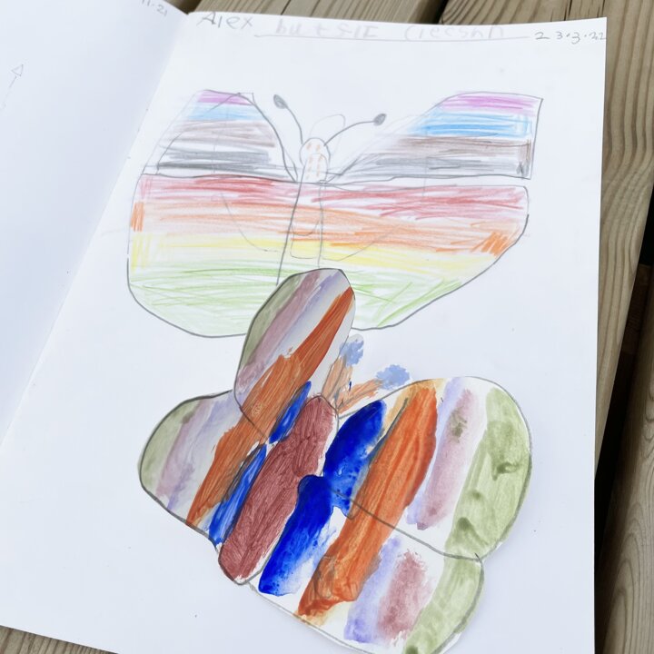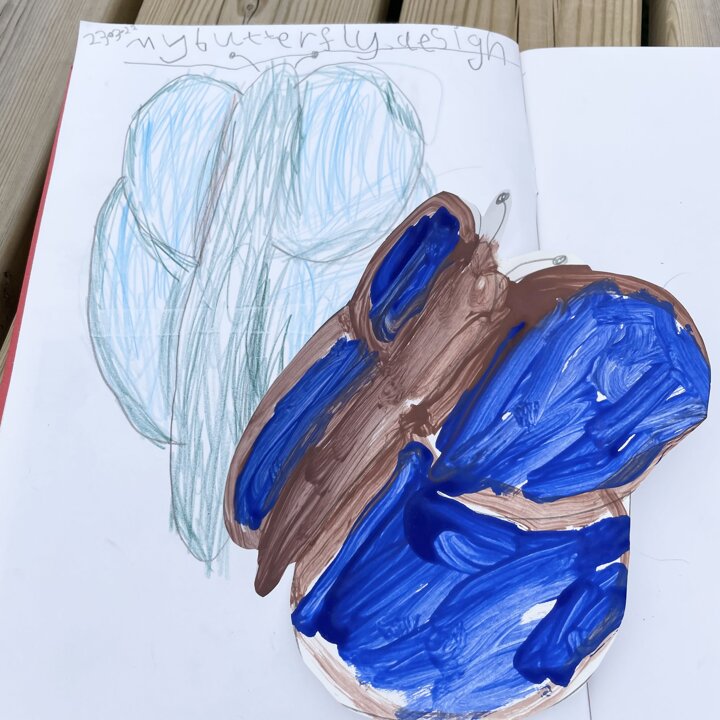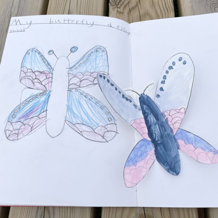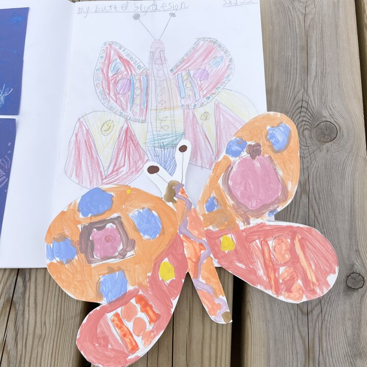 After looking at images of real butterflies in books and digitally on screen, lots of discussion about the colours, shapes and reasons for the patterns on wings, the children drew a butterfly in pencil. Then they drew another in their sketch books remembering our maths learning about symmetry and trying hard to match the size and shape of the wings on each side. Next they planned the colour design of the wings and symmetry in the sketch books before painting their original pencil drawn butterfly.