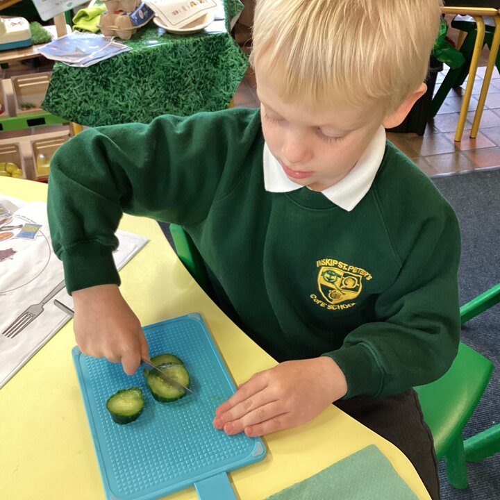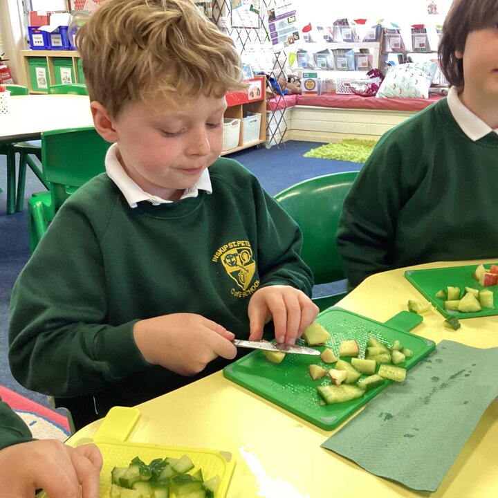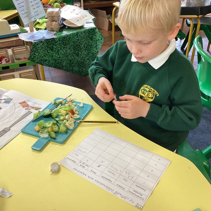 Building on their prior learning about different food groups the children sorted the ingredients I had brought into school into proteins, dairy, vegetables and fruit and carbohydrates. Then after washing their hands they washed and prepared the food ready to chop and taste.
