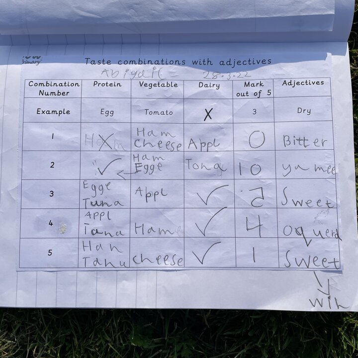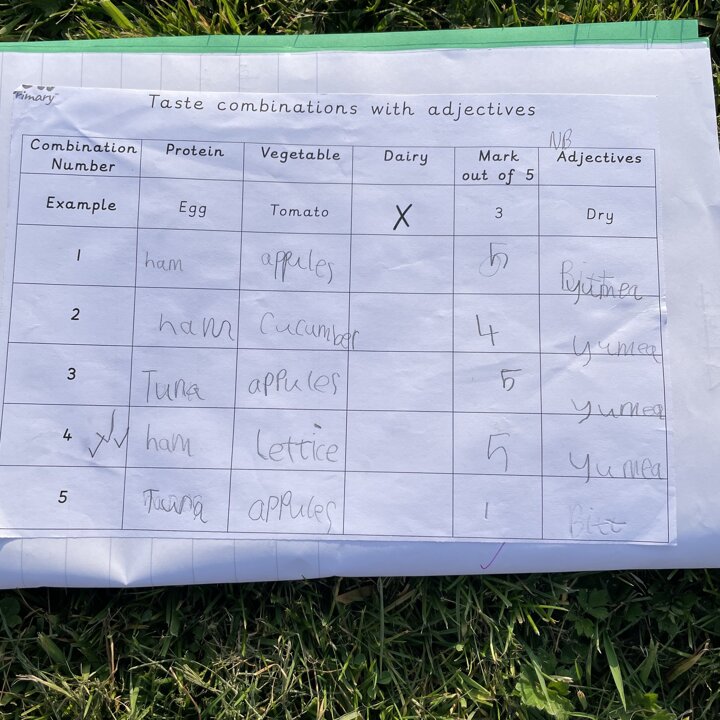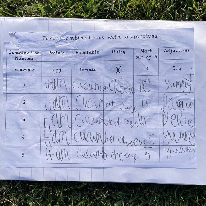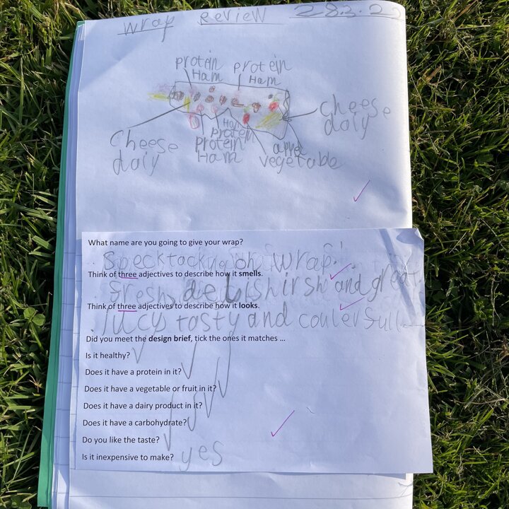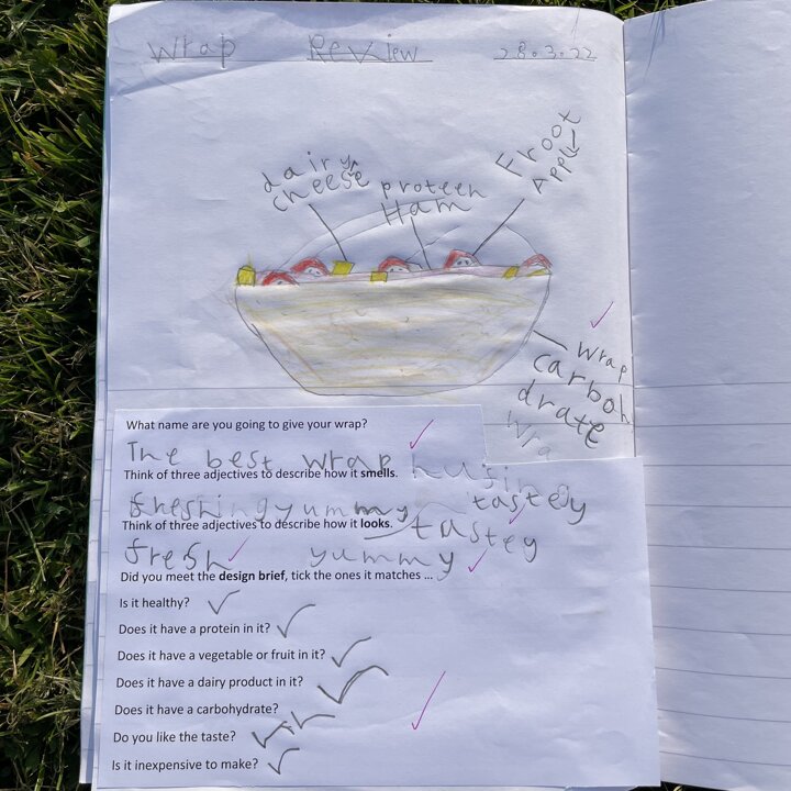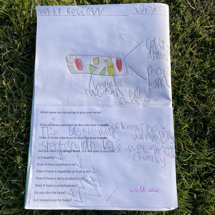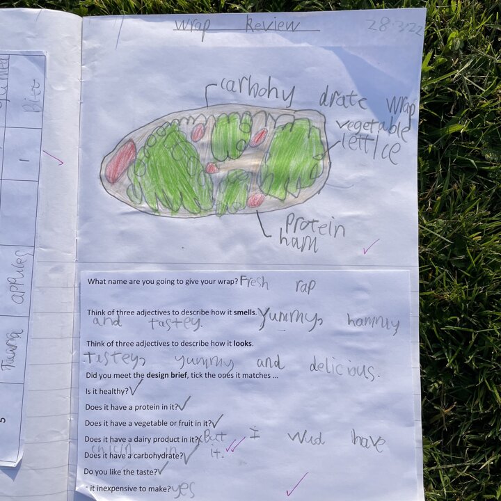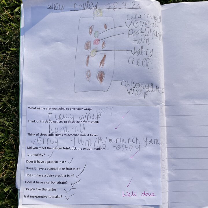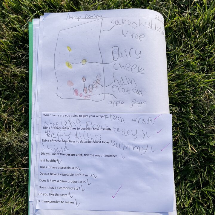 I gave them the task of combining three different foods, taking one from each food group (except the wrap as that was our chosen carbohydrate) and evaluating each one. They gave each one a score and described it with adjectives before choosing their highest scoring combination and then using that to make their final healthy wrap. Finally after eating their final design they reviewed it and checked to see if they had met the original design criteria.
