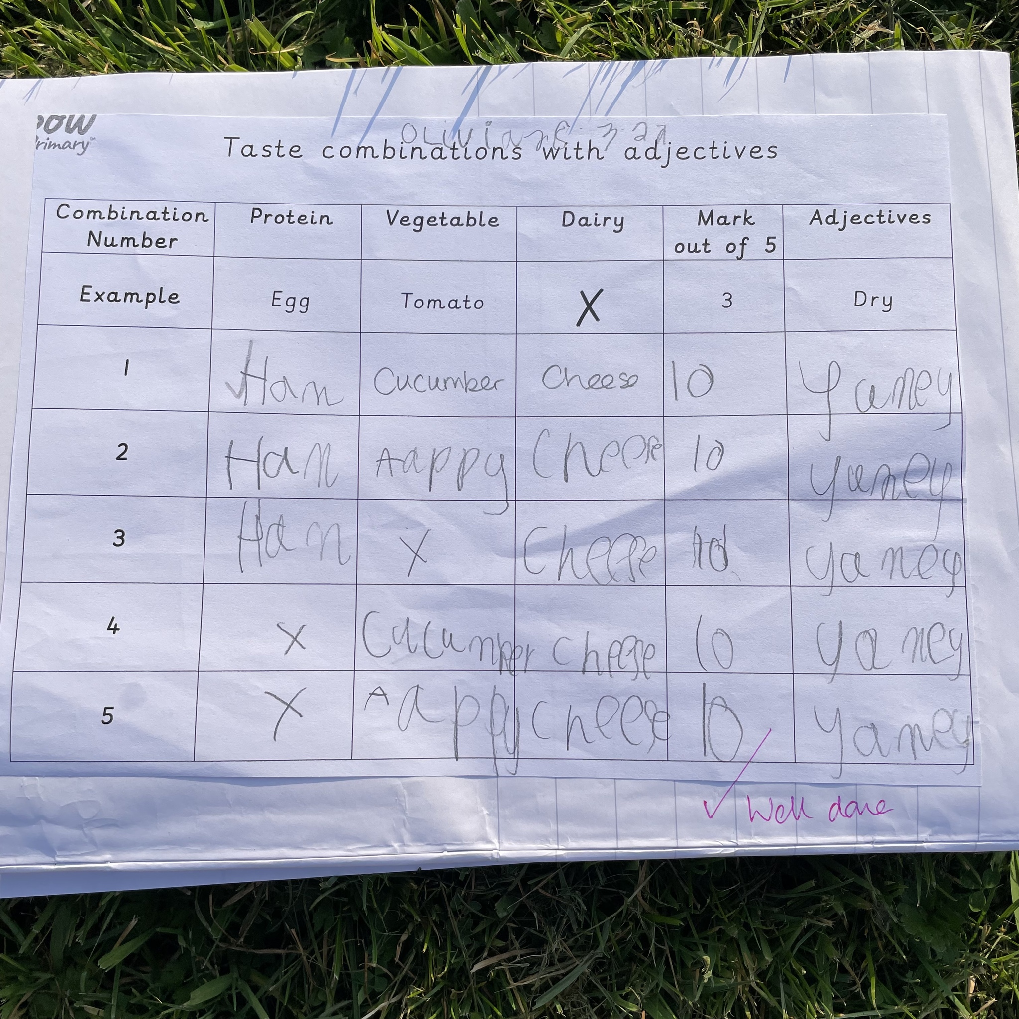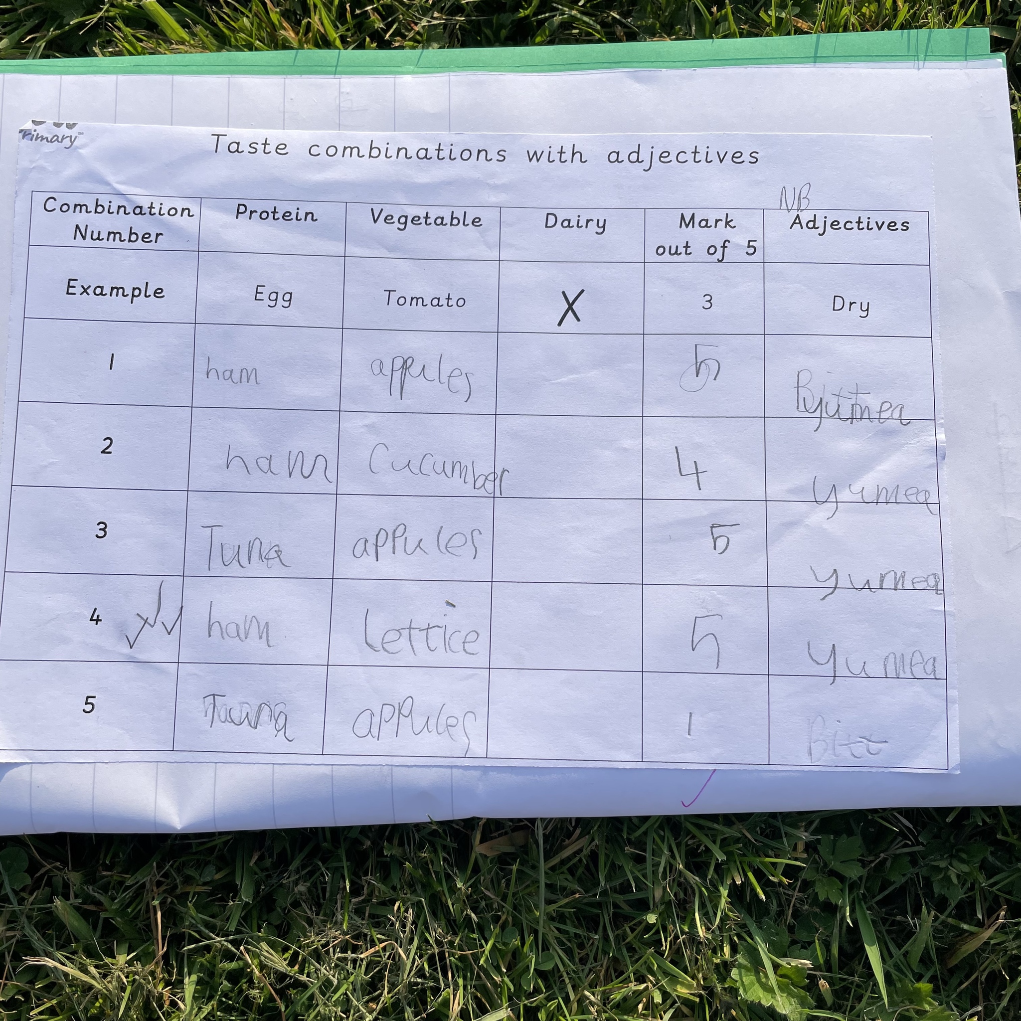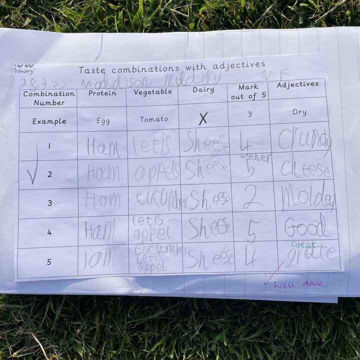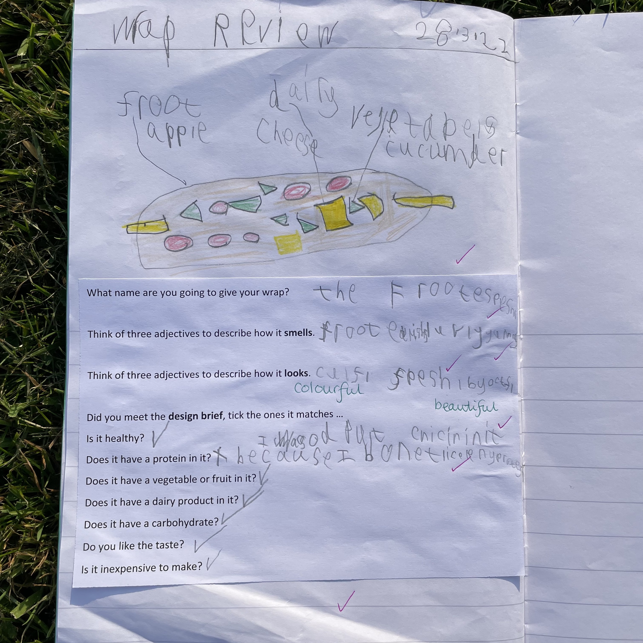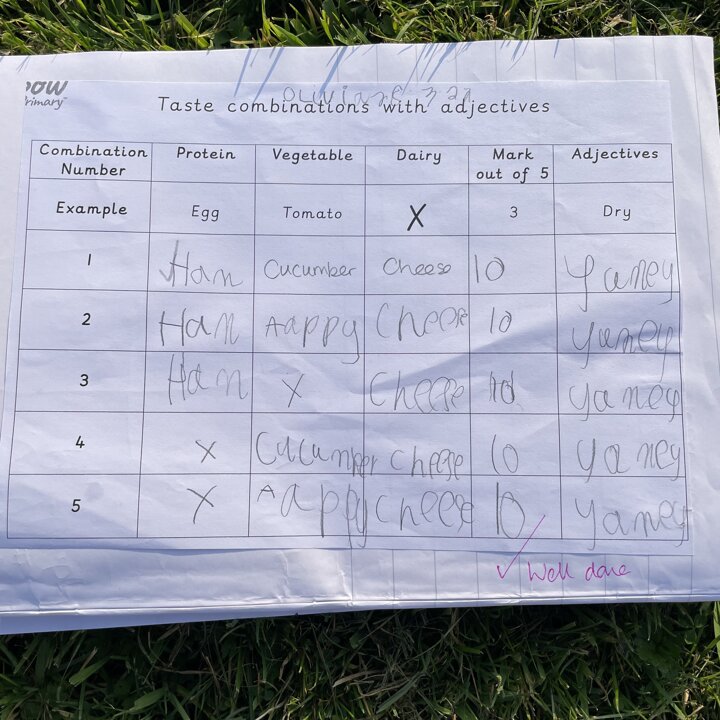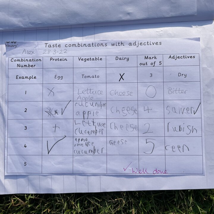 I gave them the task of combining three different foods, taking one from each food group (except the wrap as that was our chosen carbohydrate) and evaluating each one. They gave each one a score and described it with adjectives before choosing their highest scoring combination and then using that to make their final healthy wrap. Finally after eating their final design they reviewed it and checked to see if they had met the original design criteria.