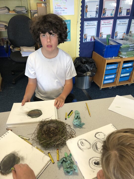 Today the class looked closely at the different nests that I brought in. We decided which birds they might have belonged to by looking at published art books and then used charcoal and chalks to recreate the nests in the sketch books.