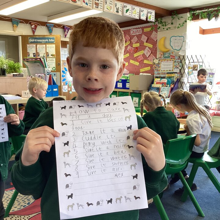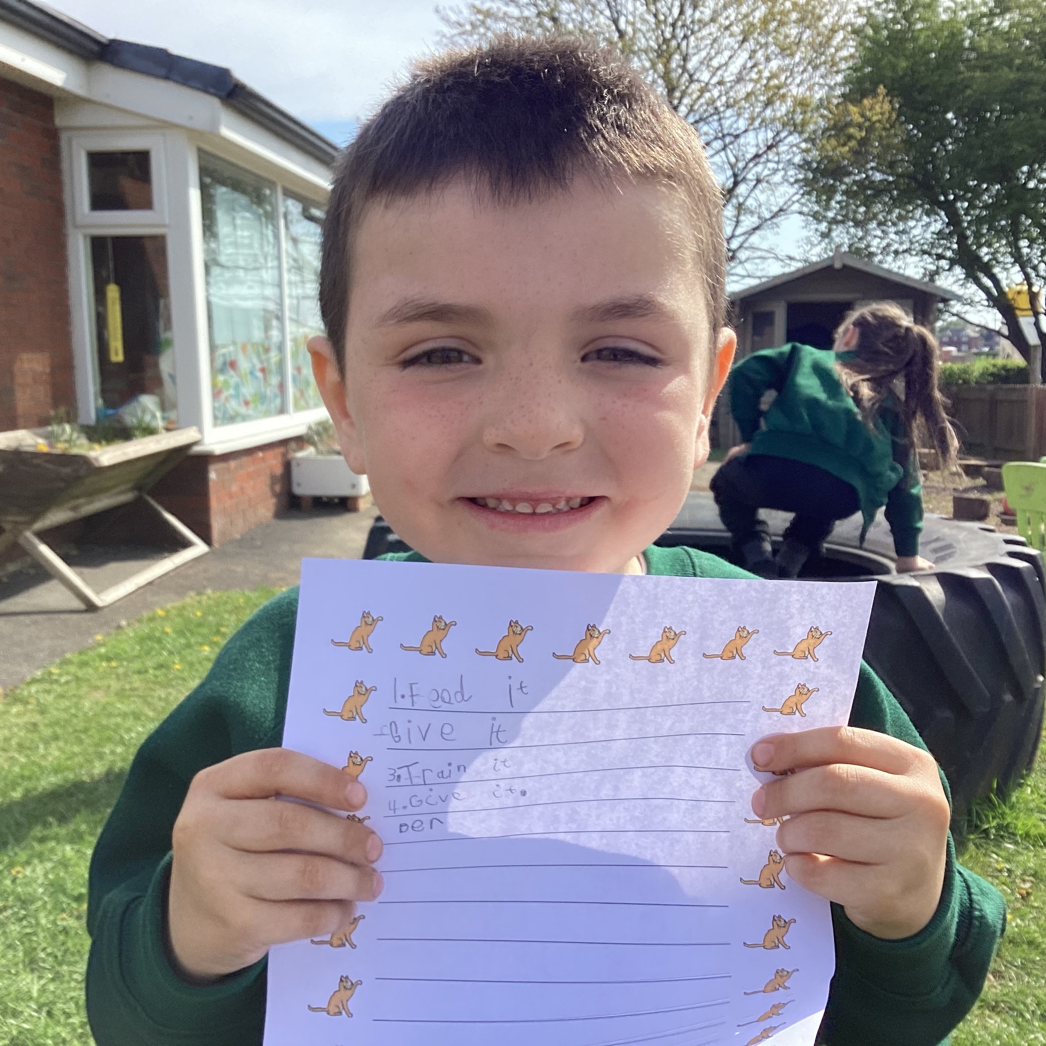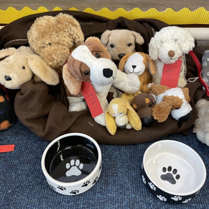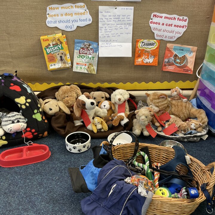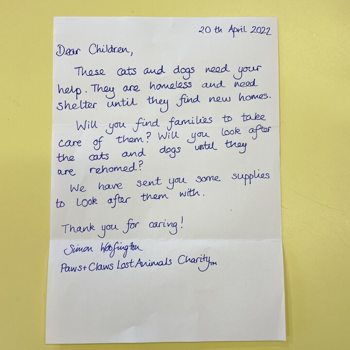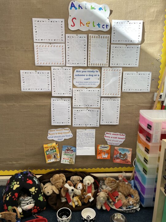 After receiving the box and accompanying letter (see the photos below) the children and I set up an Animal Shelter. We researched animal shelters and discovered what they do and read the story ‘Hairy Maclary From Donaldson’s Dairy’ to inspire the writing tasks the class then did. The Reception children had the task of organising the animals and giving the cats and dogs names. The Year 1 and 2 children had the task of writing instructions for the people who came to adopt the animals telling them how to care for a cat or a dog.