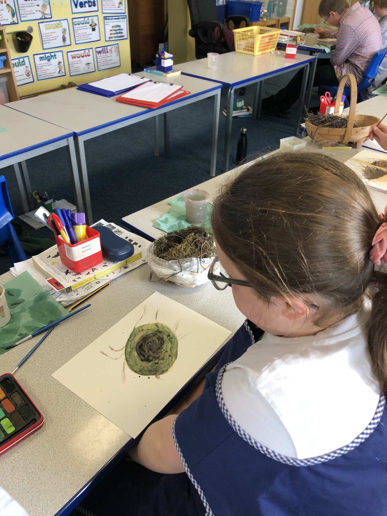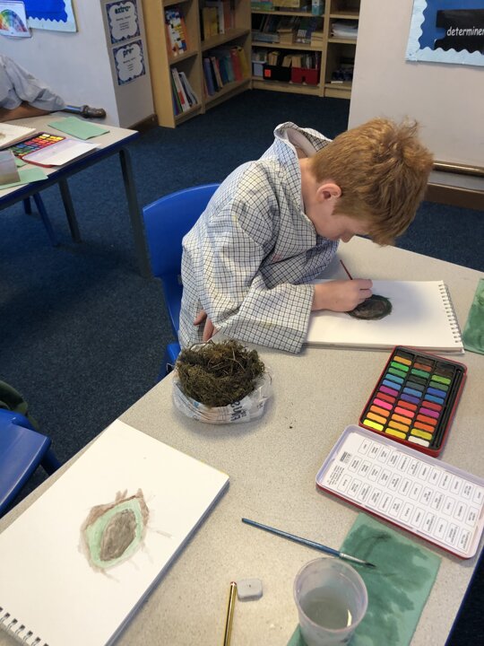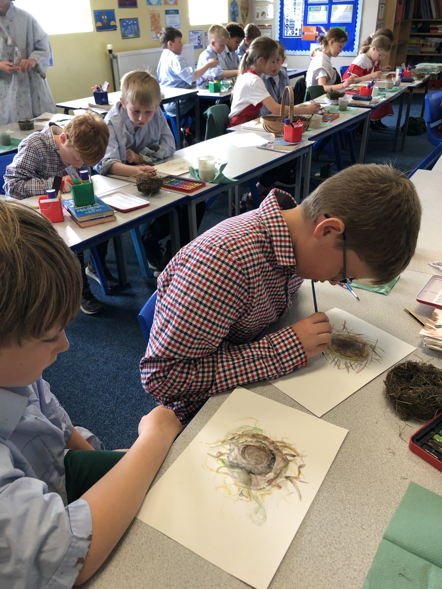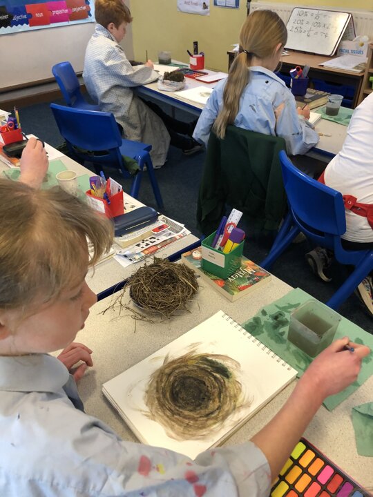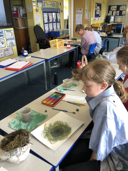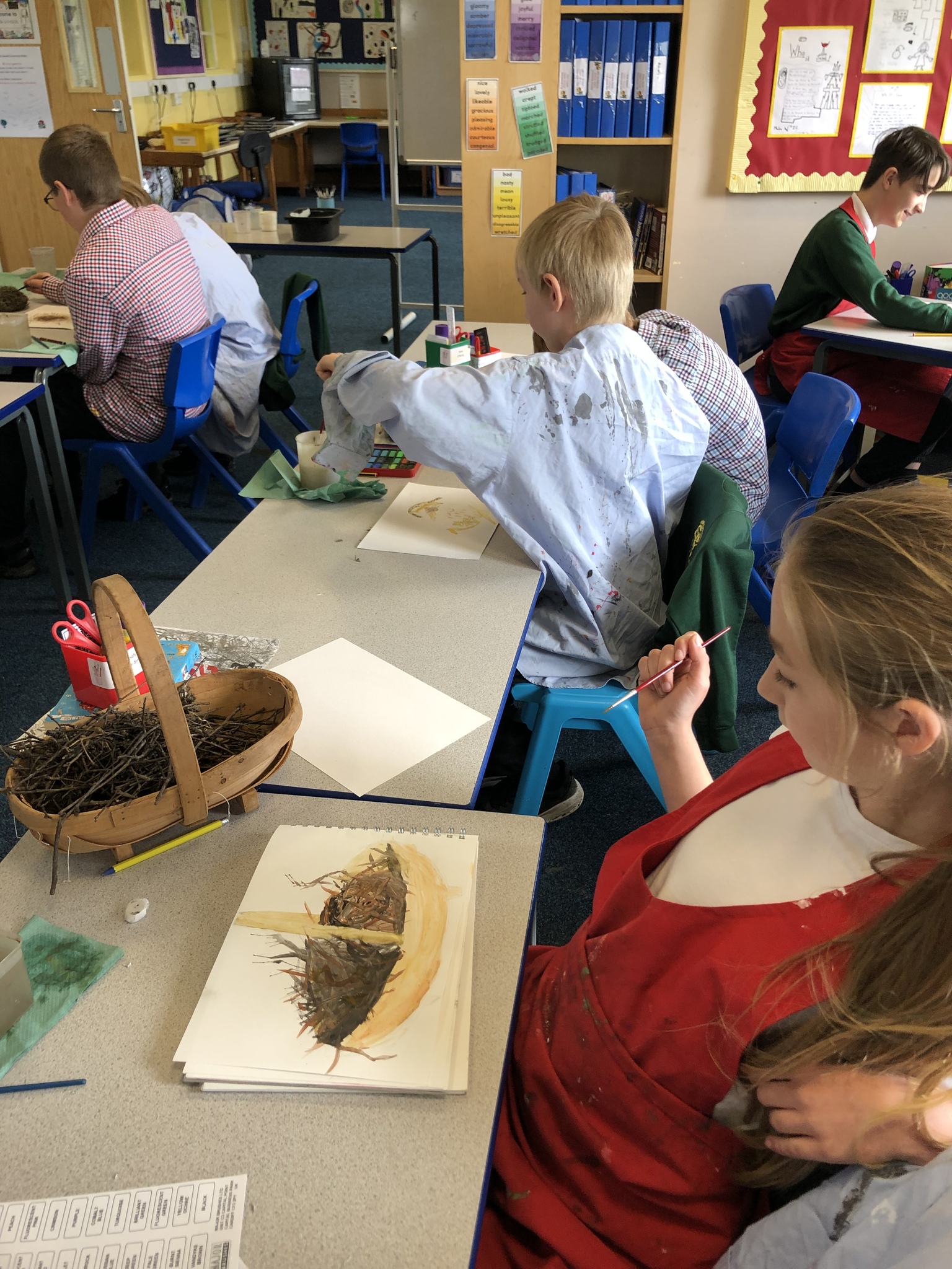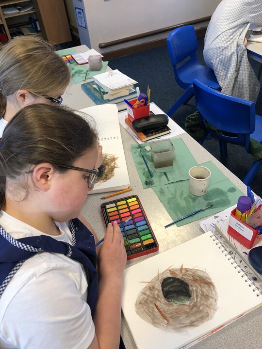 After studying the birds’ nests last week and producing charcoal and chalk drawings which focused on gaining depth with shading, the Upper School children used the new watercolour palettes to try and recreate paintings of the nests.