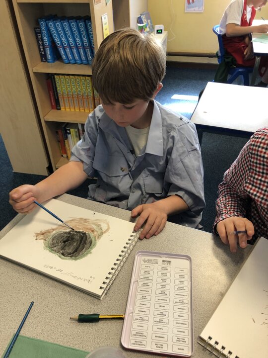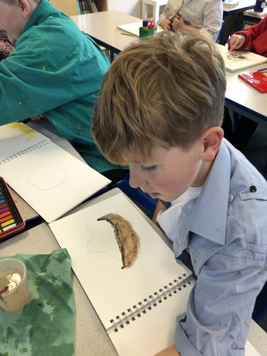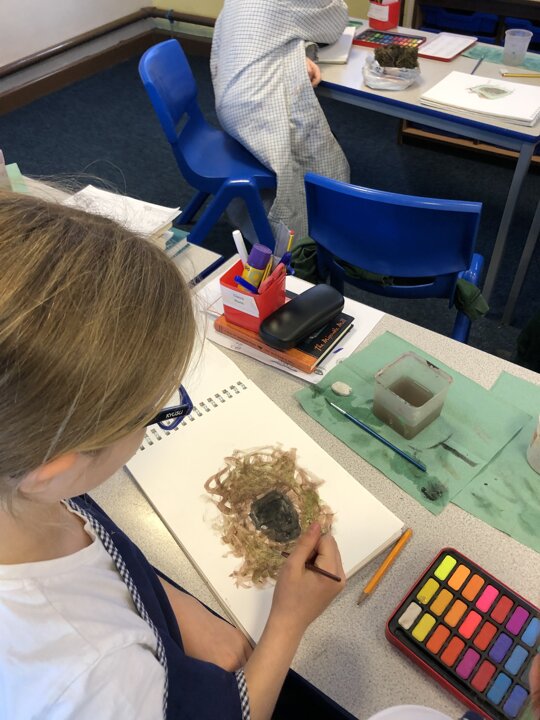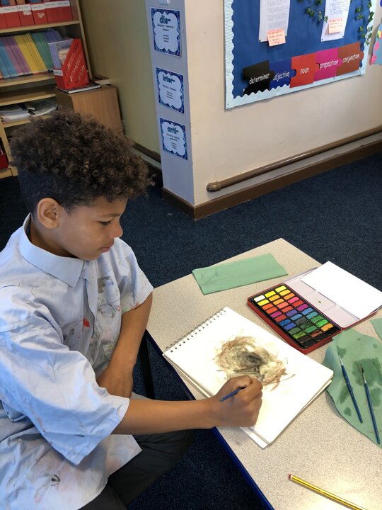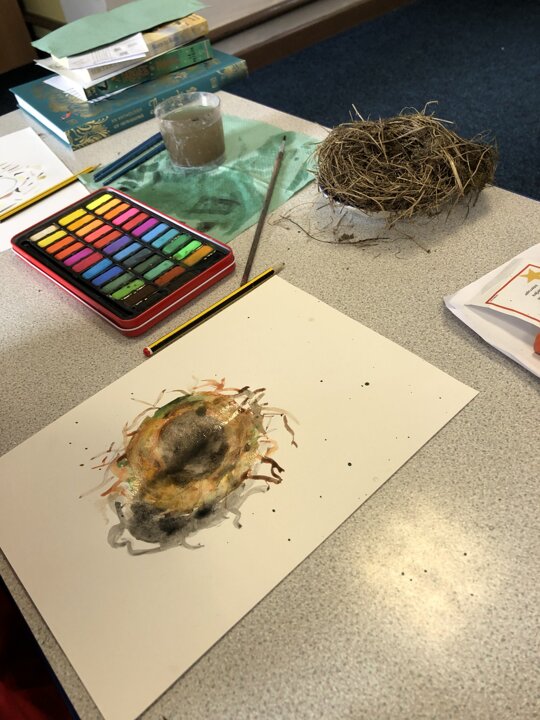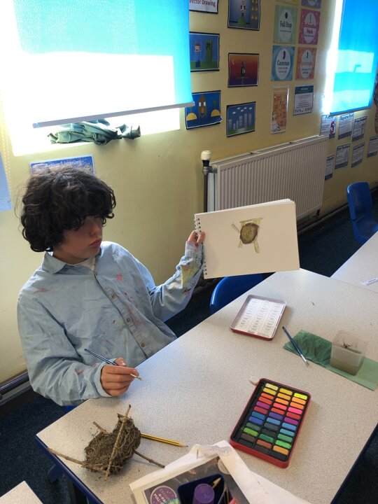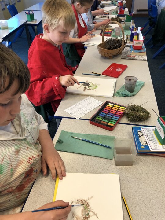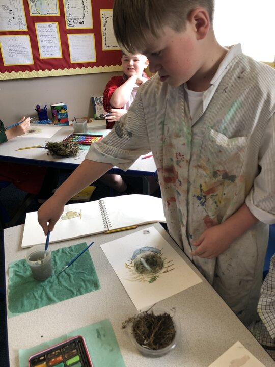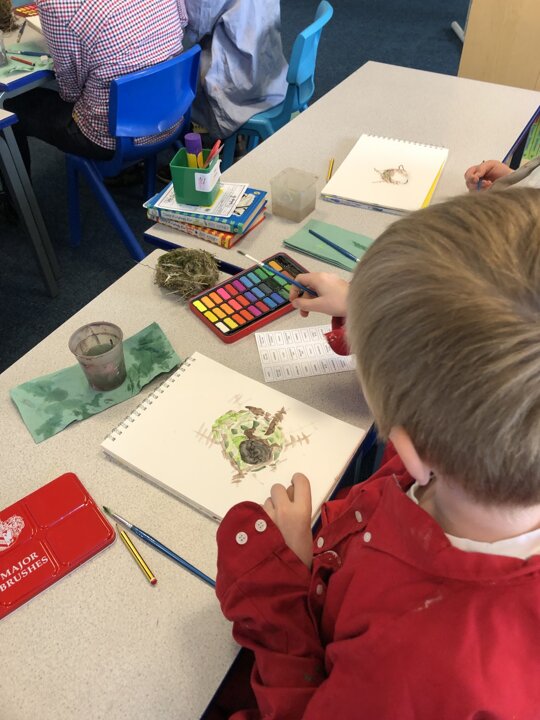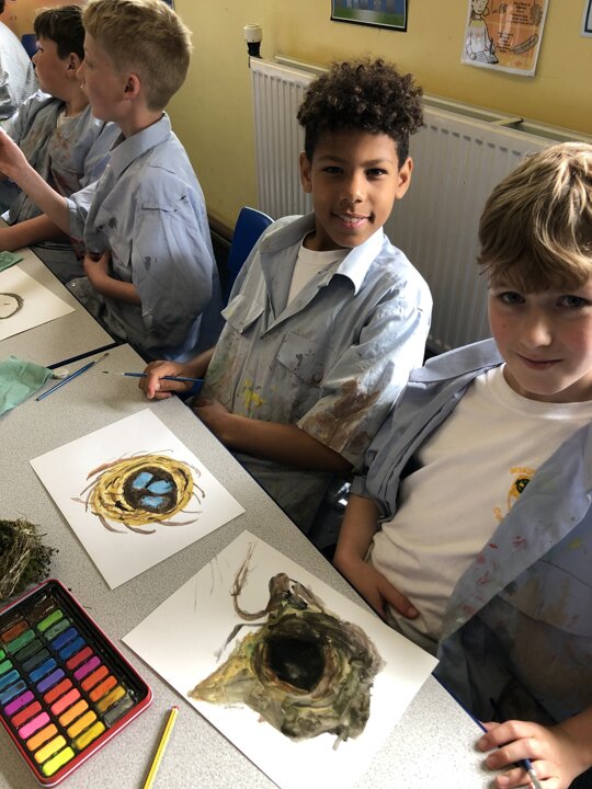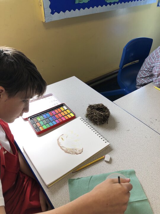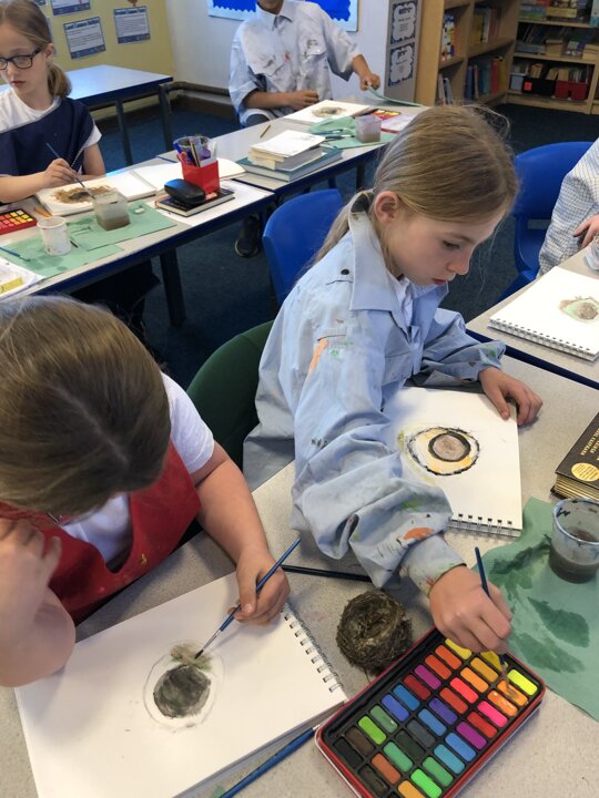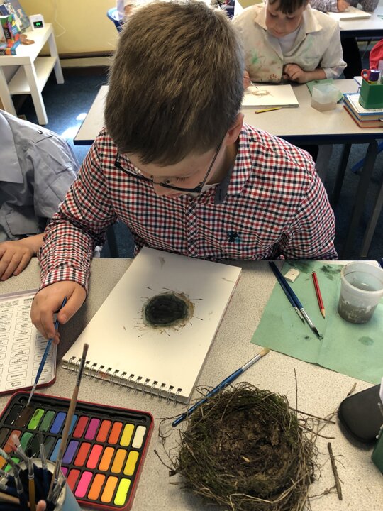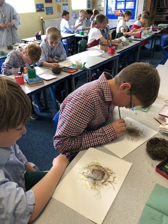 After studying the birds’ nests last week and producing charcoal and chalk drawings which focused on gaining depth with shading, the Upper School children used the new watercolour palettes to try and recreate paintings of the nests.