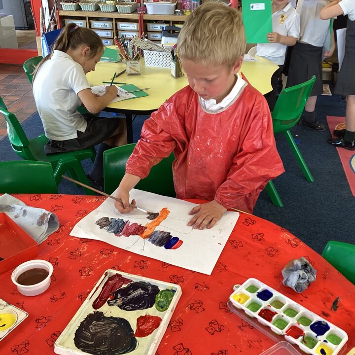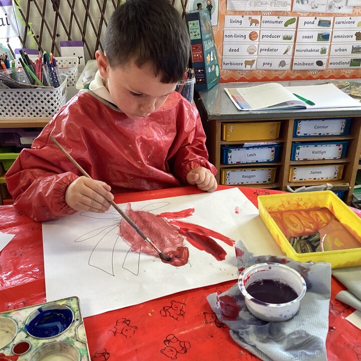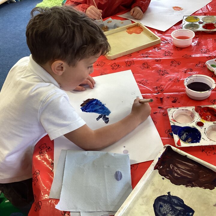 This week we have been continuing to learn about habitats. Our Reception children have been developing their understanding of the natural world taking part in the discussions and research with Year 1 and 2 about habitats. The Reception children have also been building on their prior learning of colour mixing paint and used their skills to create colours to paint a mini beast that they drew.