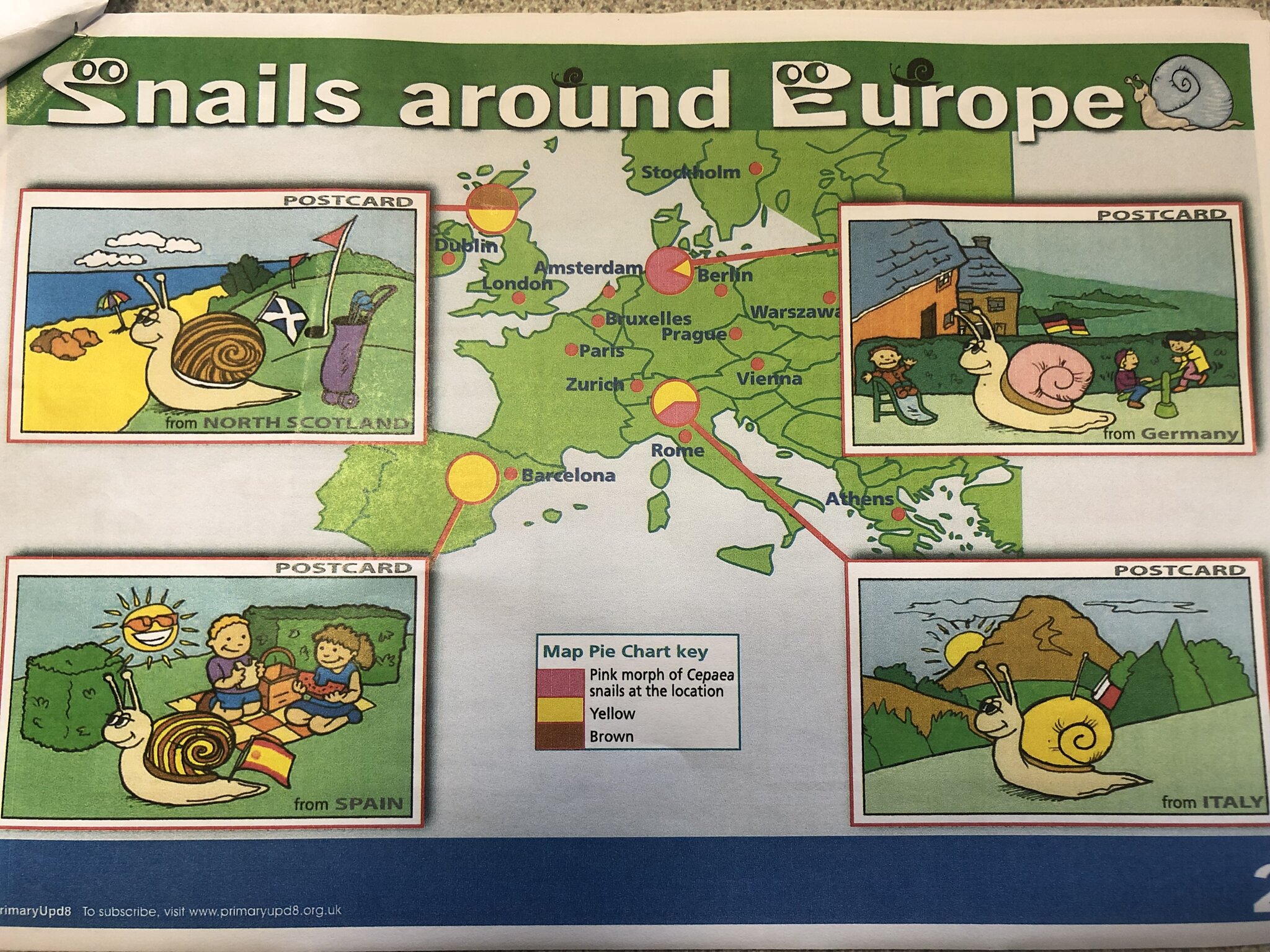 We then went outside into the grounds of school to record all the different types of Cepaea snails we could find. It was a very successful hunt and the results were also very interesting. The children mostly found Cepaea nemoralis snails (brown lipped) that had yellow or pink shells. These types of snails are usually found in hotter environments!