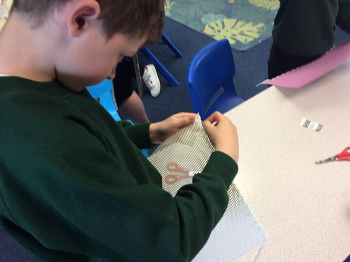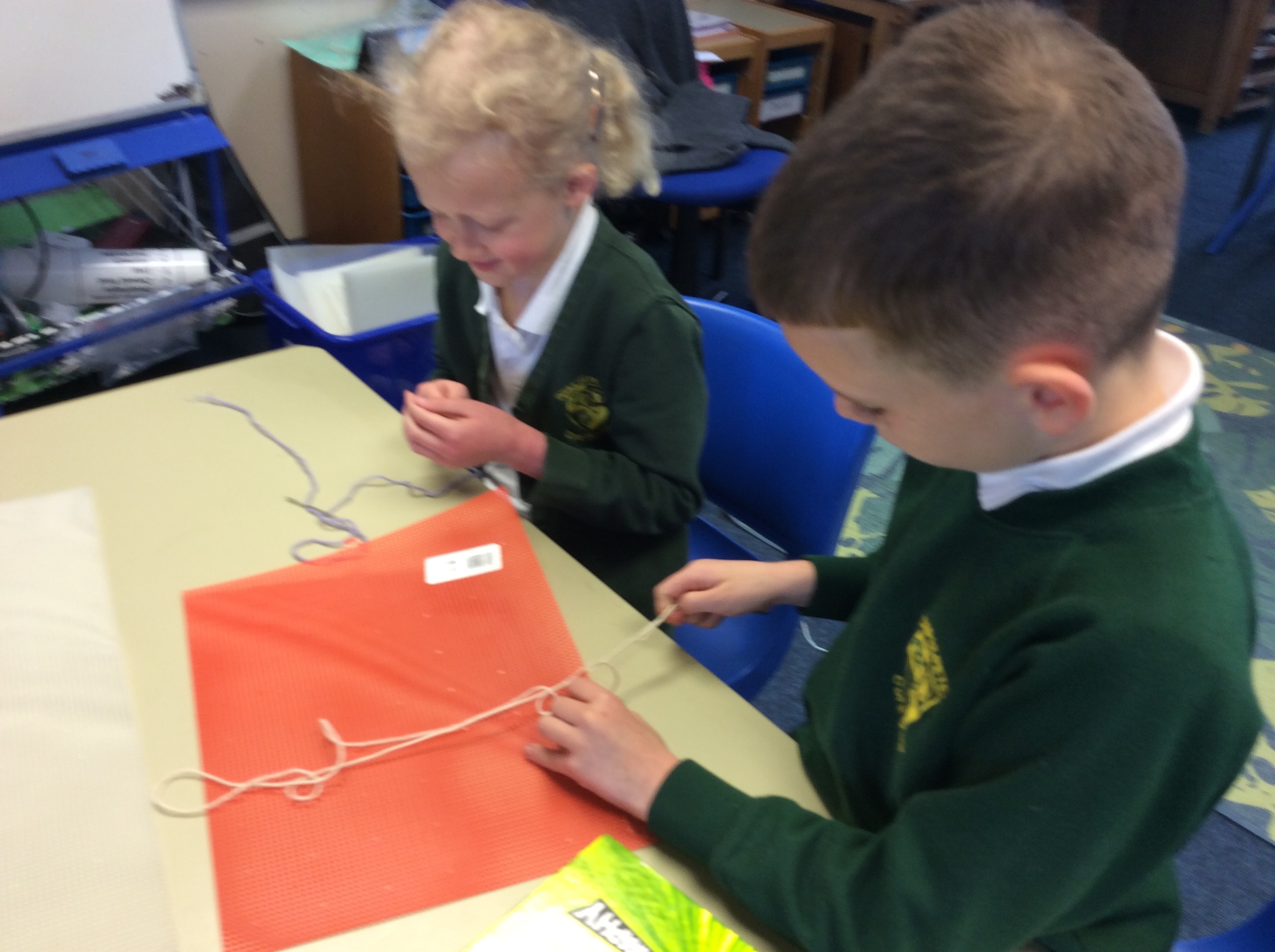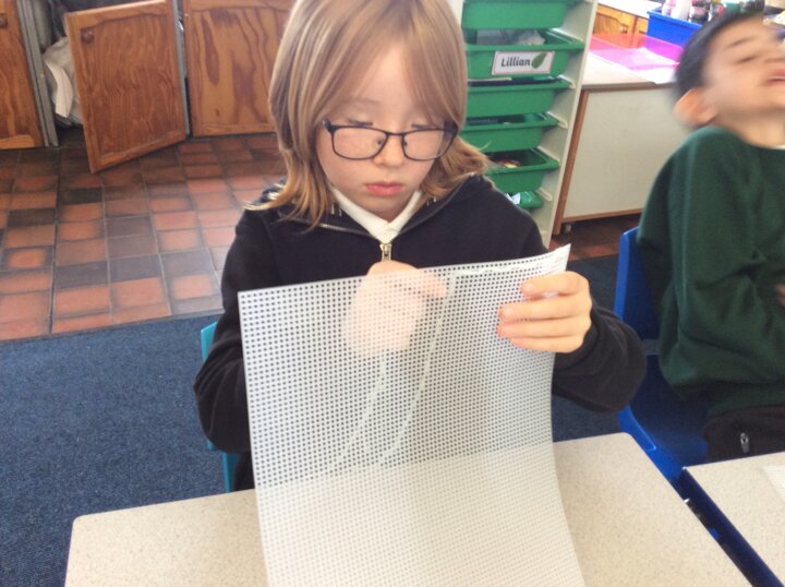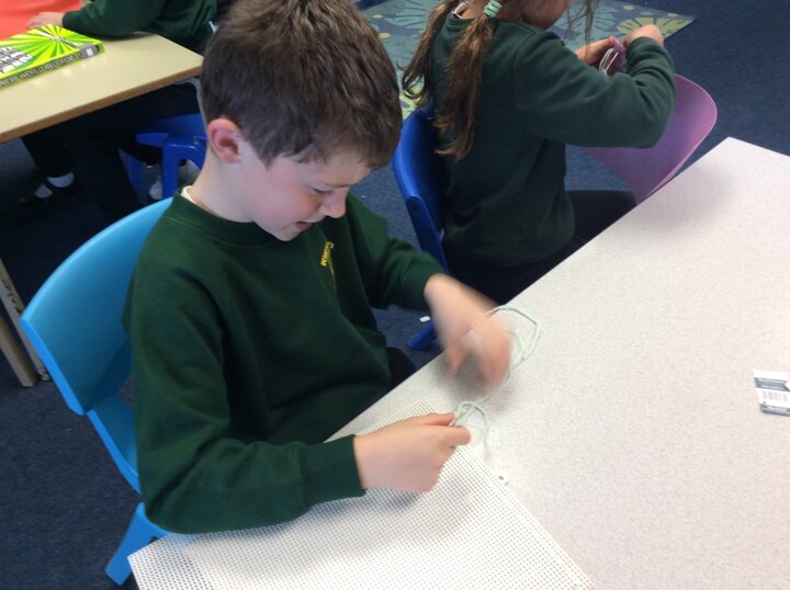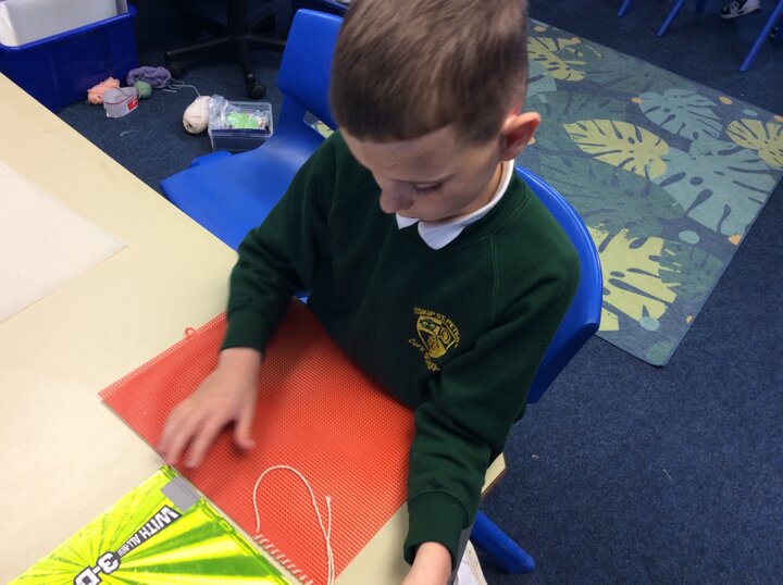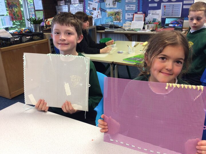 They used sewing boards and thread to create patterns and practice some of the stiches we may end up using for our projects.