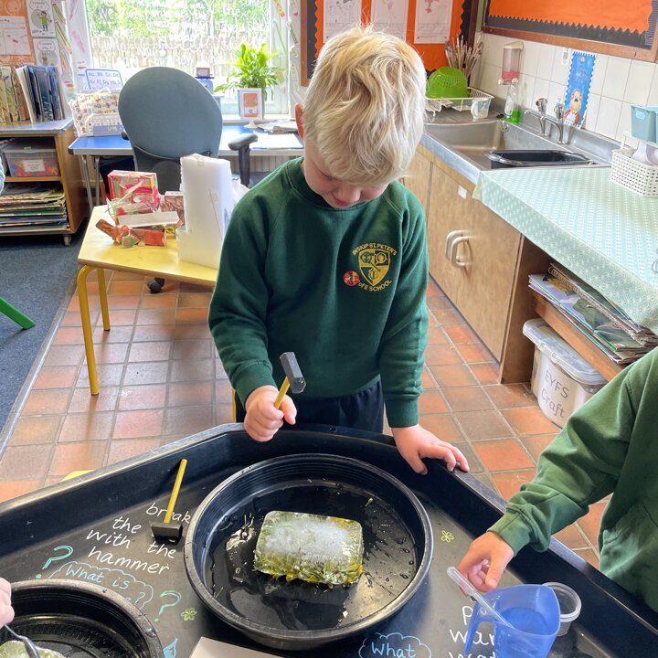 They used their senses and explored frozen water and how it changes state when salt or warm water are added. They learnt that the warm water had the greatest effect on the ice dissolving it the quickest although I’m pretty sure most found hitting the ice with the hammers the most fun!
