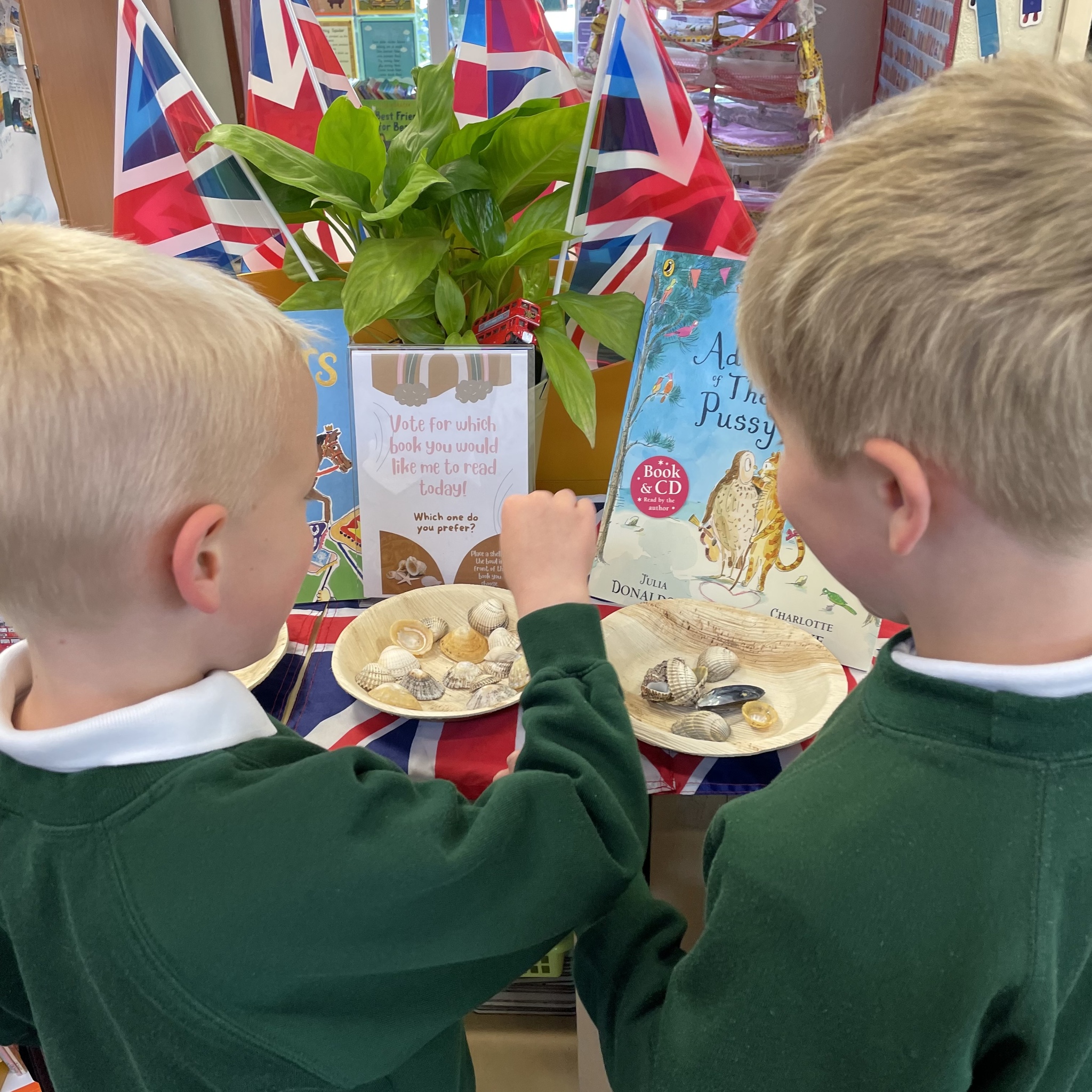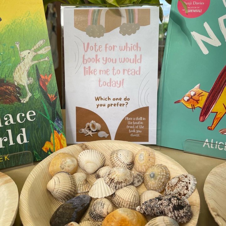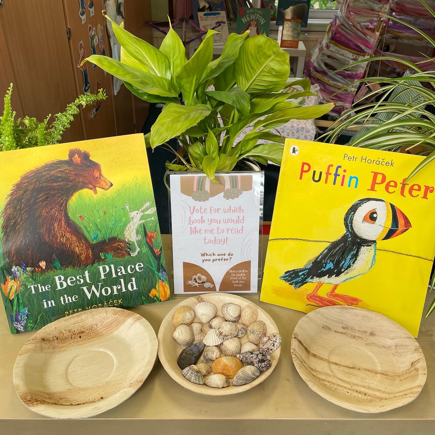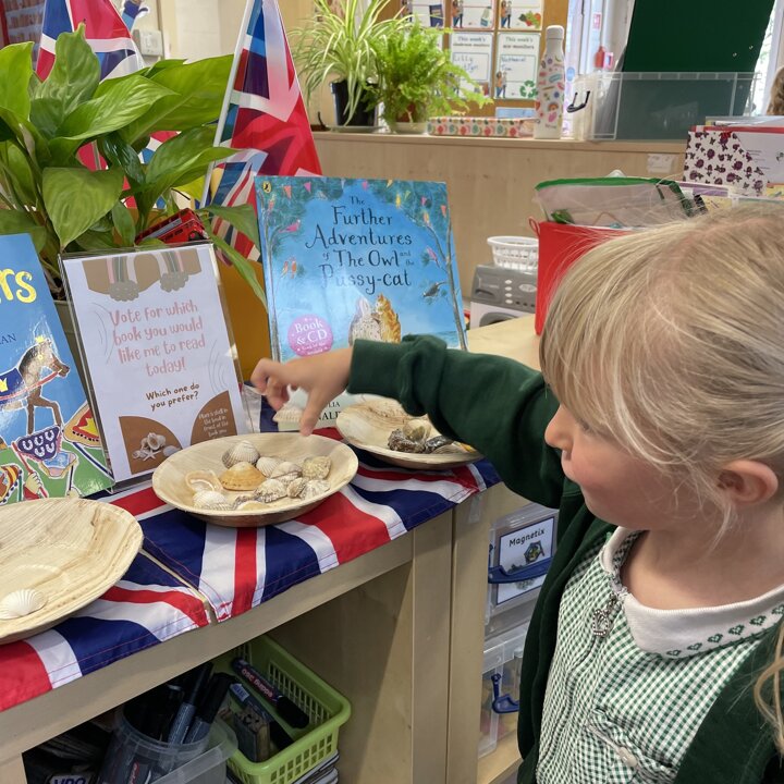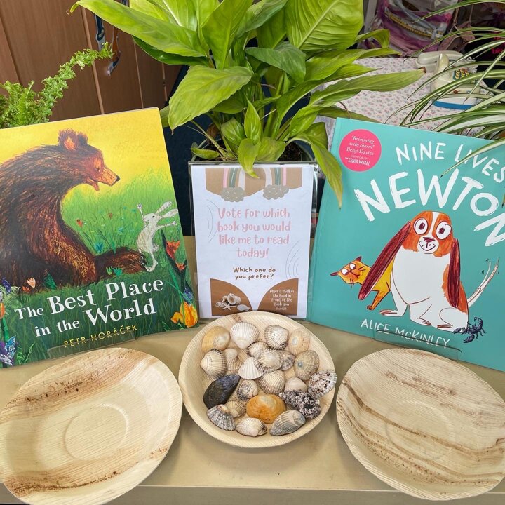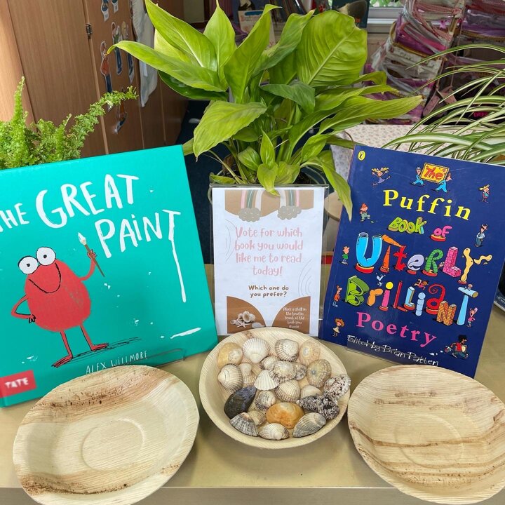 In Lower School the children have the opportunity to vote for the book they would like me to read to them every day. Each morning they come into school and look at the choices then place a shell in the bowl in front of the book they would prefer.