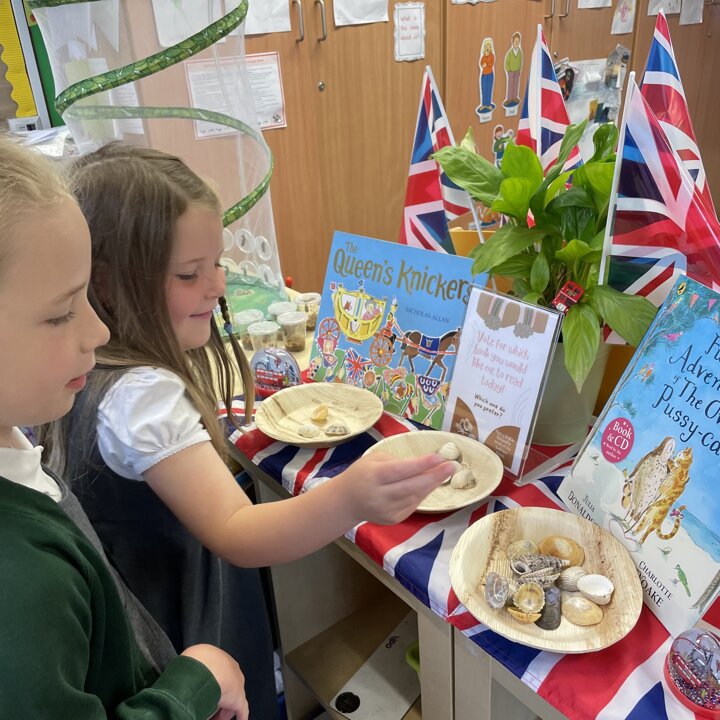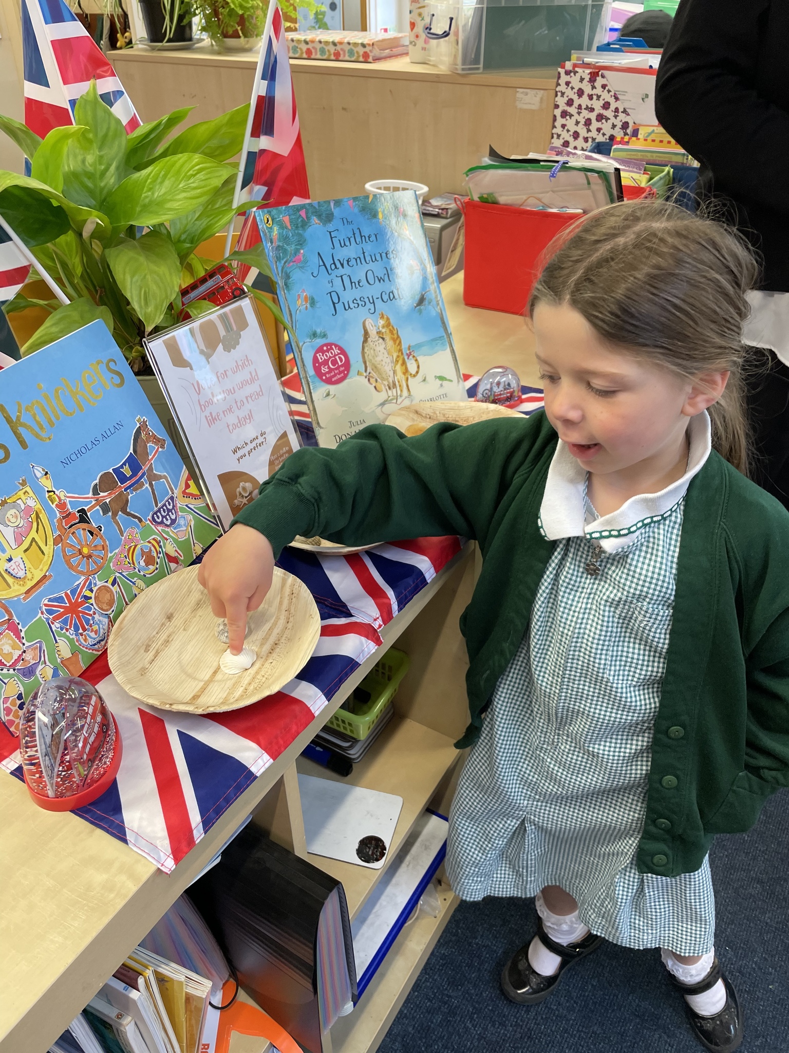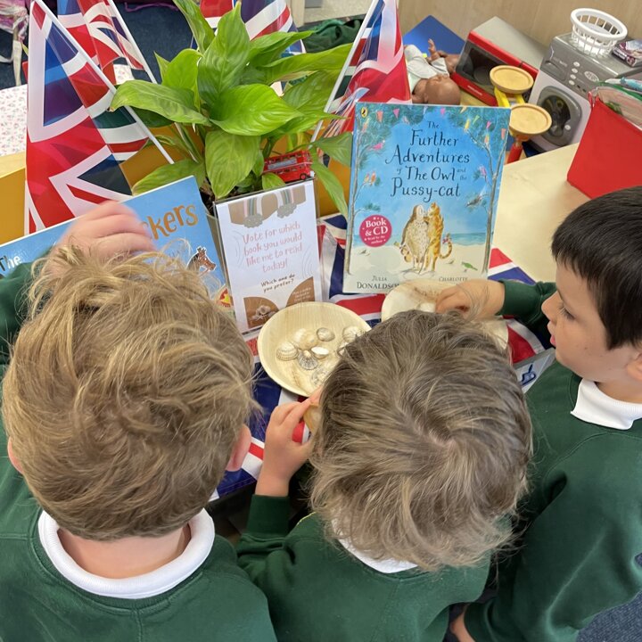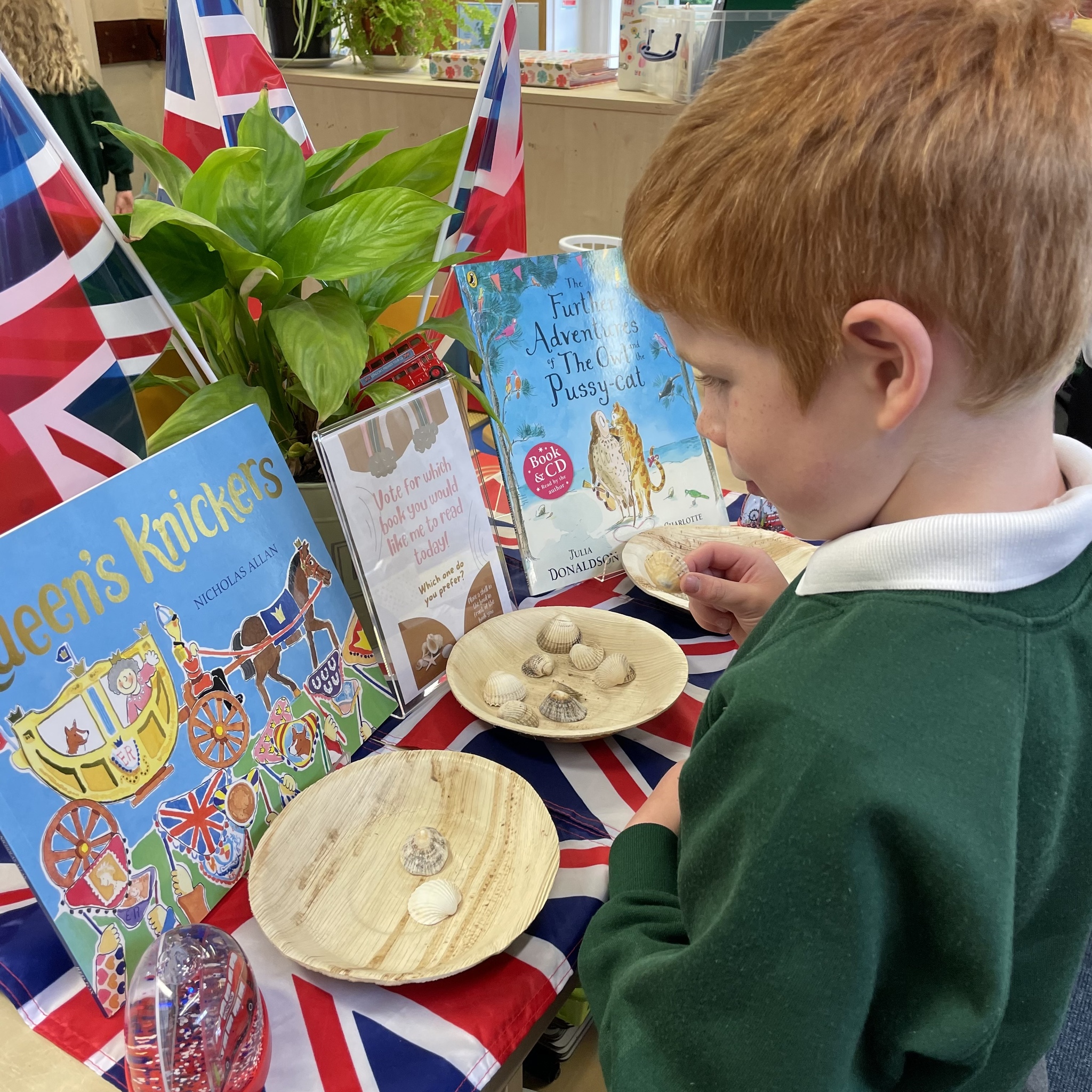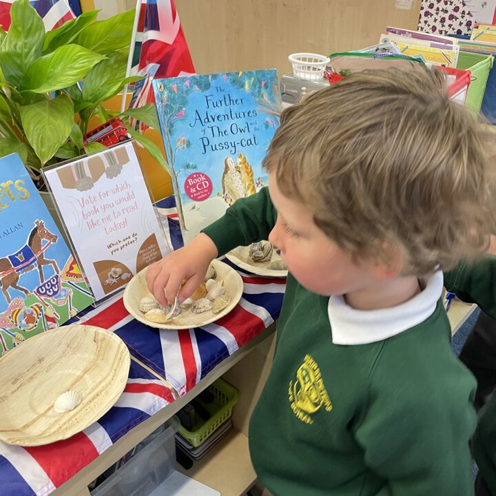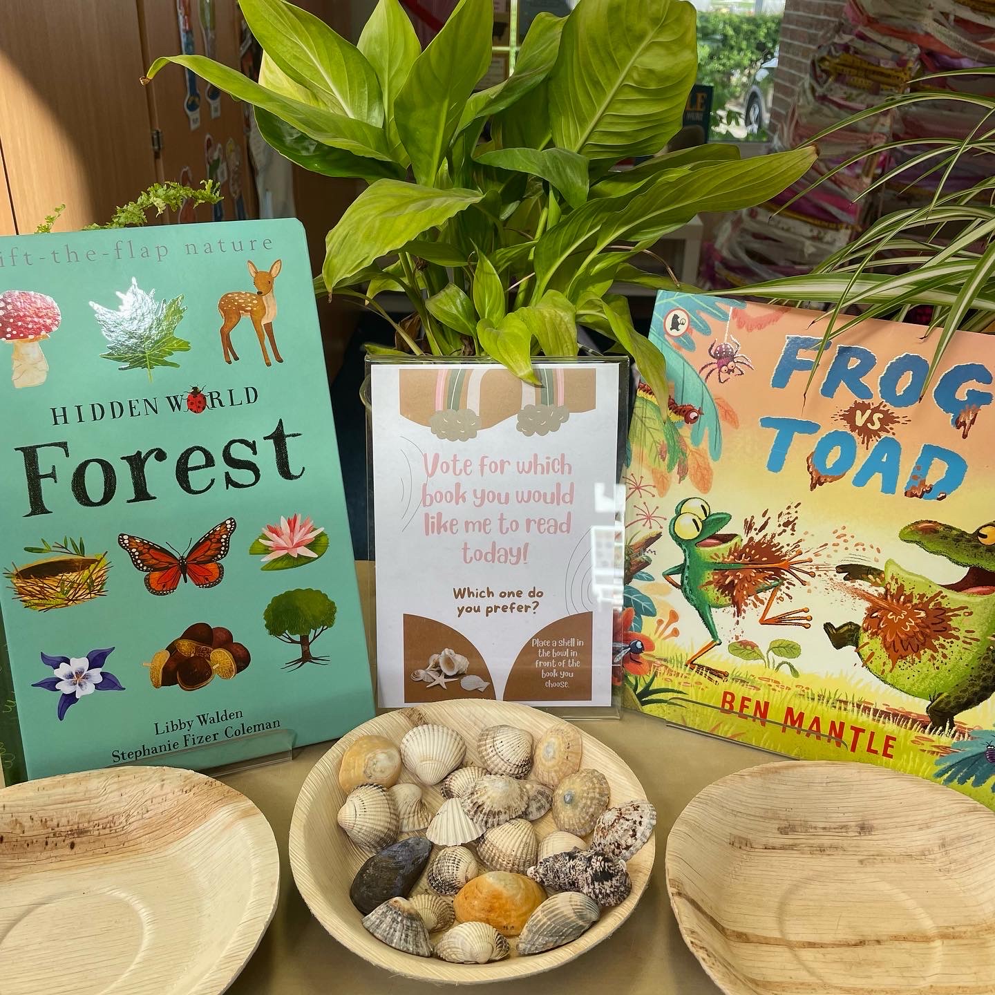 In Lower School the children have the opportunity to vote for the book they would like me to read to them every day. Each morning they come into school and look at the choices then place a shell in the bowl in front of the book they would prefer.