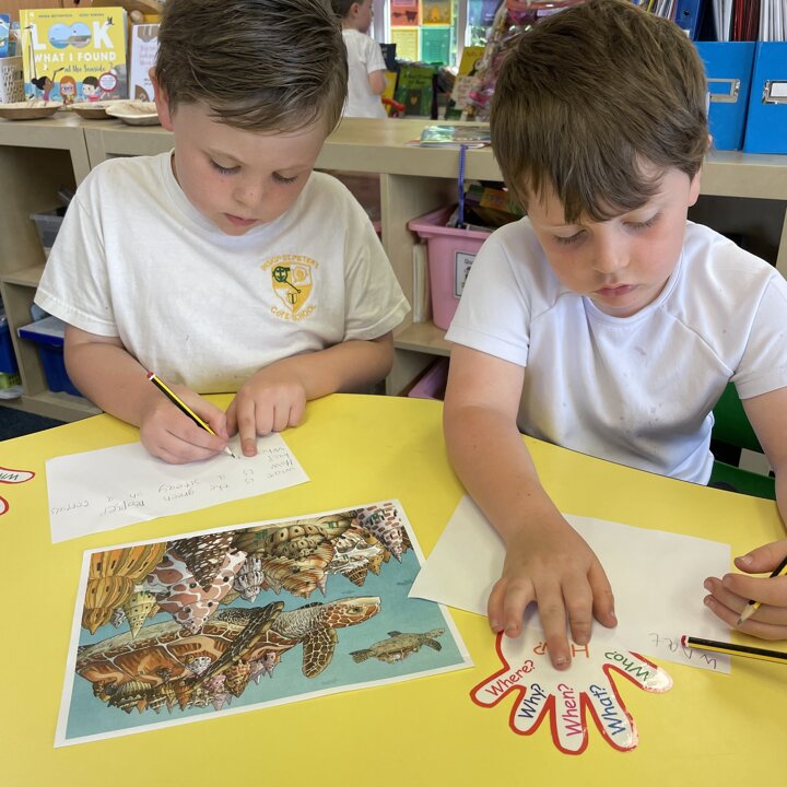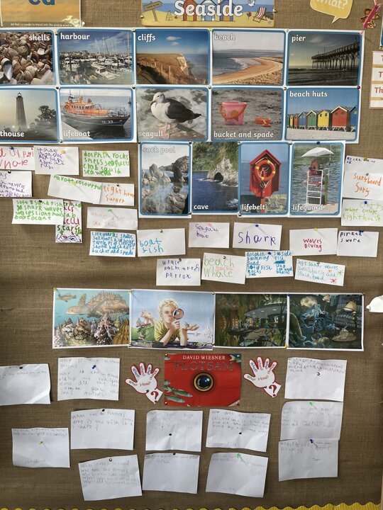 We have begun our new theme for the half term which is called Buckets and Spades. As part of our English learning we are going to write our own stories set at the seaside. So, this week we have been getting ideas by reading lots of different fiction and non-fiction books with a seaside theme. The children have collected vocabulary and put it on the working wall to use over the next few weeks.
