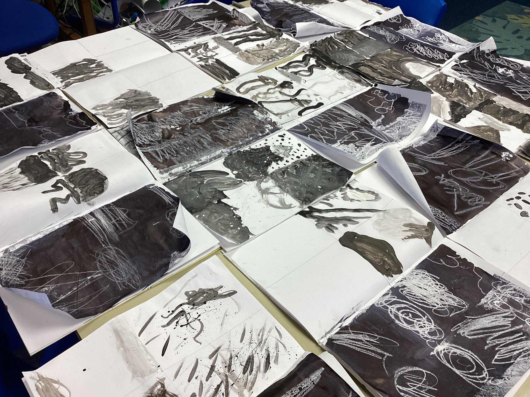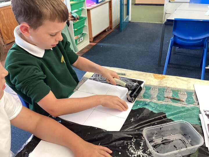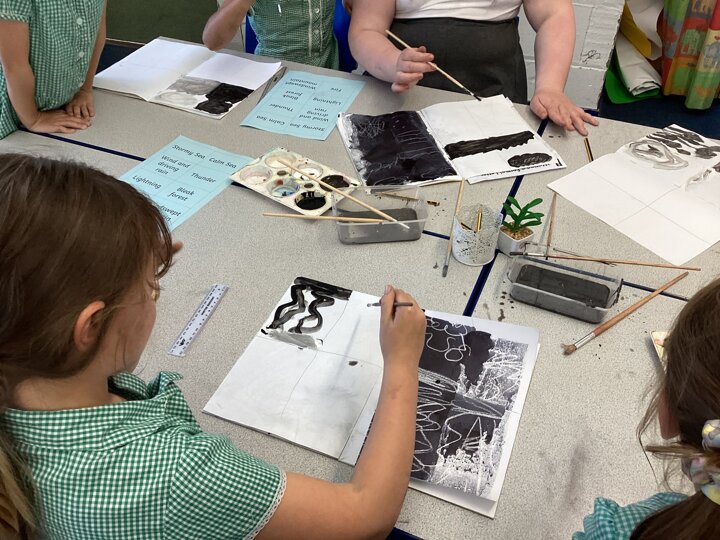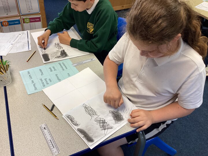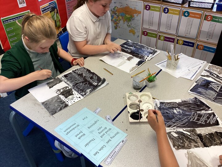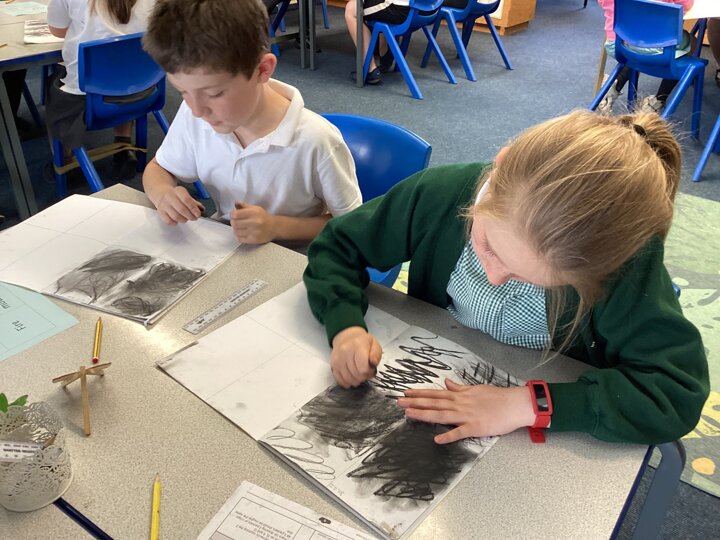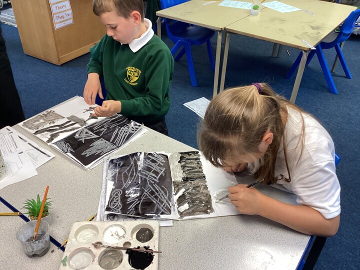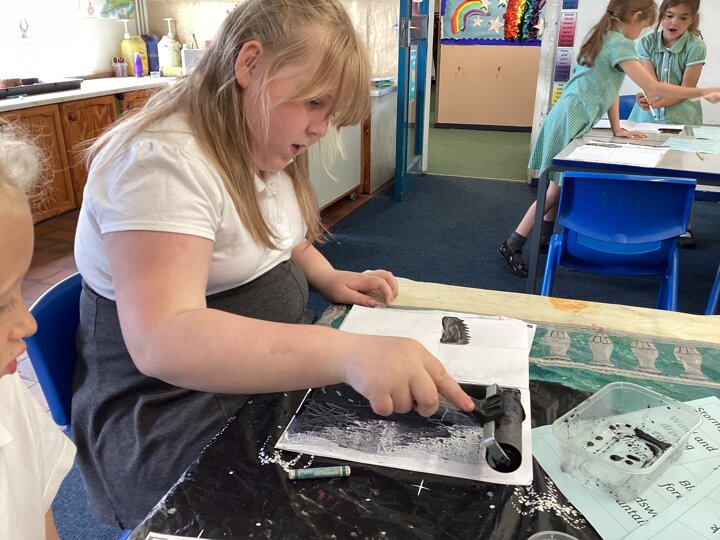 Children have so far enjoyed many artistic techniques including ink rolling, painting and scraffito inspired pages. They have been focusing on the texture and emotion behind pictures as well as how we can turn words into images.