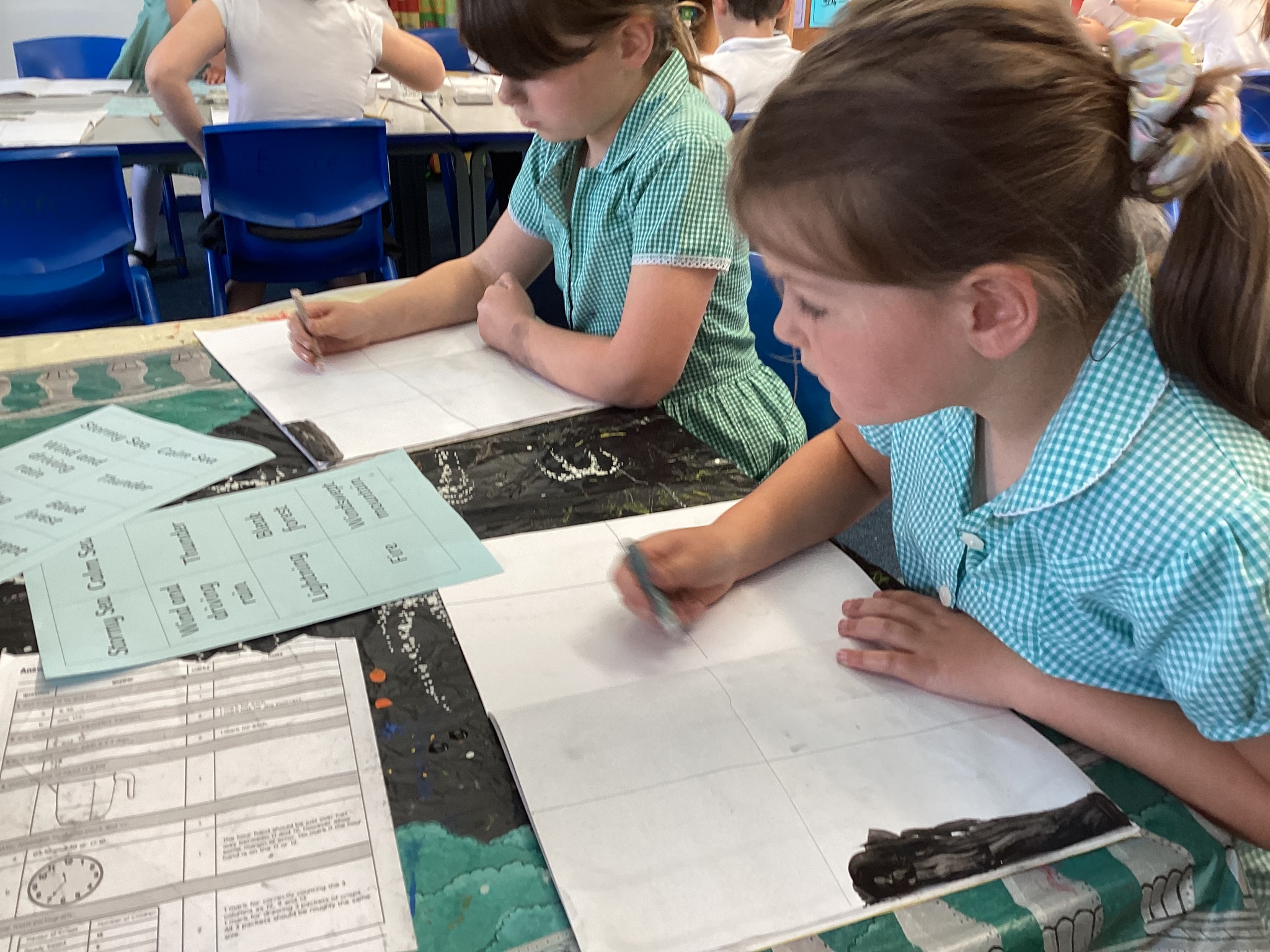 We have been using a fast, scribbling, expressive art style using monochrome colours to capture the essence of the poem.