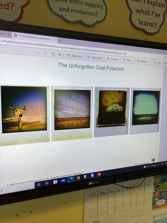 Today the children were introduced to their new novel ‘The Unforgotten Coat’ by exploring the strange coat that was hung up in the classroom last week. They discussed the facts they knew about the coat such as its colour, type of coat and heaviness. Abigail then discovered some Polaroid pictures in one of the pockets! This was exciting for the class as it generated lots of discussion about where the pictures were taken and by whom. They then went on to write about what they thought and the evidence they could use to back up their ideas. They used a range of conjunction words to write these sentences including the use of commas to show subordinate clauses at the start of the sentences.