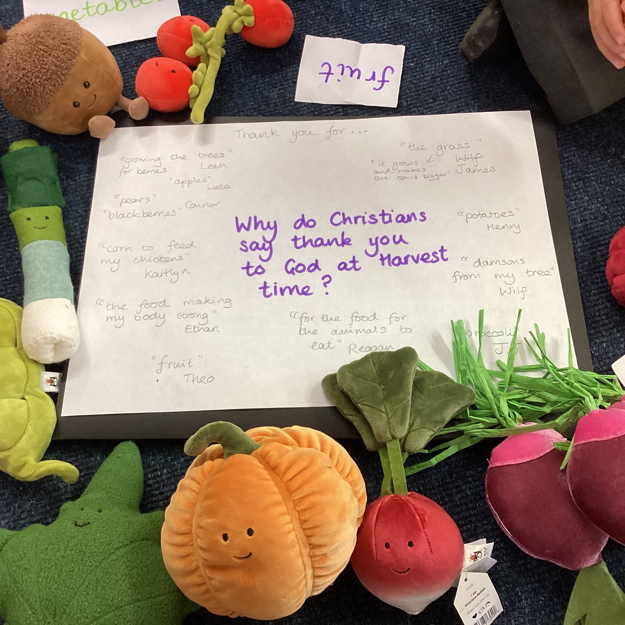 Following our previous learning where we explored the question ‘Why is it important to say thank you?’ This week in our RE lesson we asked ourselves ‘Why do Christians say thank you to God at Harvest time?’.