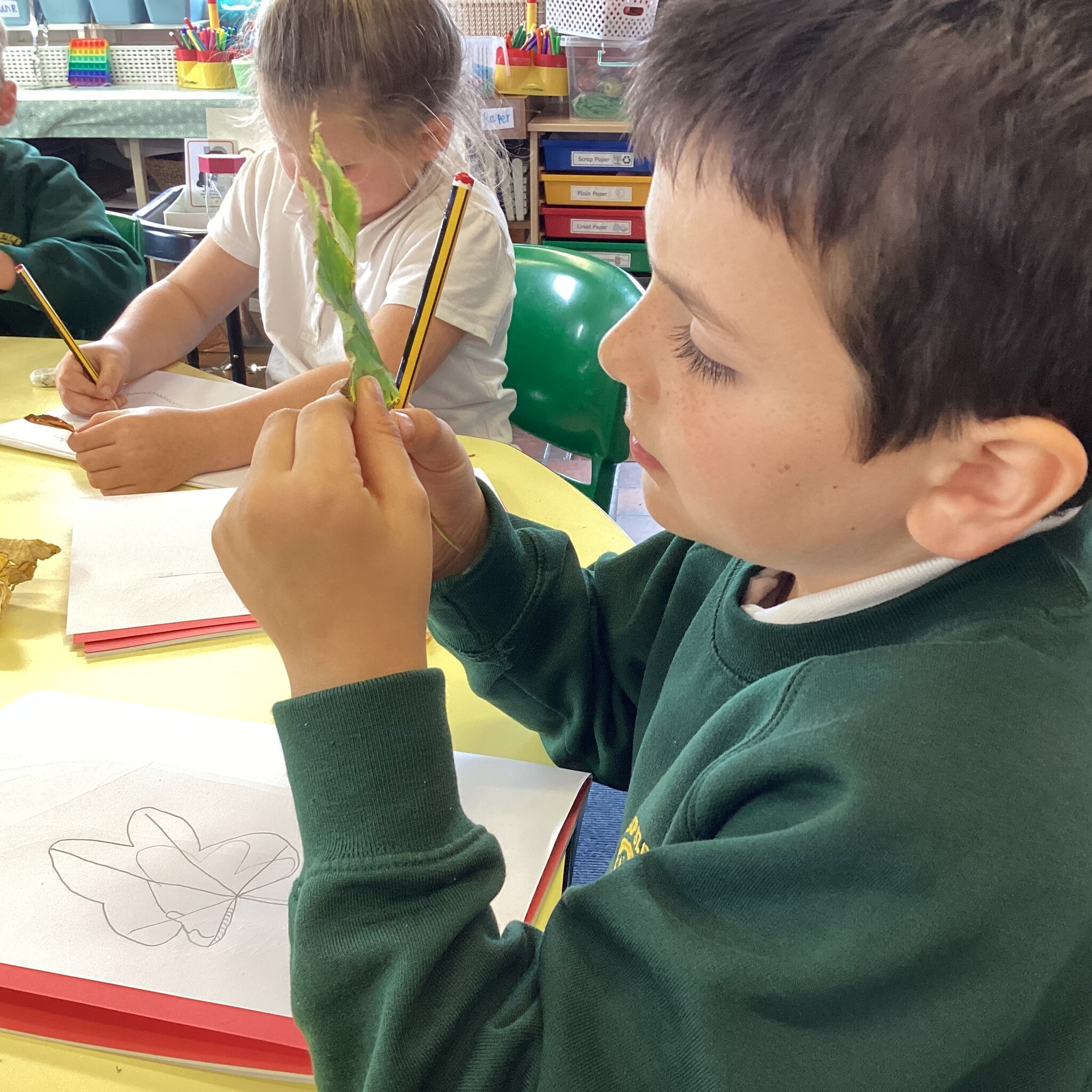 Using a variety of leaves we collected the children have been drawing in their sketchbooks. They used careful looking to practise observational drawing and held the leaves to make their drawing focused on the way the leaves felt.