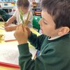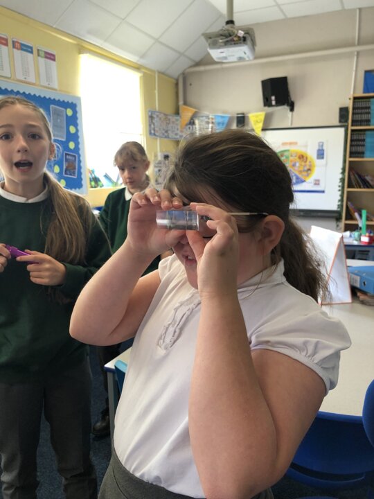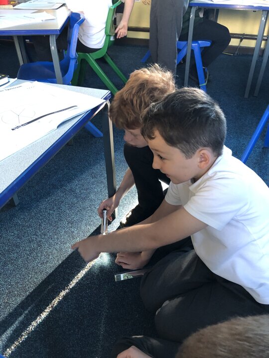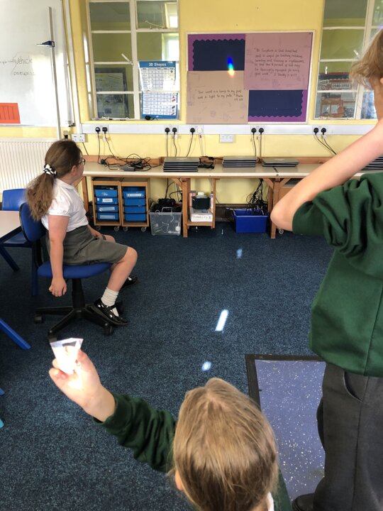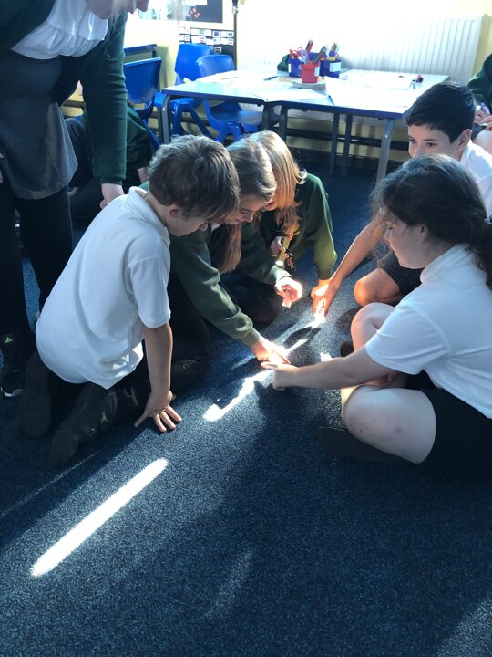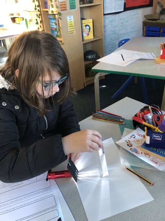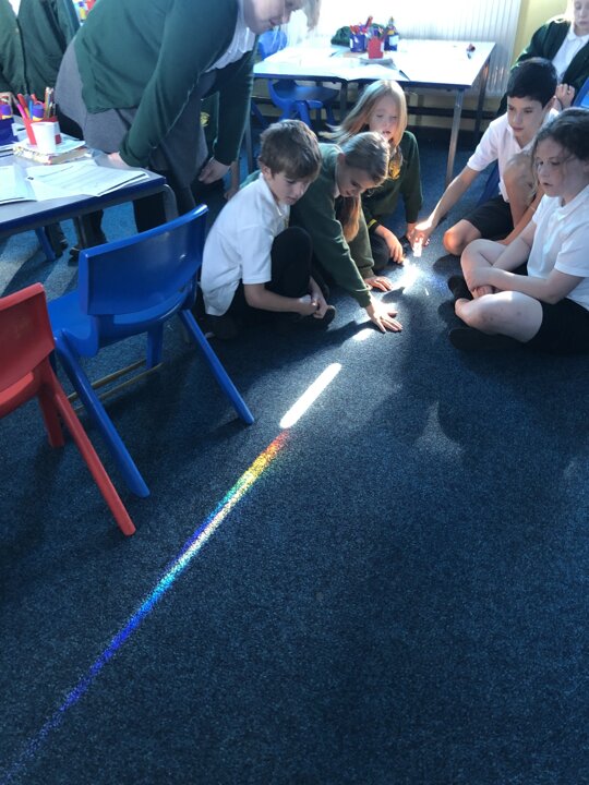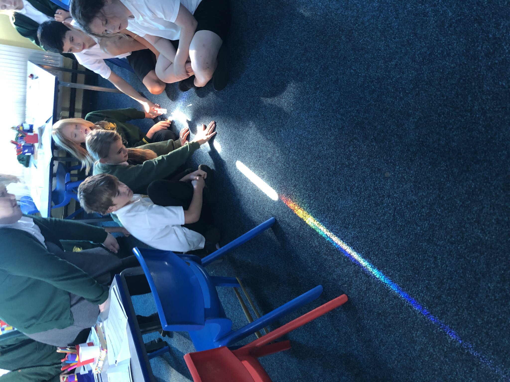 The children explored this through the refraction of sunlight or torchlight through a prism. The results were spectacular! Leo managed to split the sunlight coming through the classroom window with his prism into a lovely spectrum of colours! Some of the other children could see the light being split by looking closely through the prism with their eyes and others used a torch and white paper to do it.