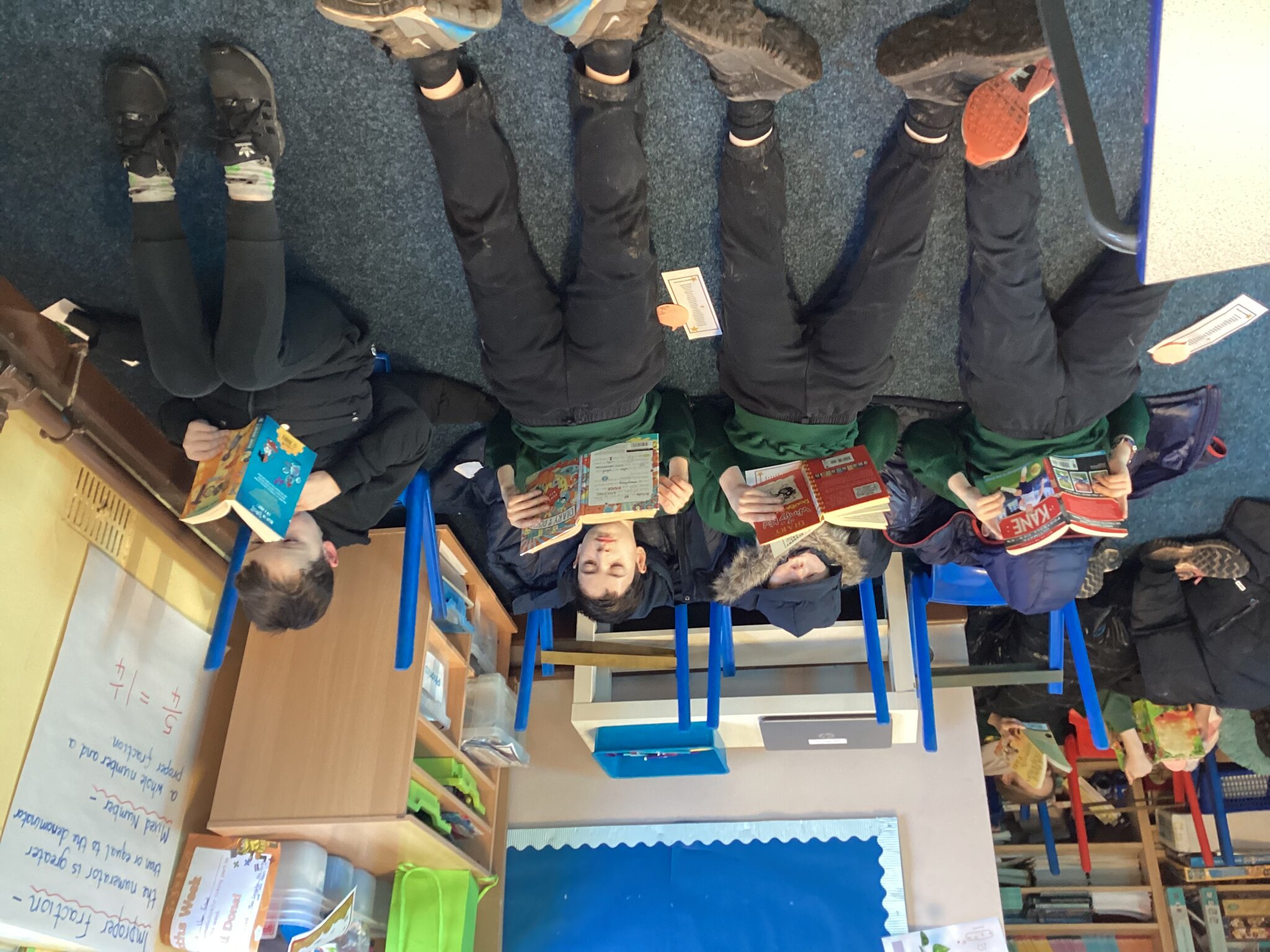 We have also introduced a new flexible seating environment where children safely upturn their chairs and use the slant, coats, pillows, blankets to feel a little more comfortable for reading. Upper School now love our dedicated, chilled out reading time now!