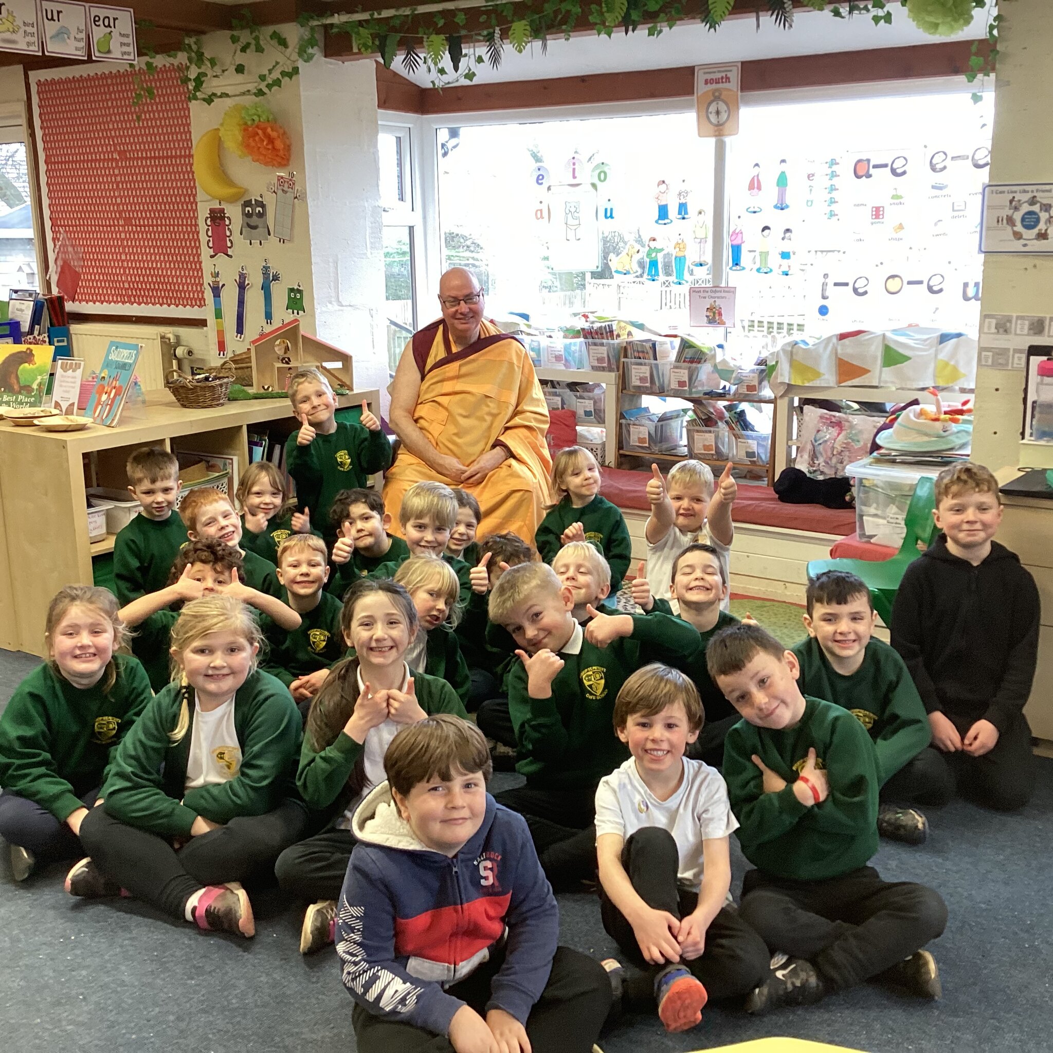 Today we learnt about Buddhism when we had a visit from Pagpa a Buddhist monk. Pagpa explained what Buddhism is and how he has lived his life as a monk for the last 27 years, it was very interesting. Pagpa explained the significance of his clothes to us, the maroon coloured skirt is called a Shemdap as as he puts it on each day it reminds him to be a good person. The maroon coloured piece of material he wears across his arm is called a Zhen and symbolises compassion. The yellow material is called a Chogyu and the colour symbolises wisdom. It symbolises a wise person and is worn by those who teach. Pagpa teaches meditation to others to help them live peacefully and be happy.