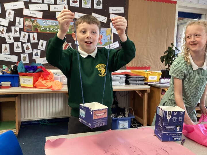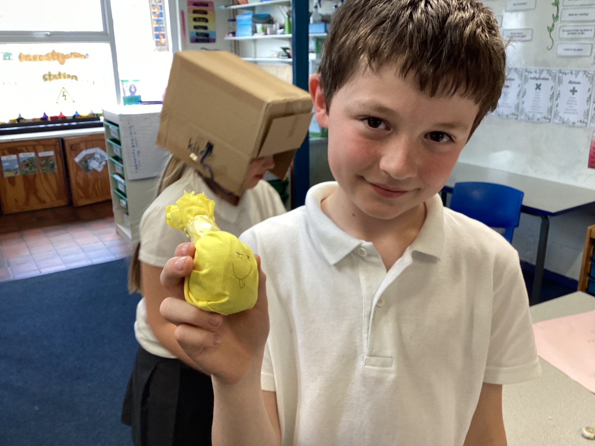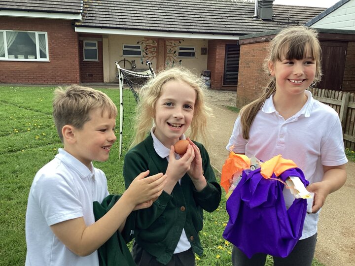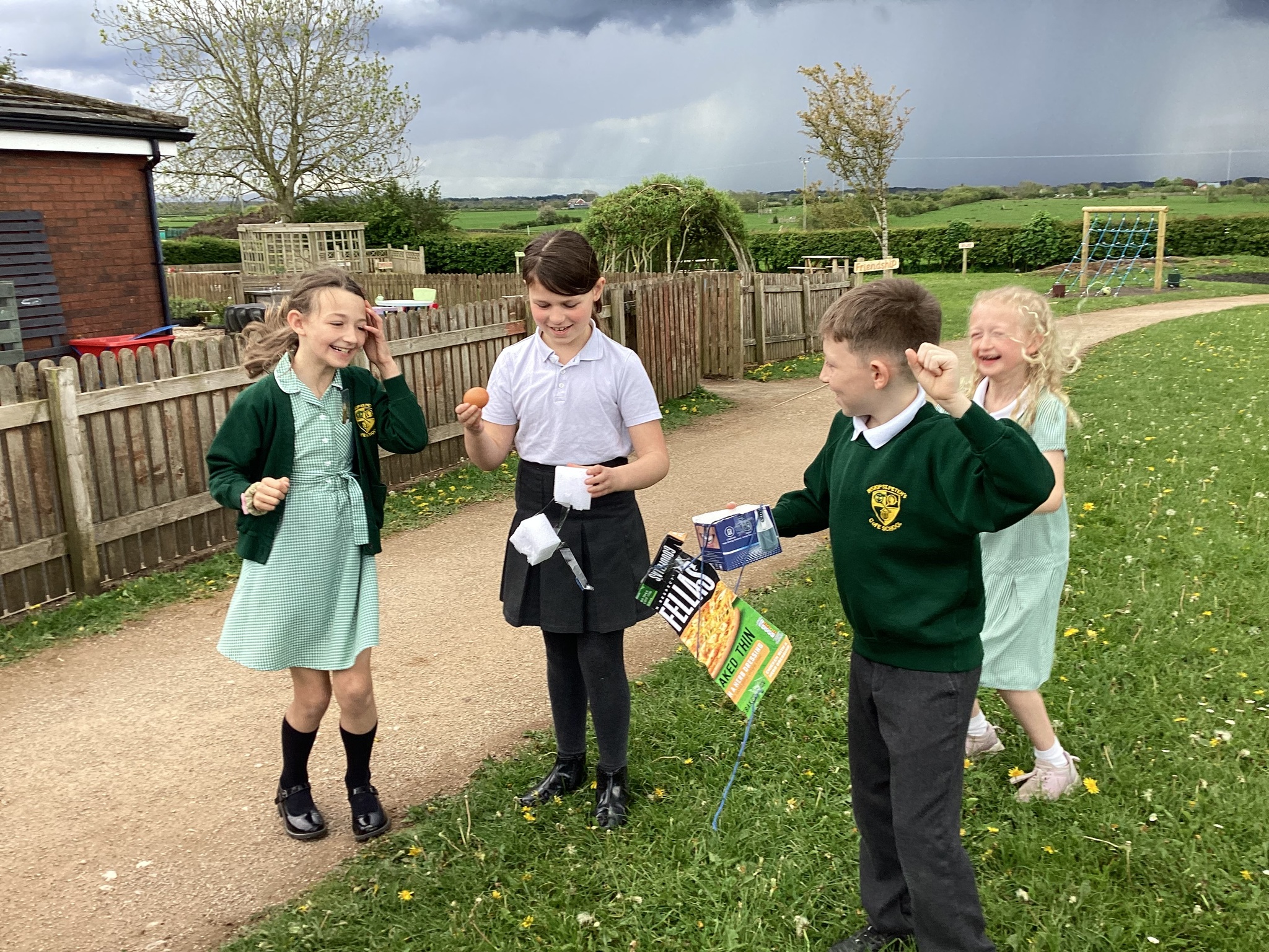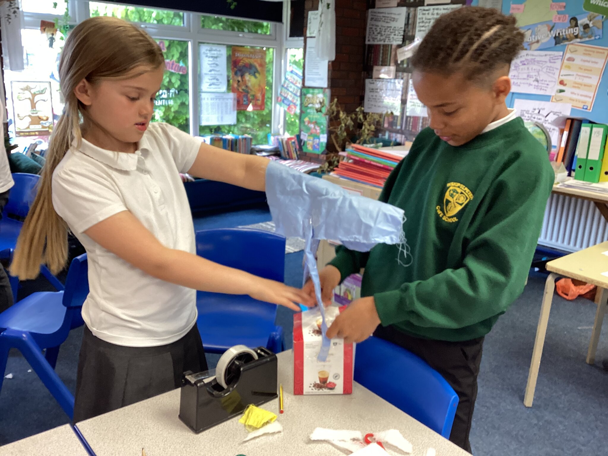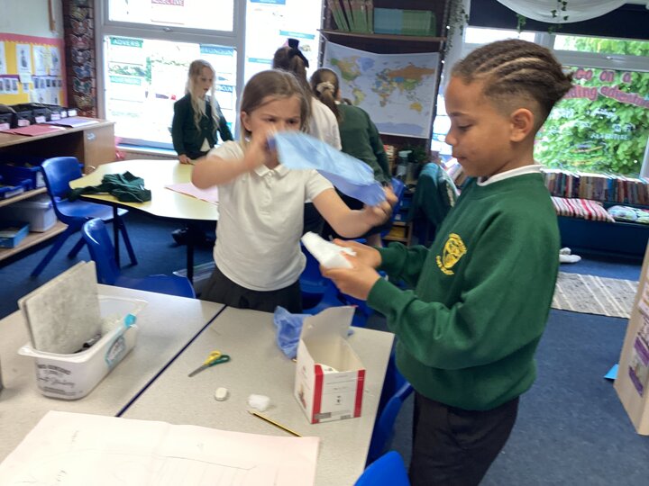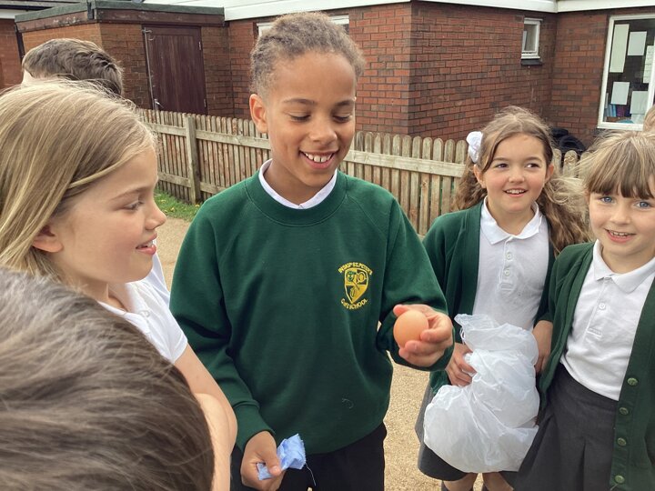 Children used their science knowledge of air resistance and drag to help them create a design that would slow down their egg before it hit the ground. Children also used their DT knowledge of construction to assure that the egg had a good structure to sit inside that would protect them.