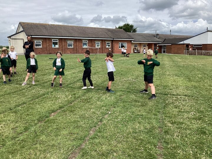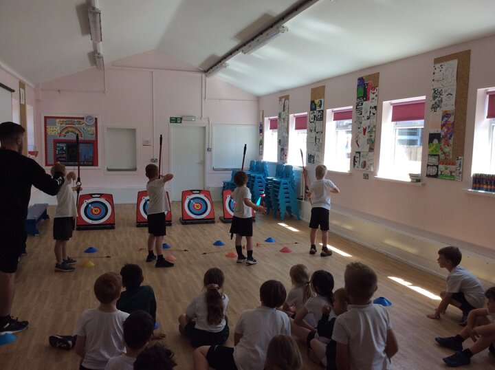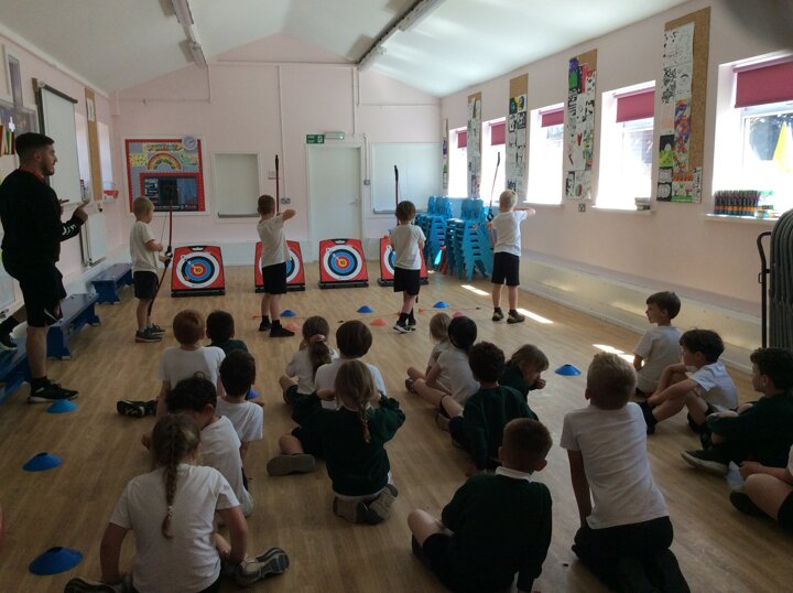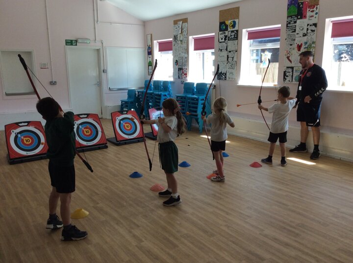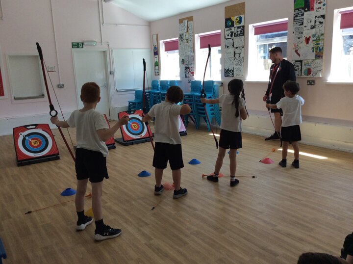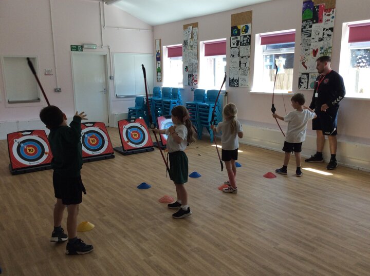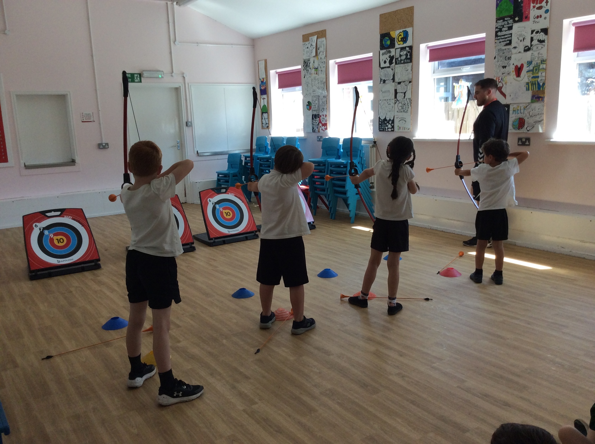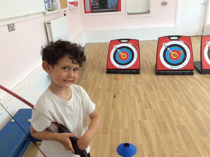 We have been learning how to work together in a relay race, how to hold a bow to aim at an archery target and how to move whilst balancing an object.