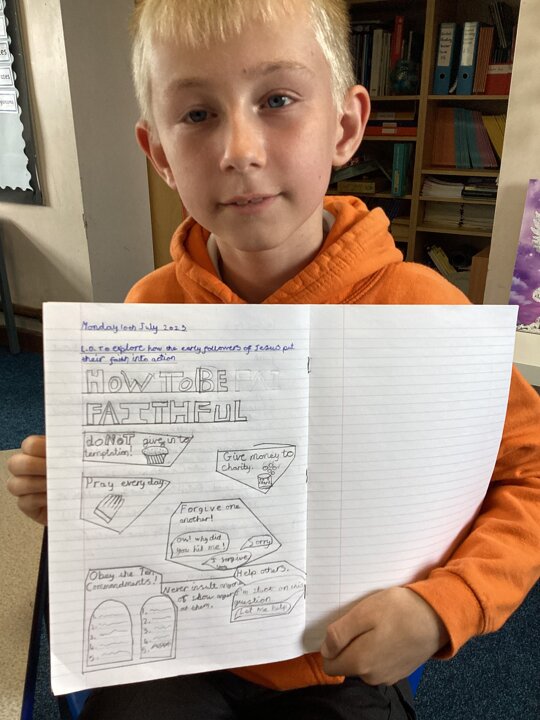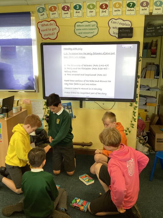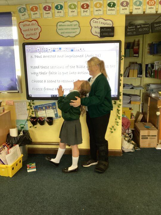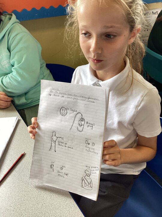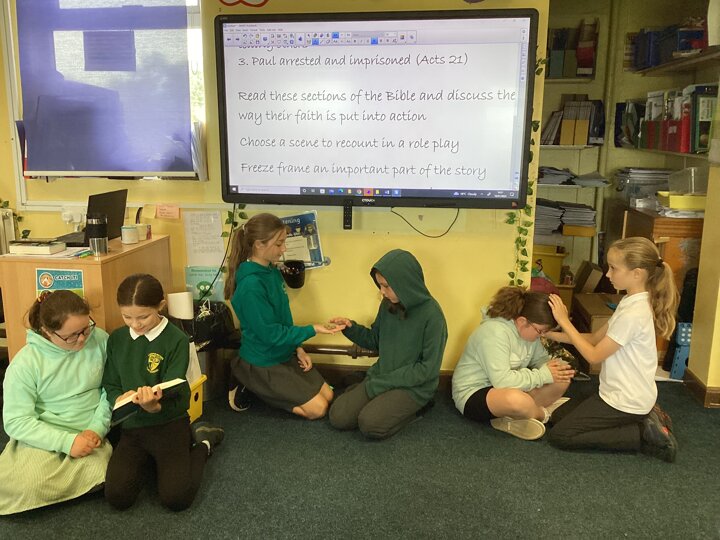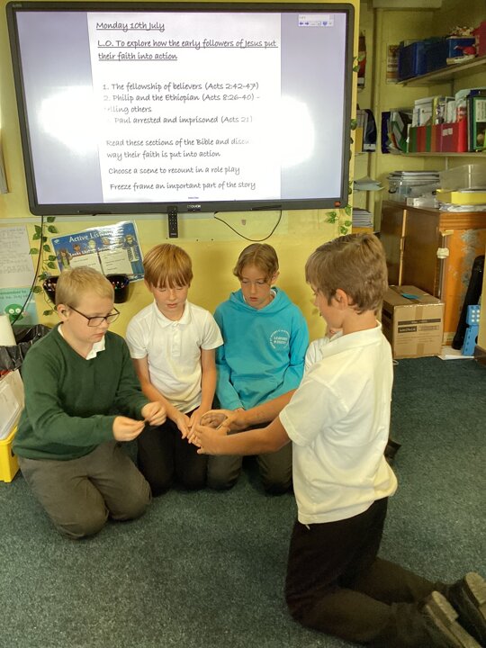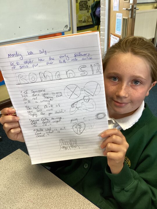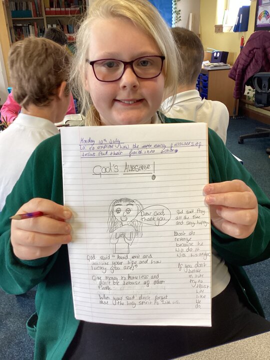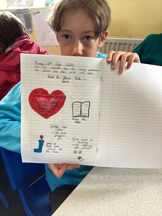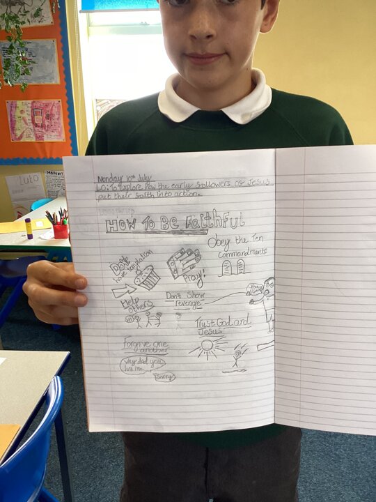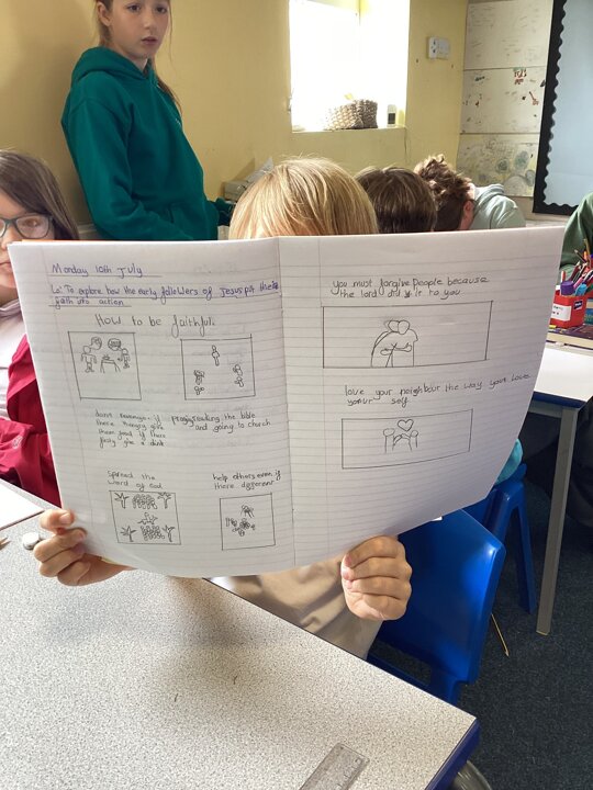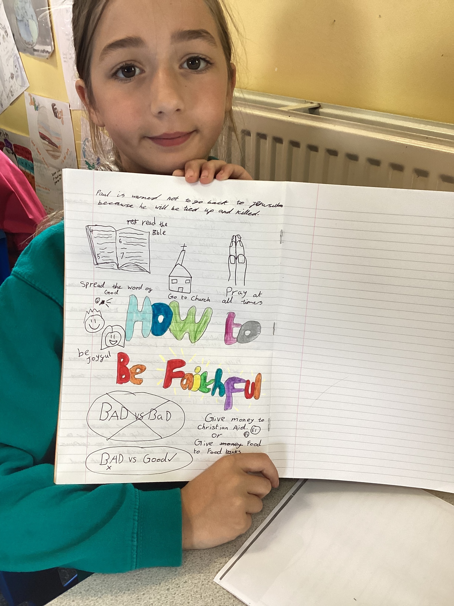 Today the children in Y5/6 explored how the early followers of Jesus put their faith into action. We read three stories from the Acts of the Apostles which showed different ways in which they showed their faith in God. The children discussed these events and put them into their own role plays and freeze frames showing the important actions shown by the followers. We then focused on the letters of Paul and his instructions to the new Christians around the world. The class made their own posters describing these instructions using modern illustrations and words. Claire and Bethan thought carefully about the words of Paul and how difficult some of his instructions were such as blessing those who hurt you and forgiving those who do you harm.