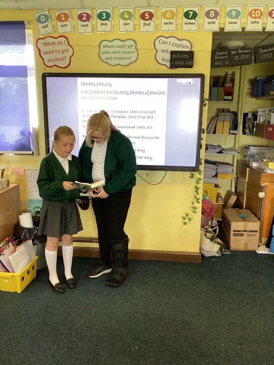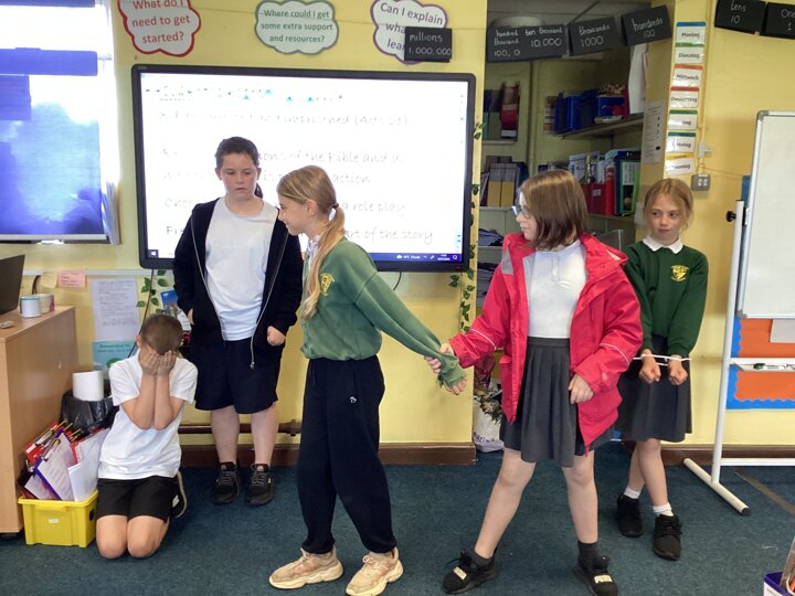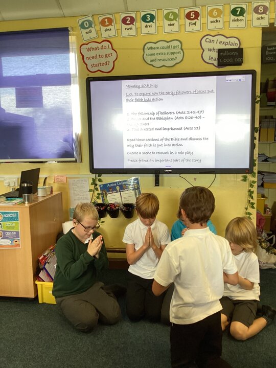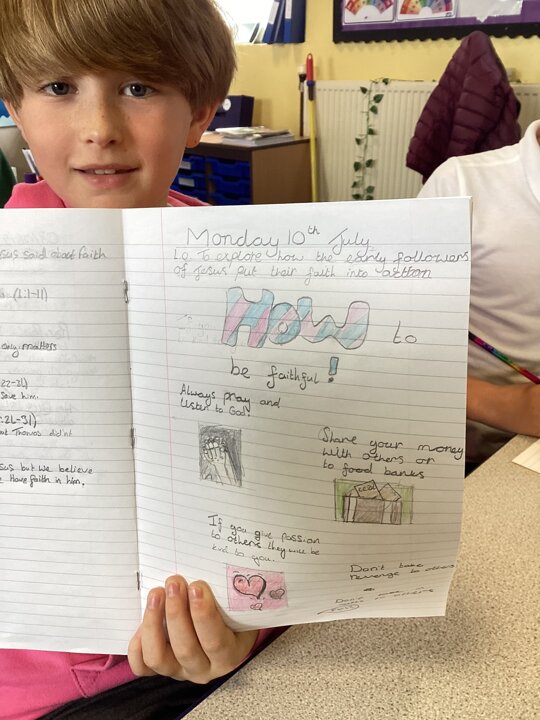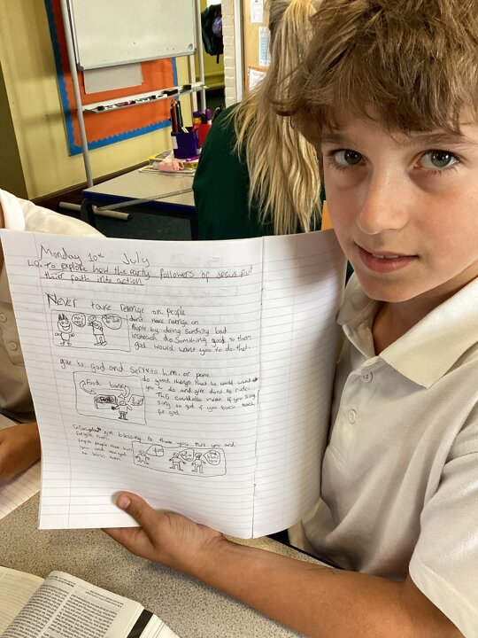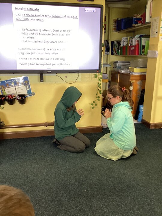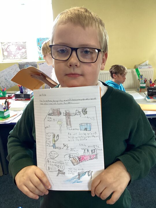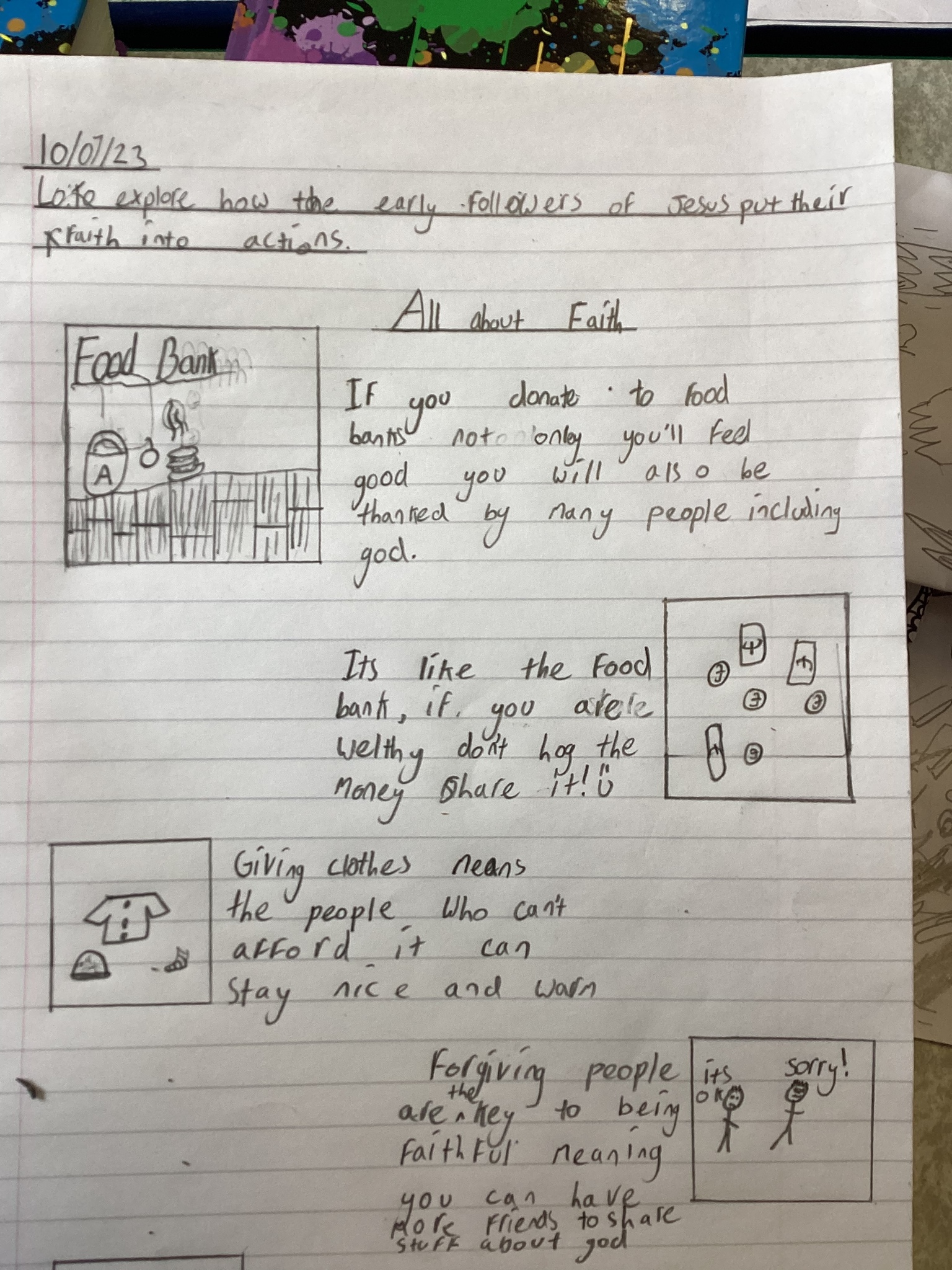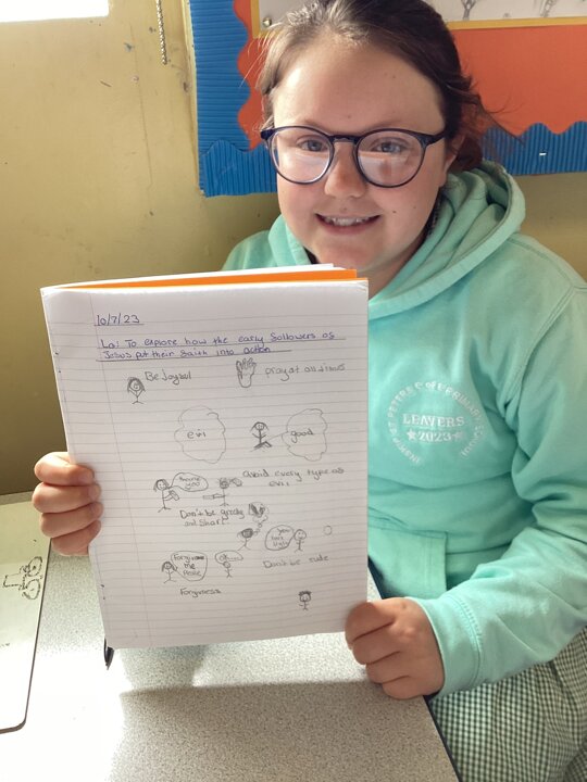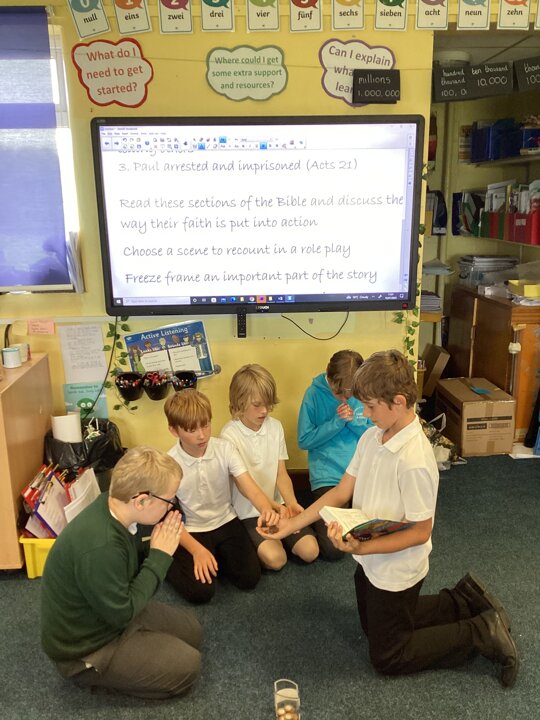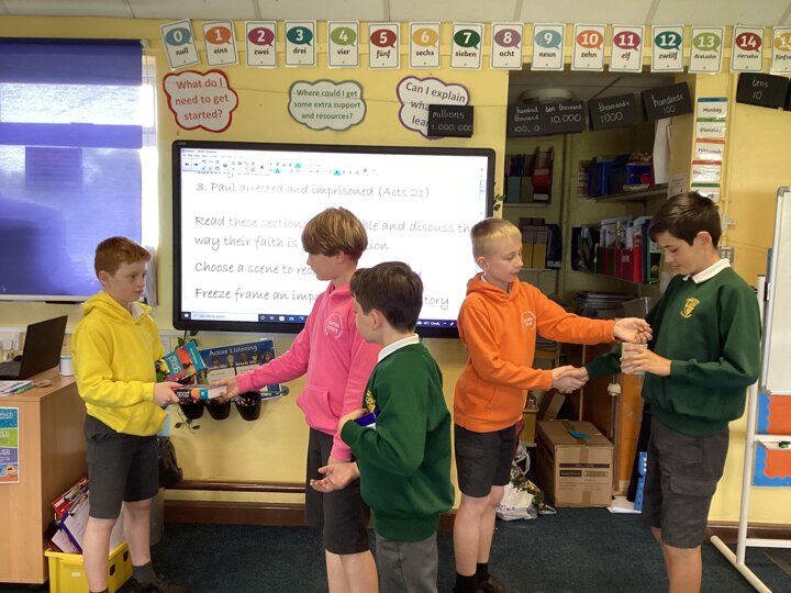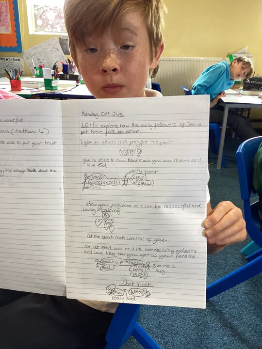 Today the children in Y5/6 explored how the early followers of Jesus put their faith into action. We read three stories from the Acts of the Apostles which showed different ways in which they showed their faith in God. The children discussed these events and put them into their own role plays and freeze frames showing the important actions shown by the followers. We then focused on the letters of Paul and his instructions to the new Christians around the world. The class made their own posters describing these instructions using modern illustrations and words. Claire and Bethan thought carefully about the words of Paul and how difficult some of his instructions were such as blessing those who hurt you and forgiving those who do you harm.