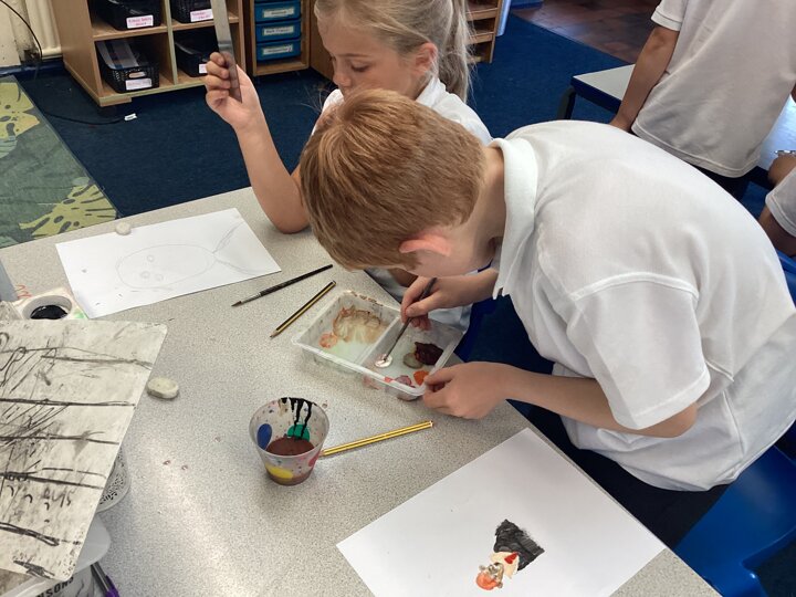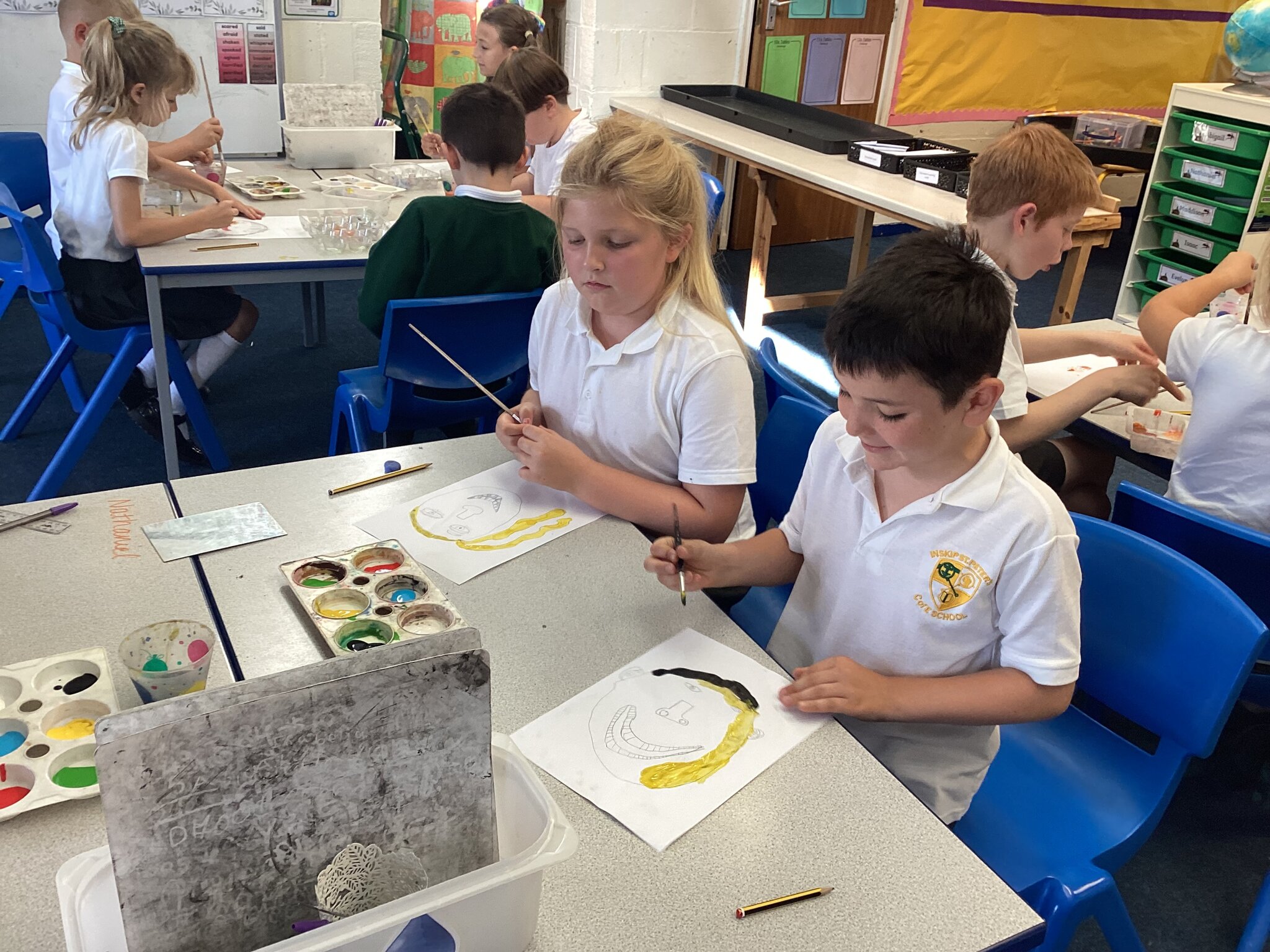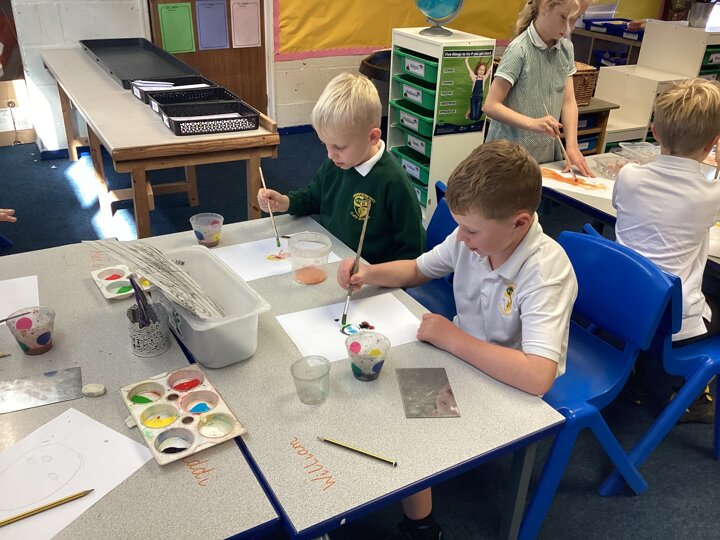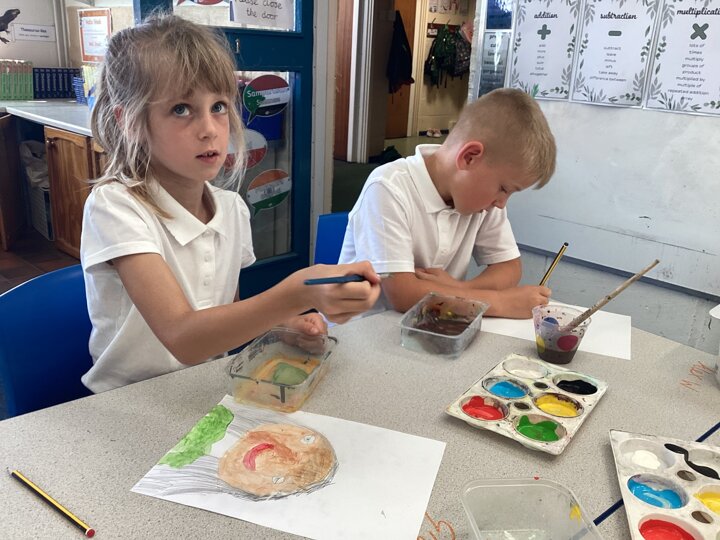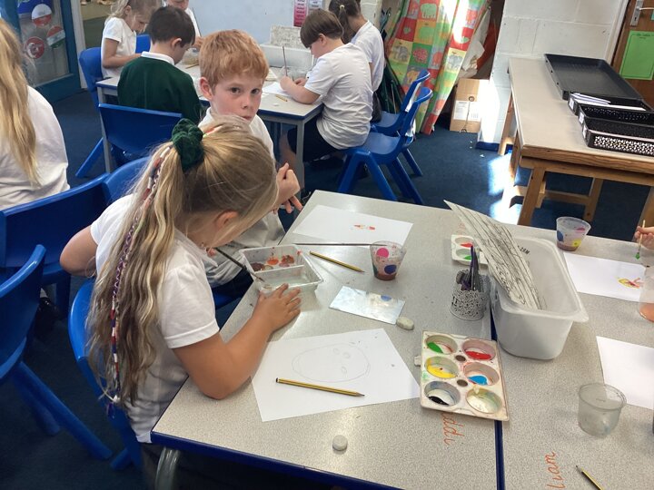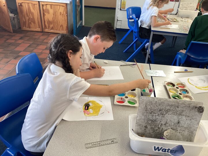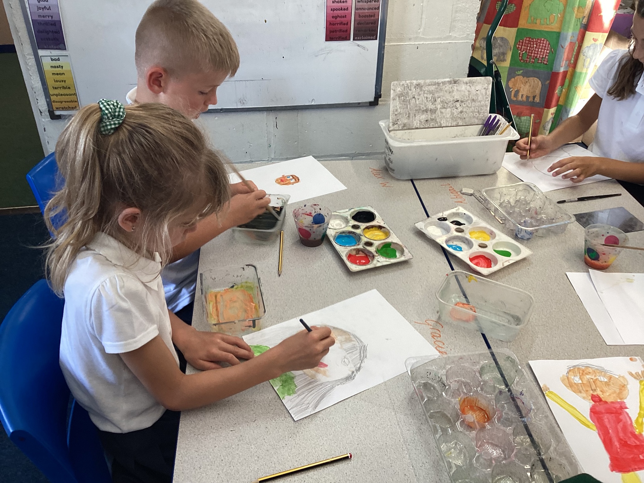 We started this off my using mirrors to look at our own reflections and trying to accurately copy our facial features. We sketched them lightly in pencil before using paint to add wonderful bright colours!