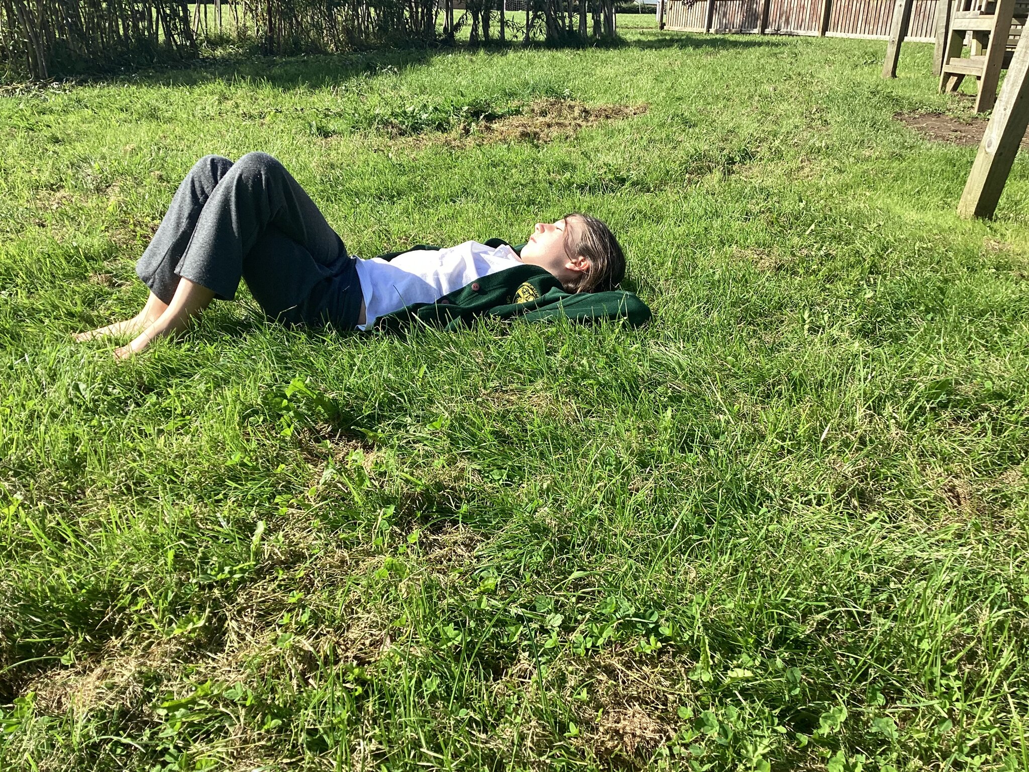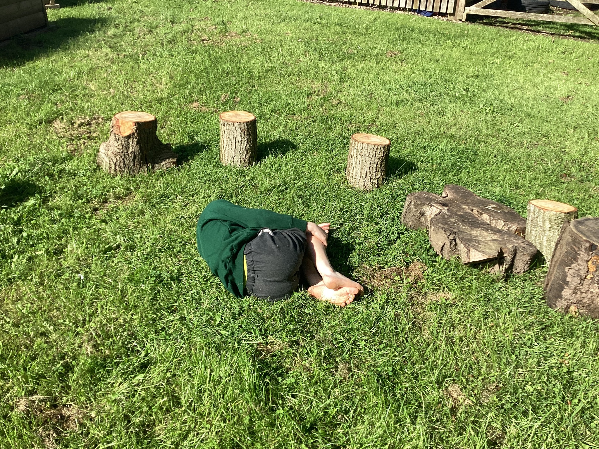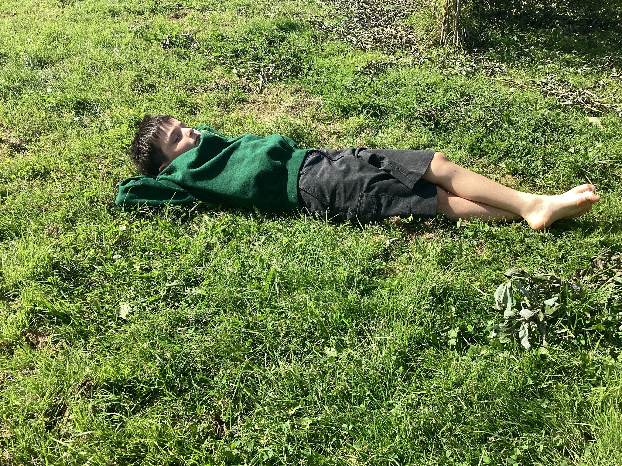 We then tried some mindful breathing outdoors - having quiet time to lie and feel the grass barefoot to think about all of the sensations.