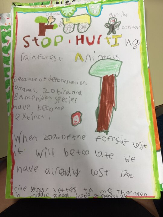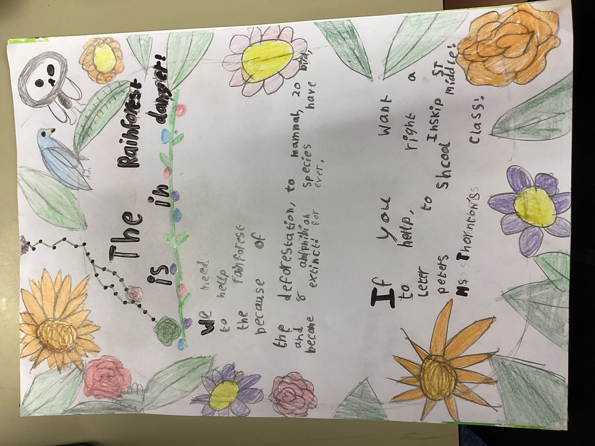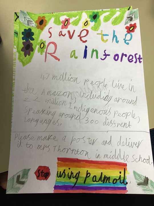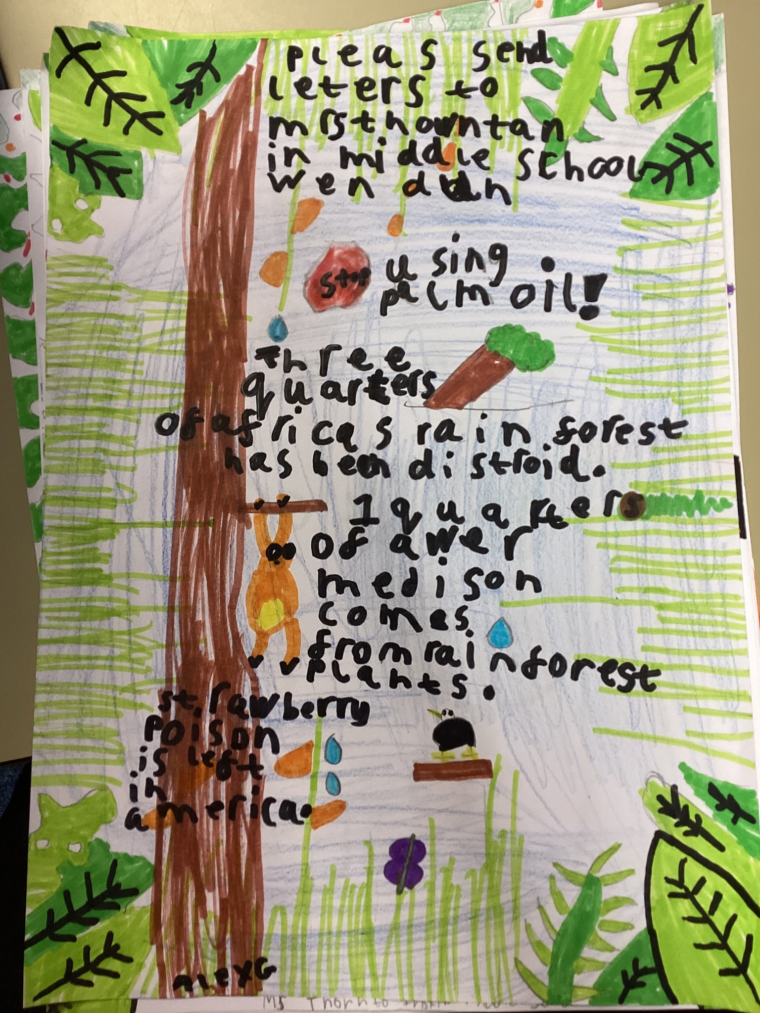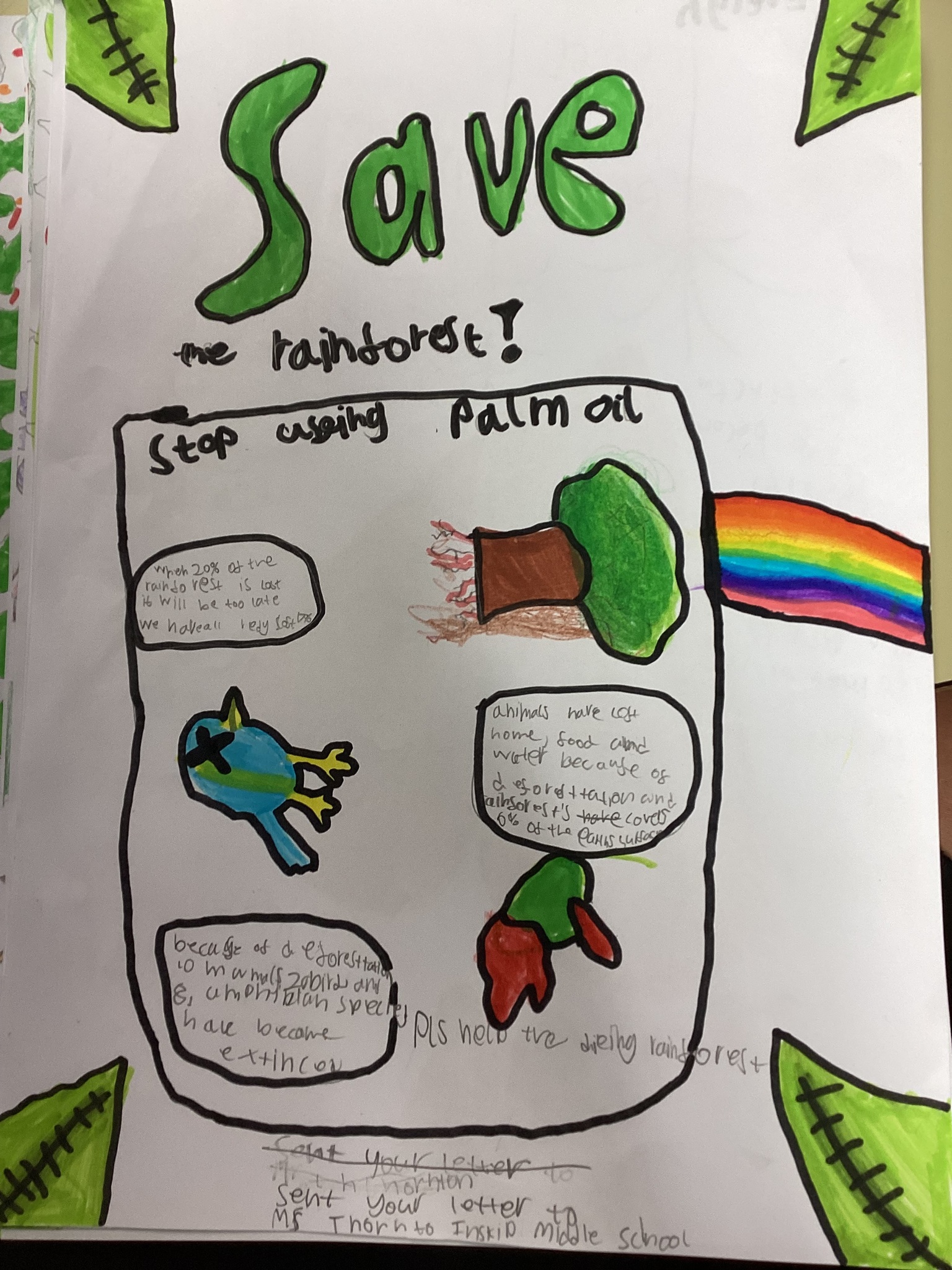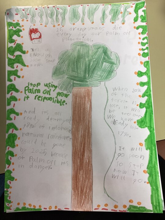As part of our topic for the rainforest, Middle school are preparing to write letters to companies to persuade them to stop using unsustainable palm oil in their products. We have researched and learned a lot about how palm oil production leads to the destruction of the rainforests in Indonesia. In turn, this harms the animals that live there including orang-utans, tigers and elephants.