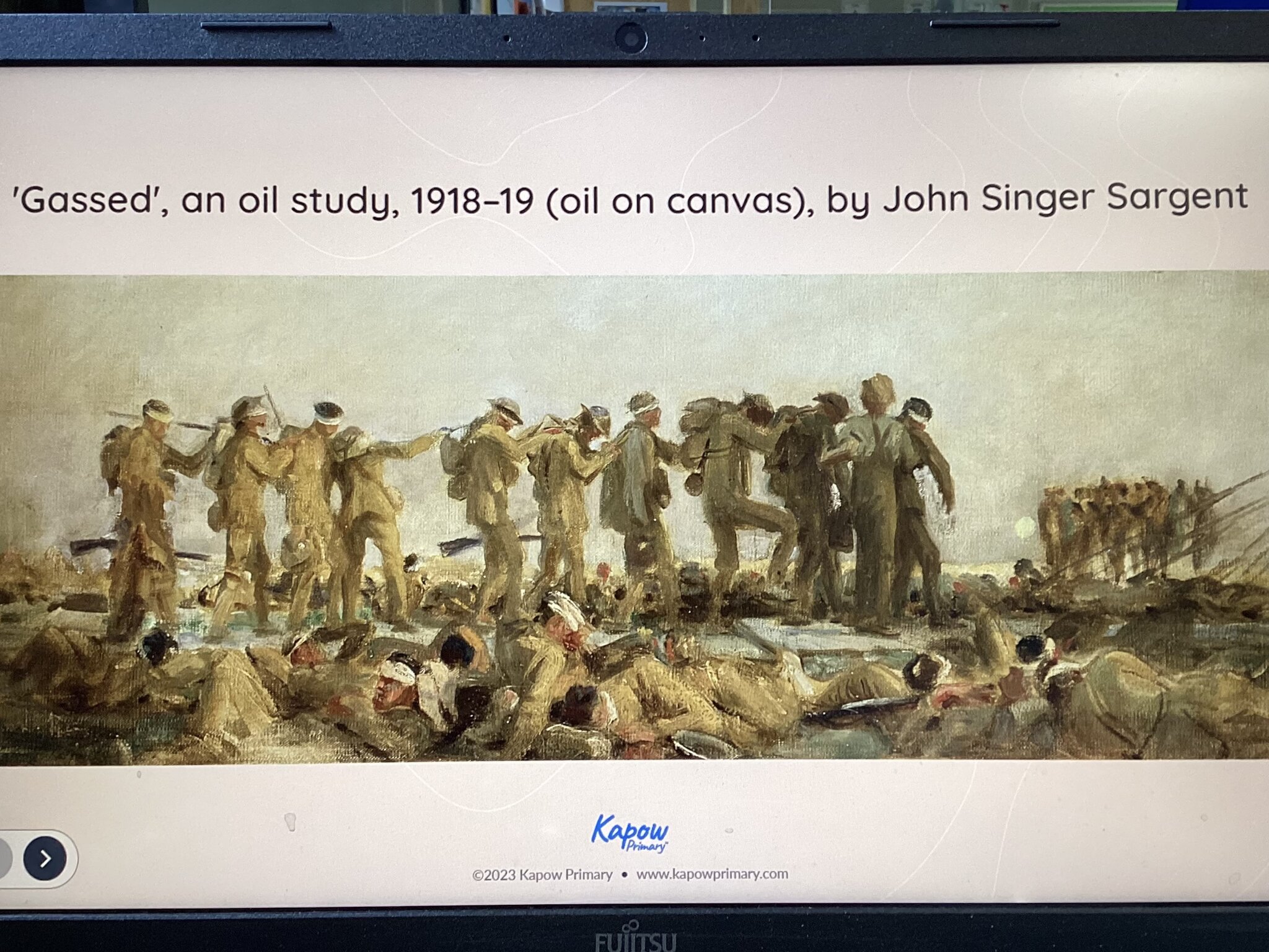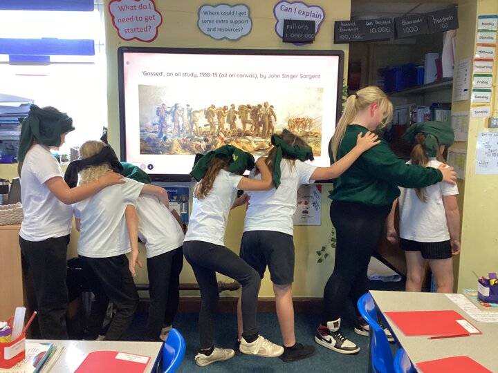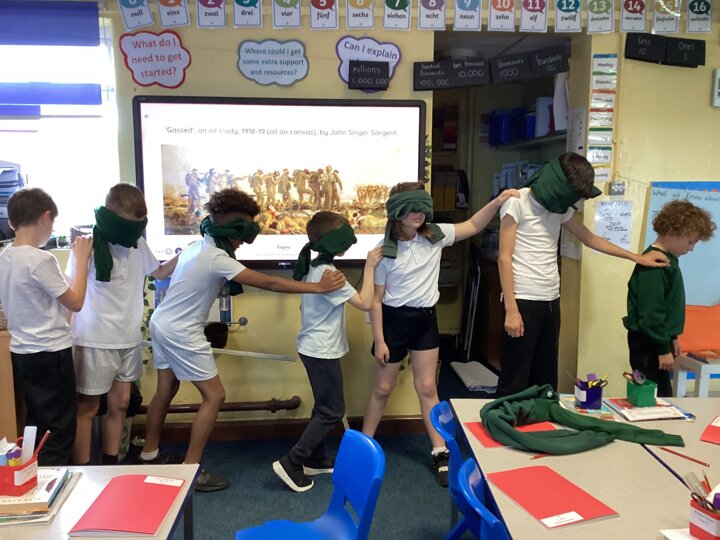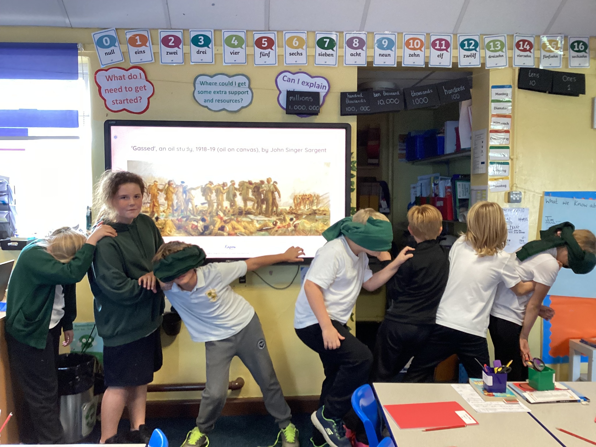 Today, the class looked carefully at the oil painting, Gassed by John Singer Sargent. We discussed what was going on, the story behind the picture and the feelings of the soldiers. The children spent time reproducing the painting in pencil in their sketch pads, looking carefully at the shapes and shading. They then wanted to try reproducing the picture in small groups with the children spontaneously using their jumpers as bandages and rulers as sticks. The results were pretty dramatic! See the gallery for their tableaus.