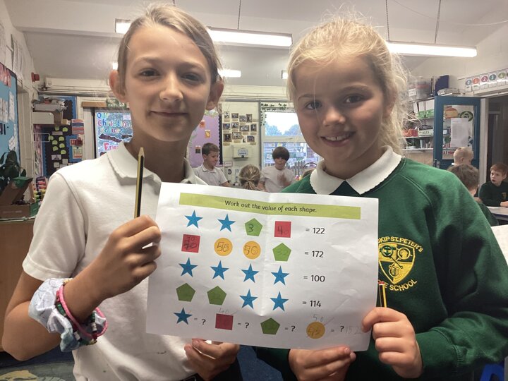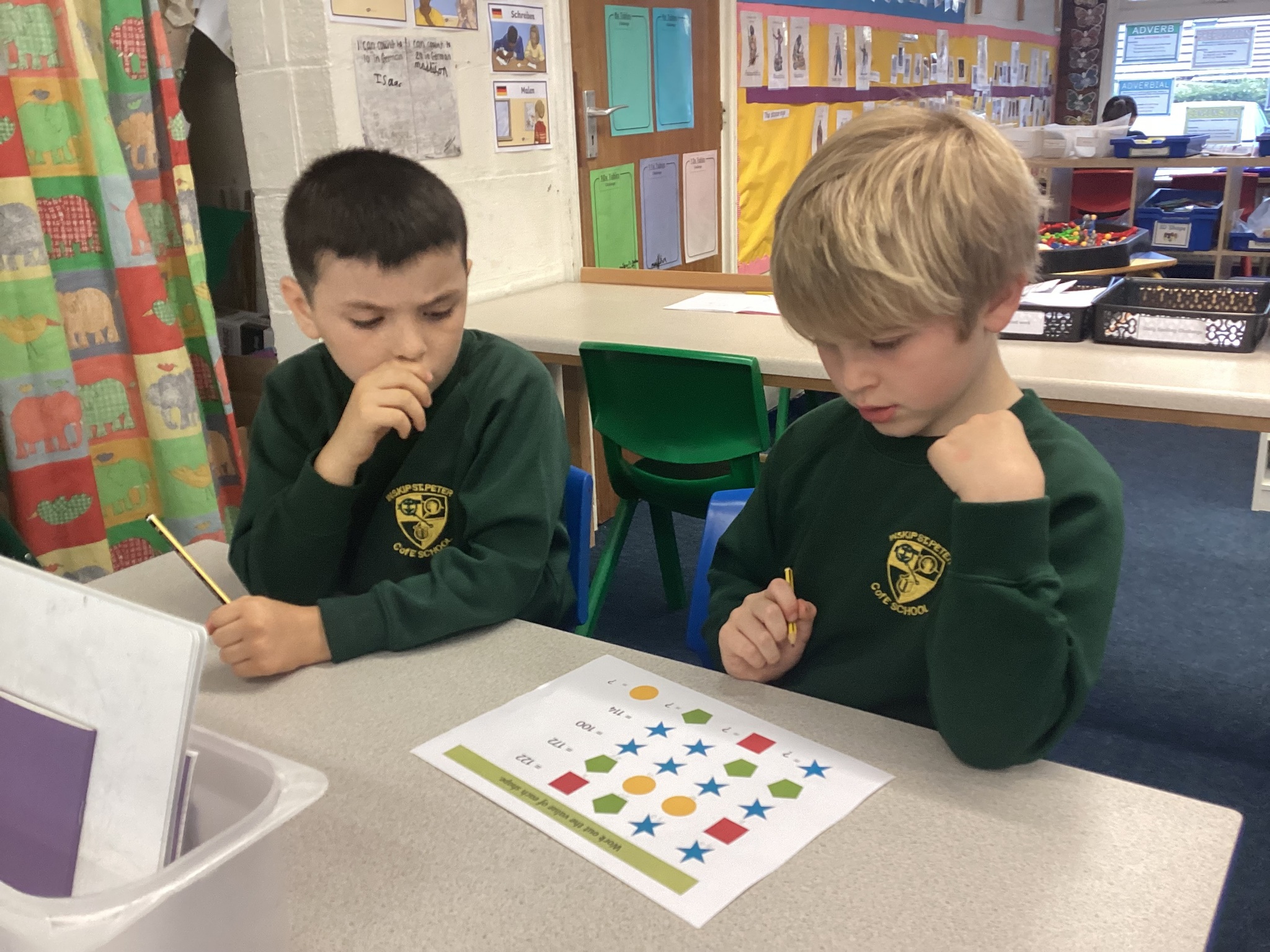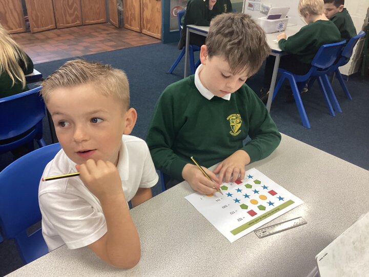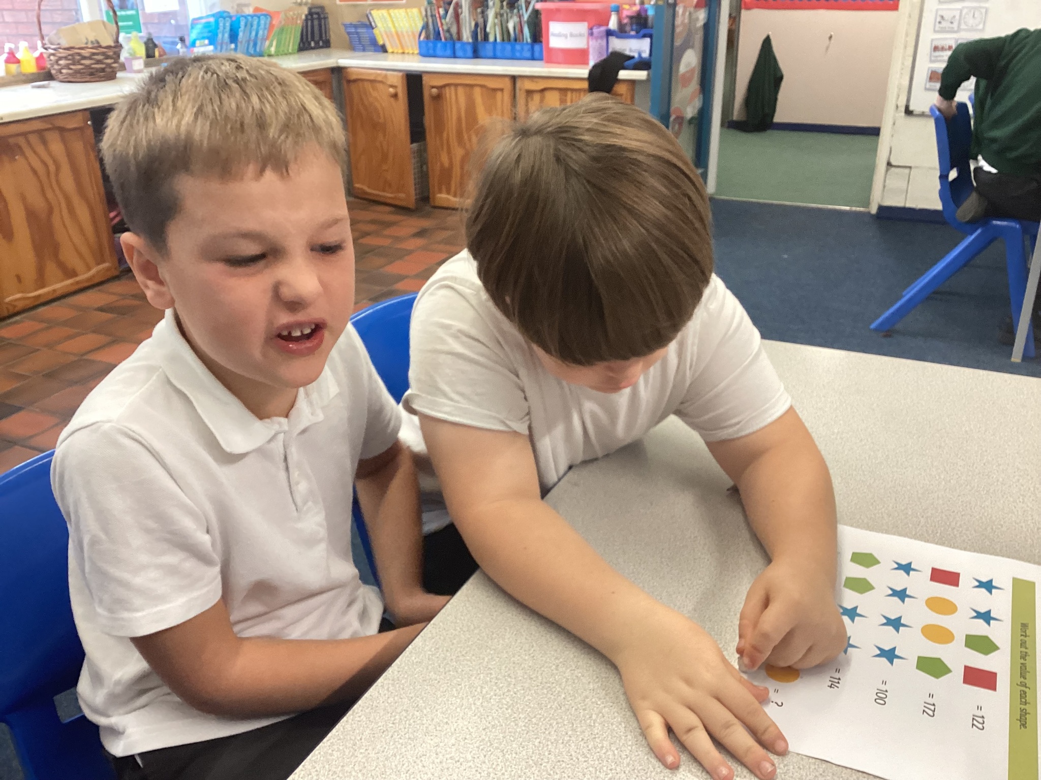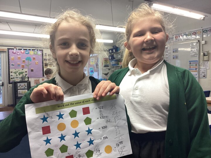 Middle school have been looking at word problems that use addition and subtraction. Children were paired up and given challenges to solve together, including shape problems, word problems and abstract thinking problems.