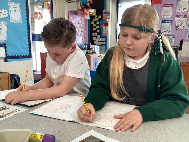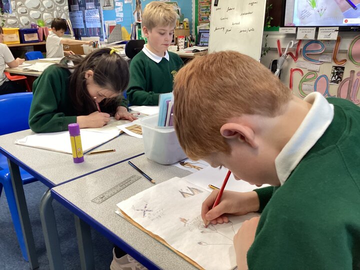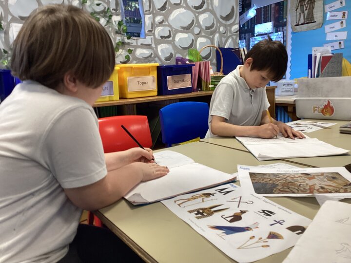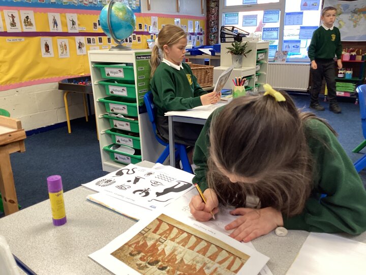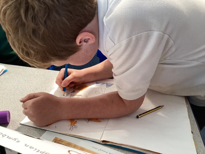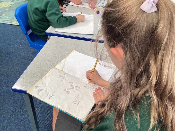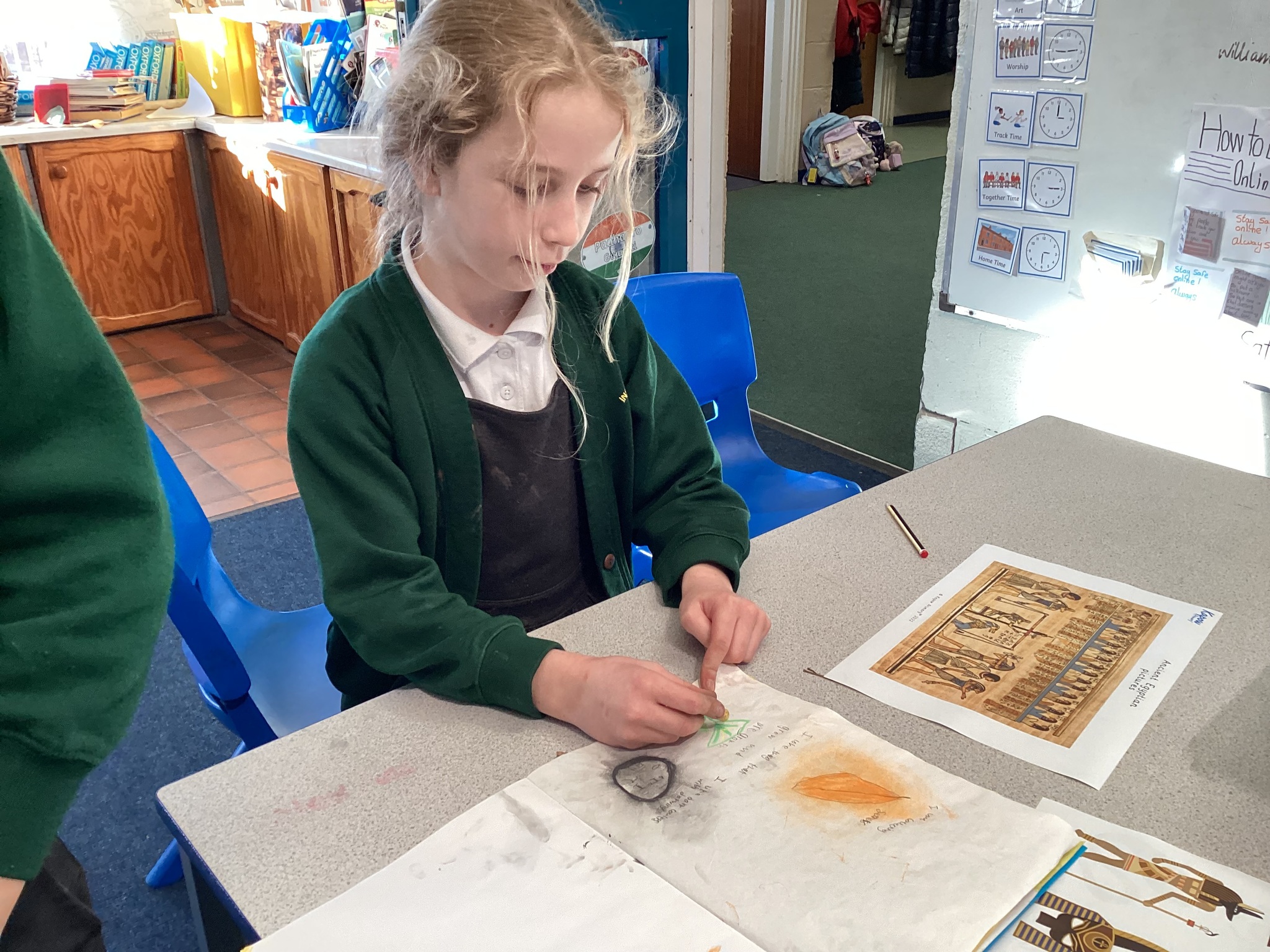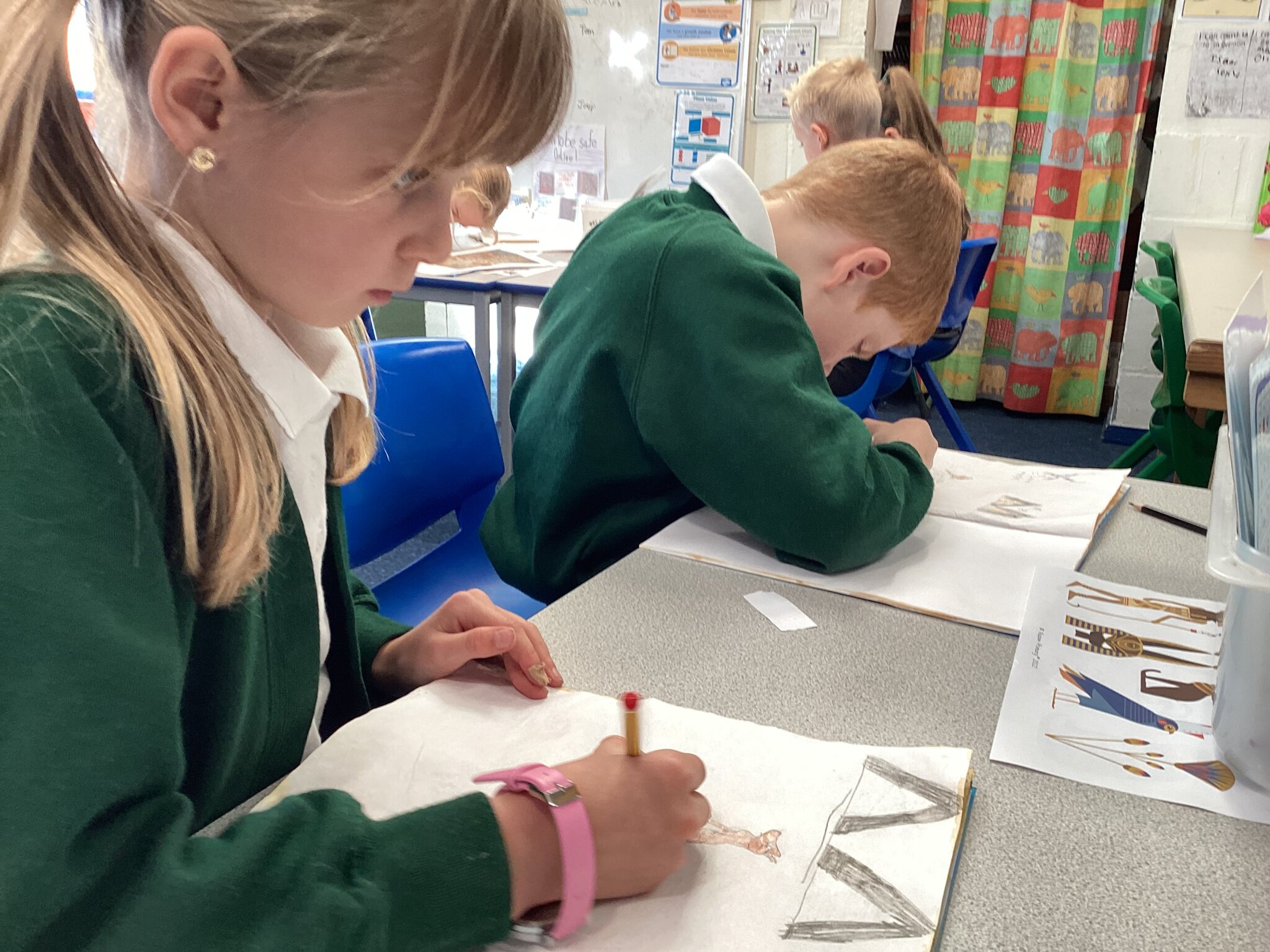 Our art topic for this half term is Ancient Egyptian Scrolls, inspired by our topic in history. Children have been looking at the colours and patterns often represented in ancient Egyptian art. They have been looking at how they can adapt this into a representation of themselves. Fantastic sketchbook work all around!