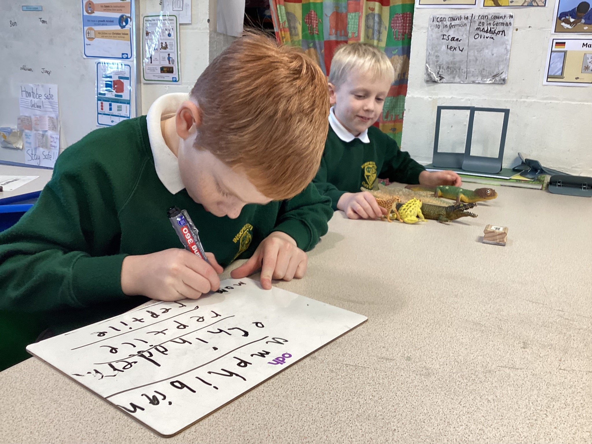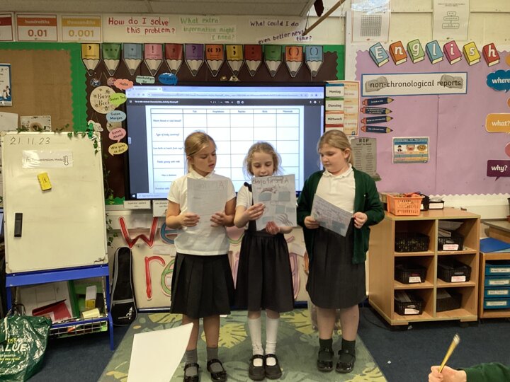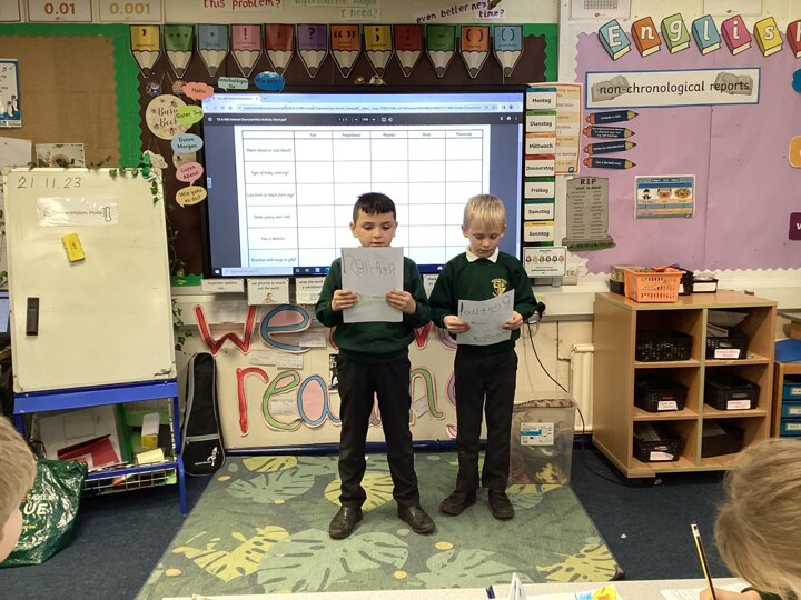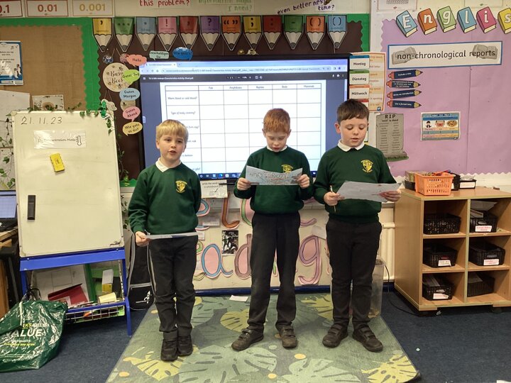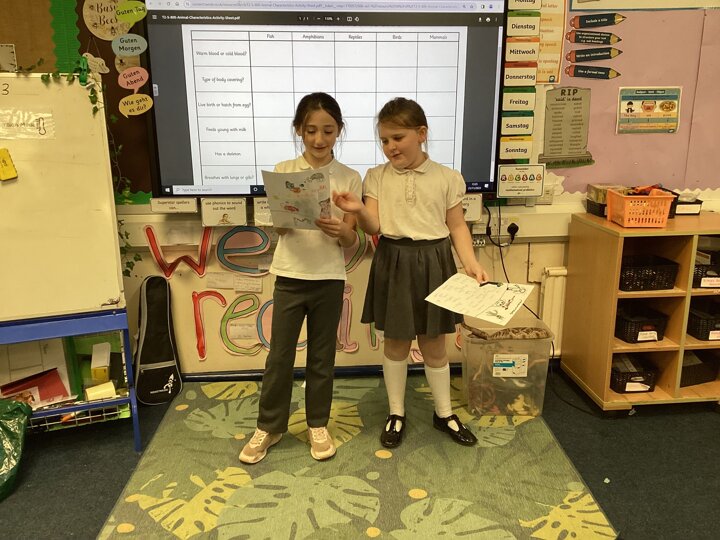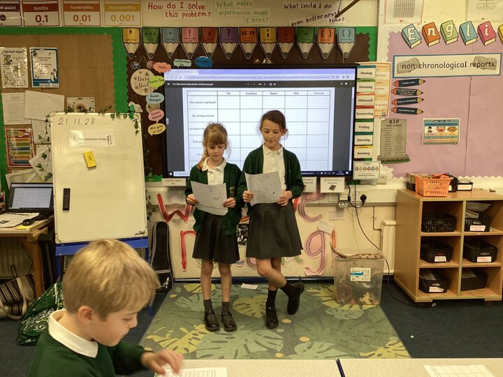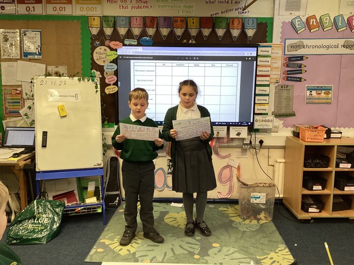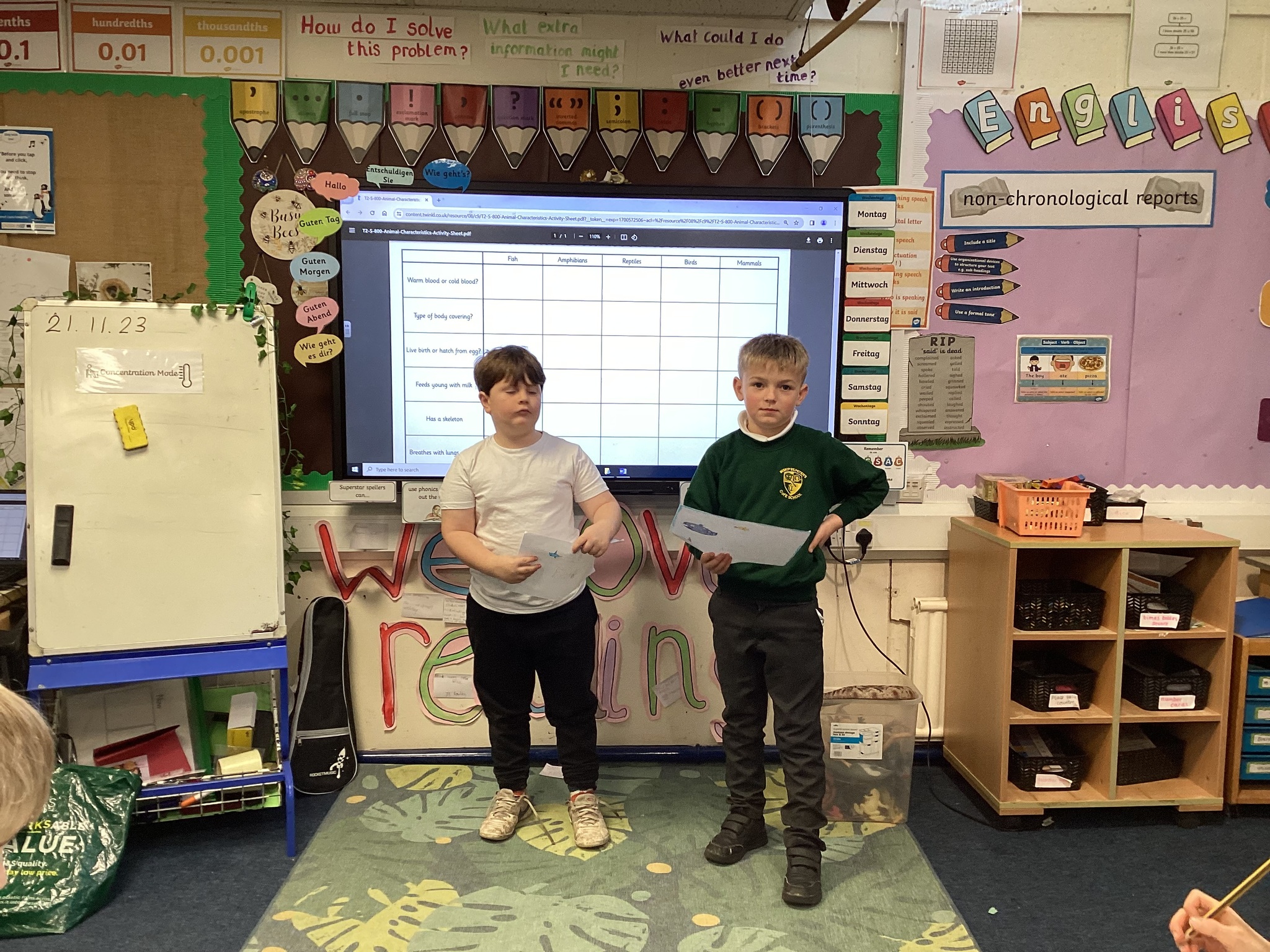 In science we have been investigating classification of animals. Children have spent some time learning about the groups: mammals, reptiles, amphibians, birds, fish, mulloscs and arthropods. Children split into small groups to research each classification, create a poster and then feed back to the class in a presentation.