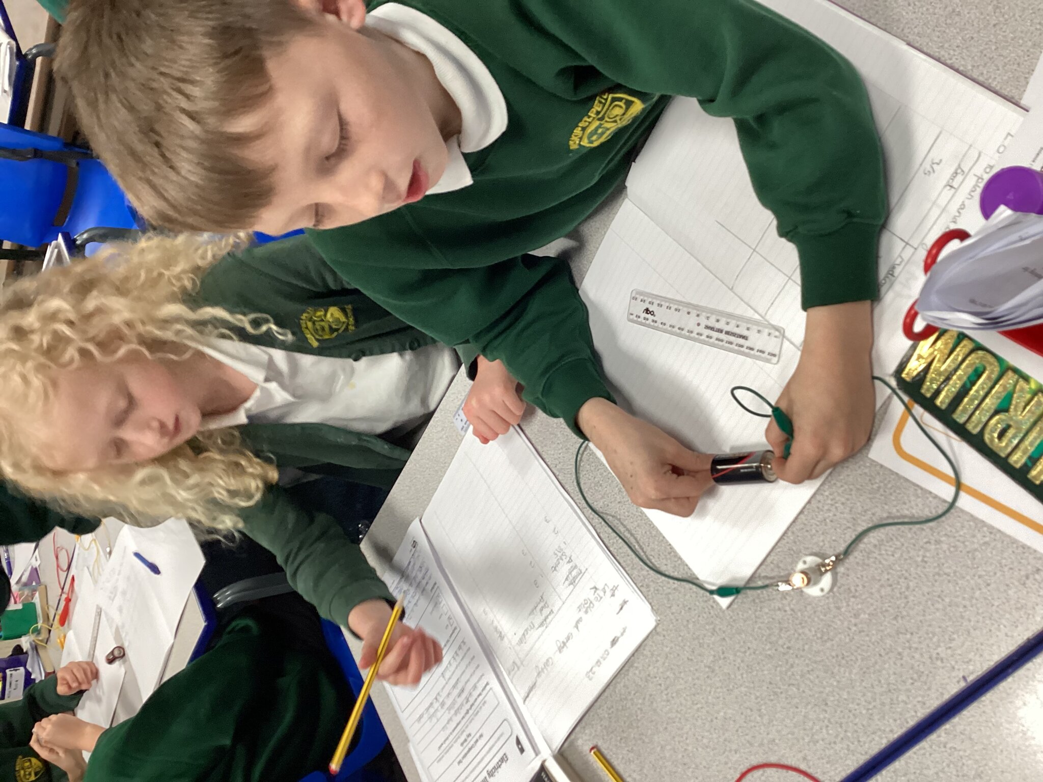 The class discovered there was a difference but only a slight change when using different lengths of wires in the circuits. They came up with an ‘er’ conclusion which was…’the shorter the wires, the brighter the bulb’ and ‘the longer the wires, the slower the speed of the motor’. Some children went further by saying that to keep the brightness the same in a circuit you would need more voltage for longer wires.