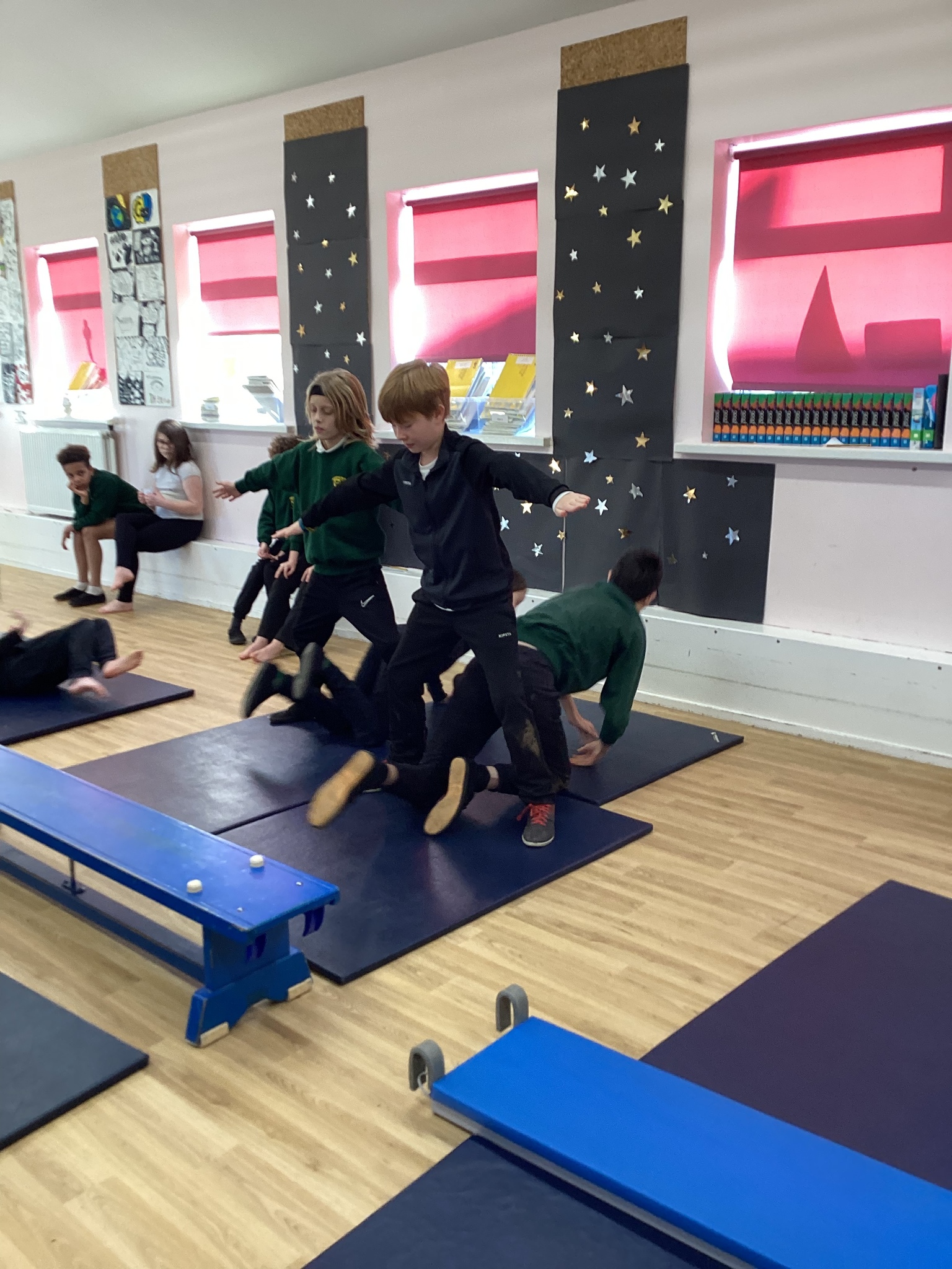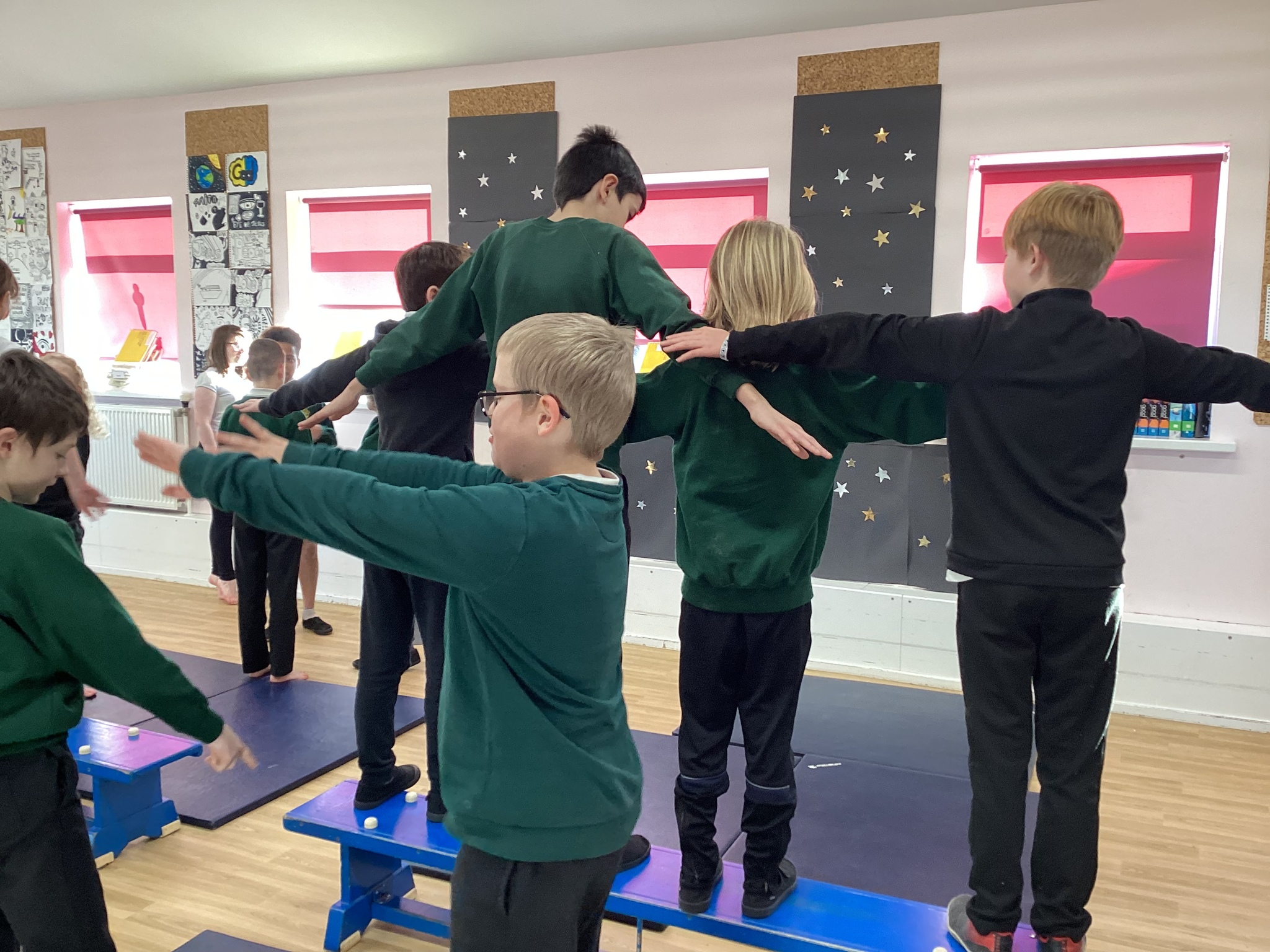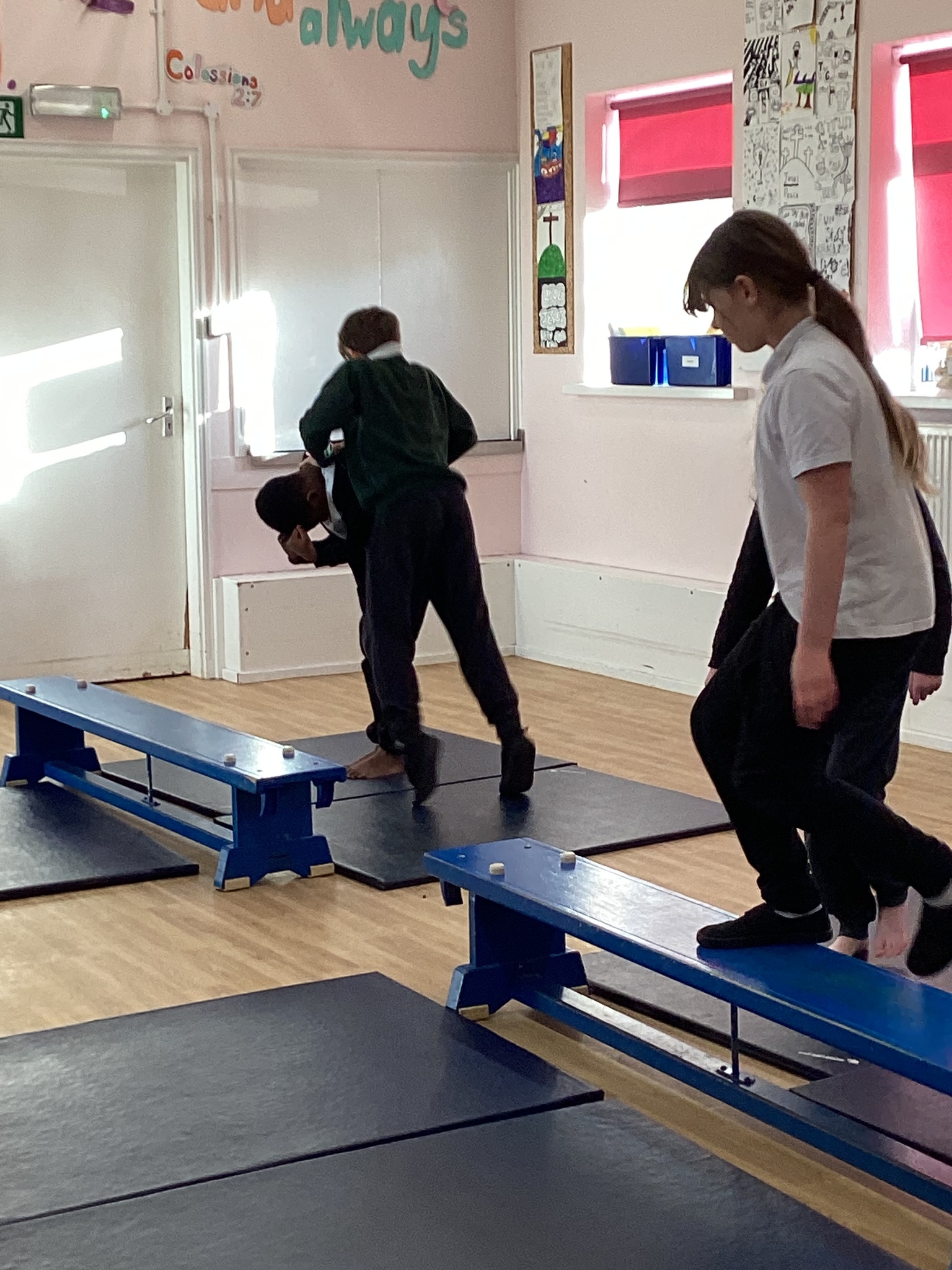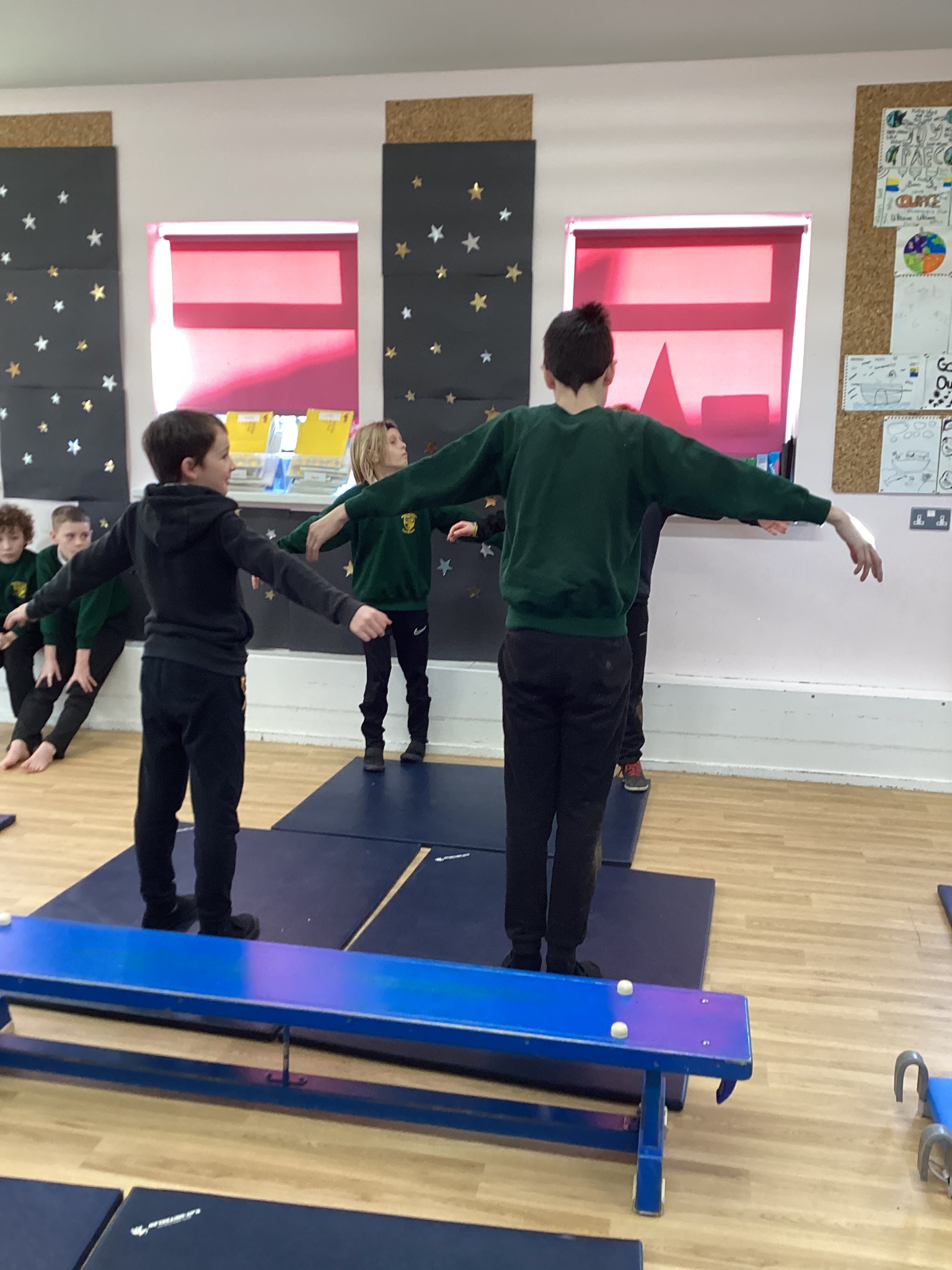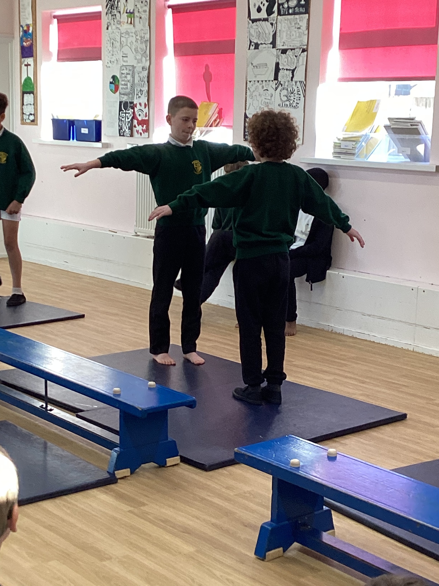 For Upper School’s second gymnastics lesson of Spring, they built on their sequences of balances and travelling from shape to shape from their first lesson. They used canon to vary the sequence and improved their balances (counter tension and counter balance) and ways of travel (sliding, jumping, rolling).