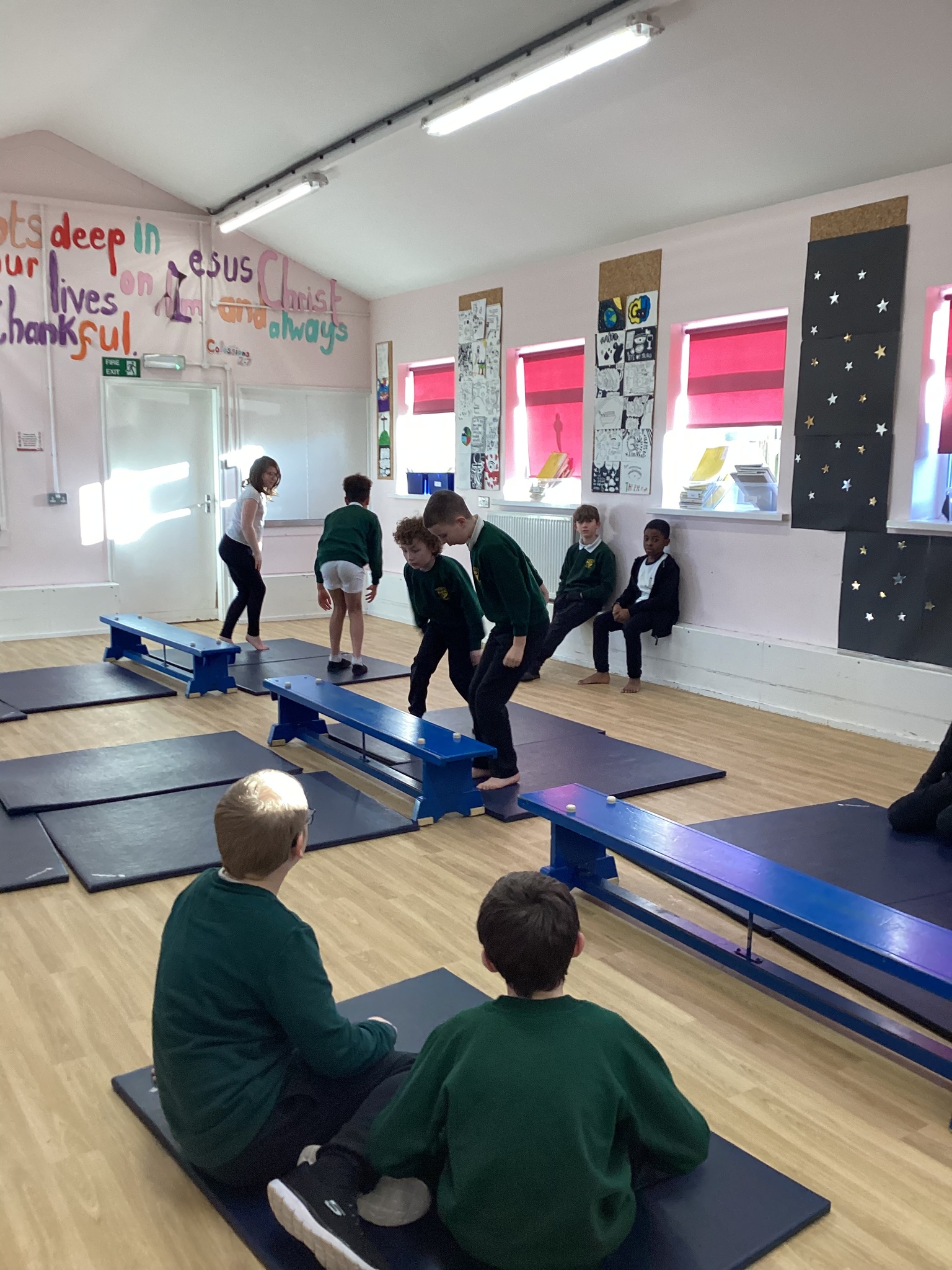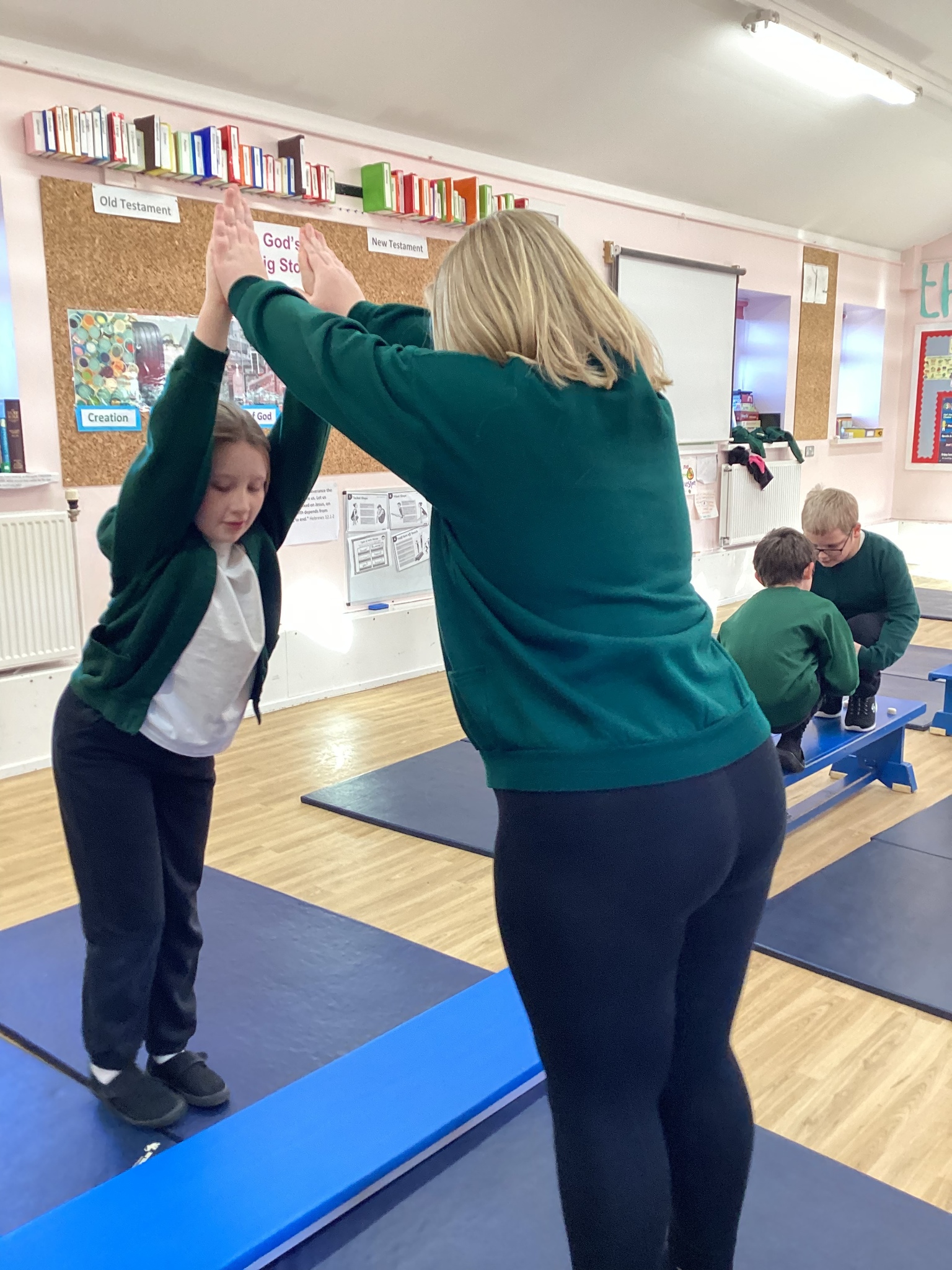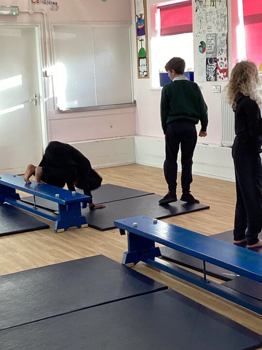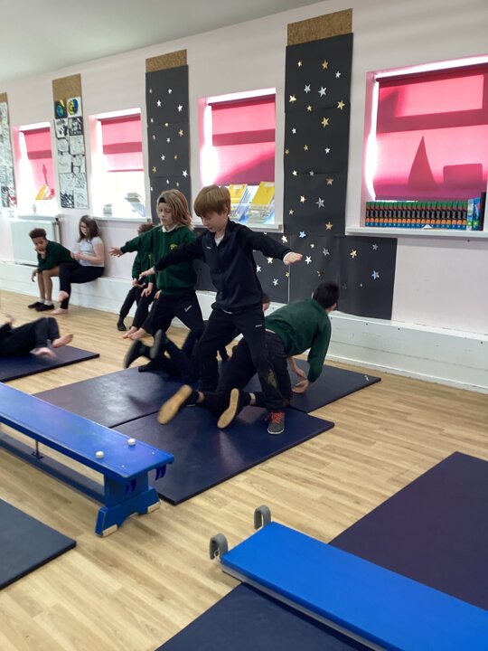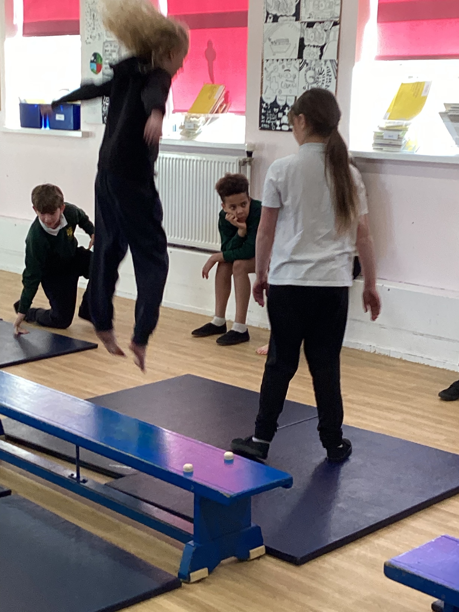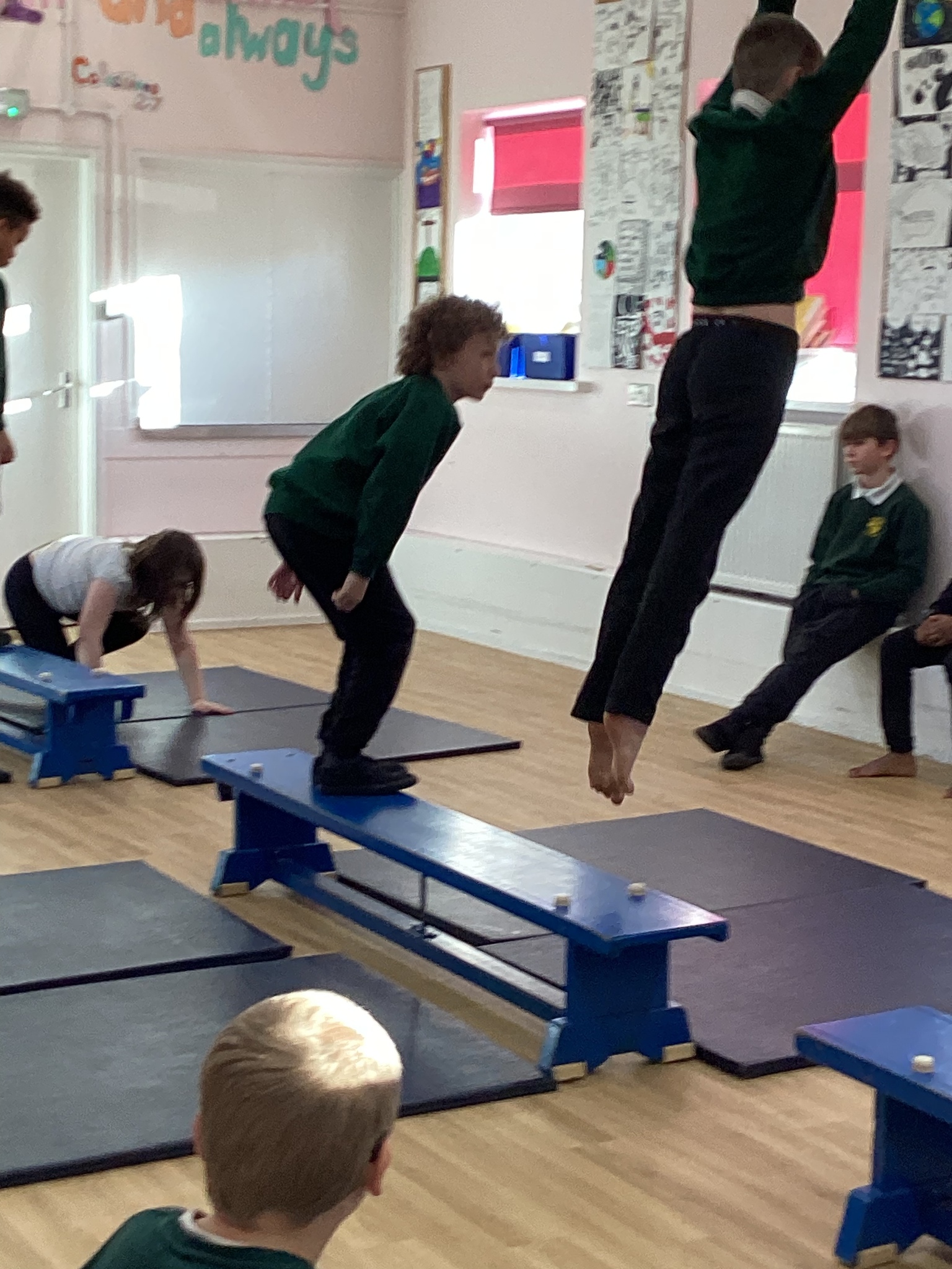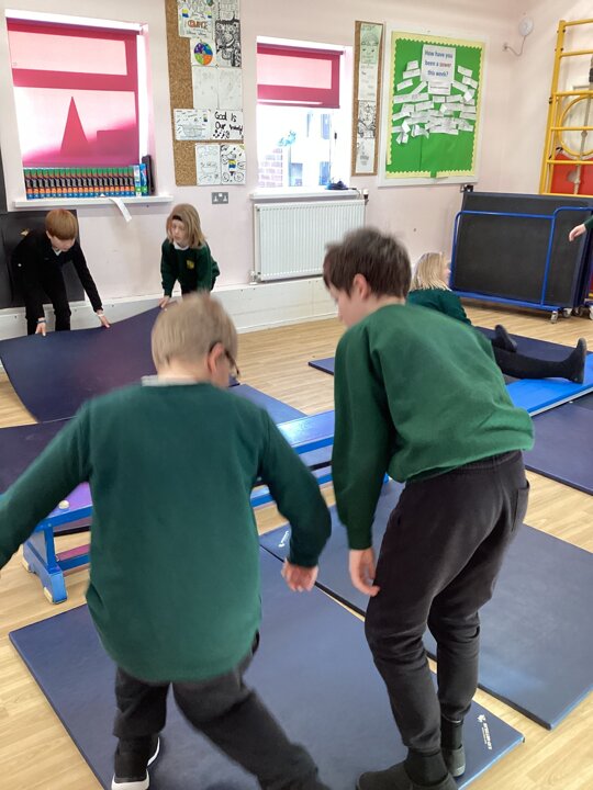 For Upper School’s second gymnastics lesson of Spring, they built on their sequences of balances and travelling from shape to shape from their first lesson. They used canon to vary the sequence and improved their balances (counter tension and counter balance) and ways of travel (sliding, jumping, rolling).