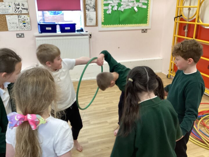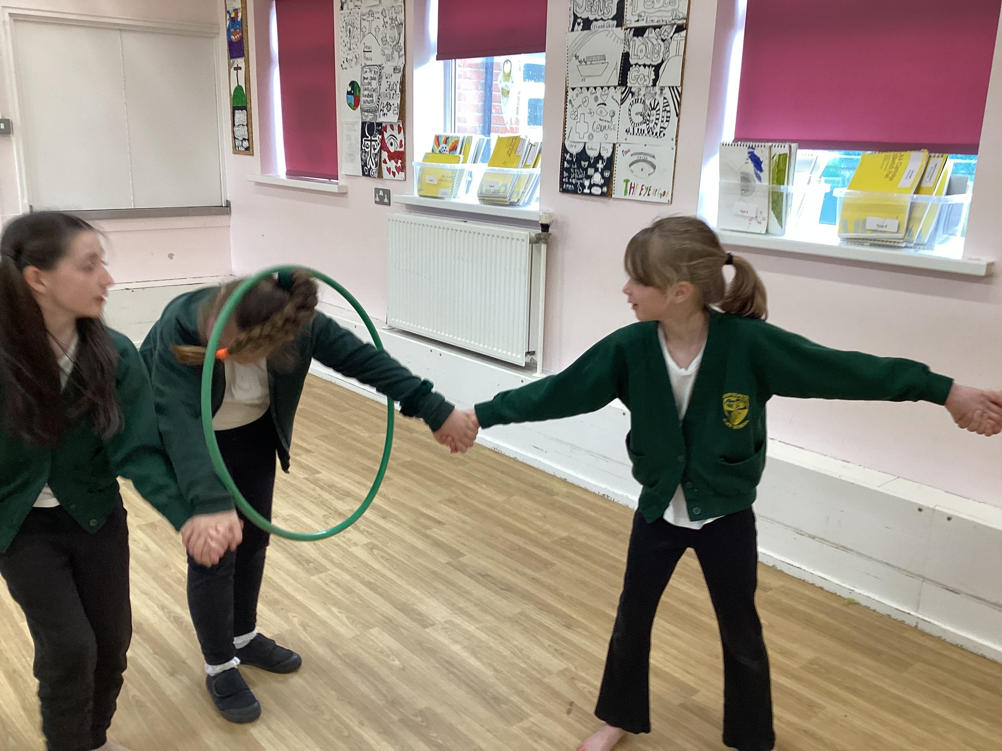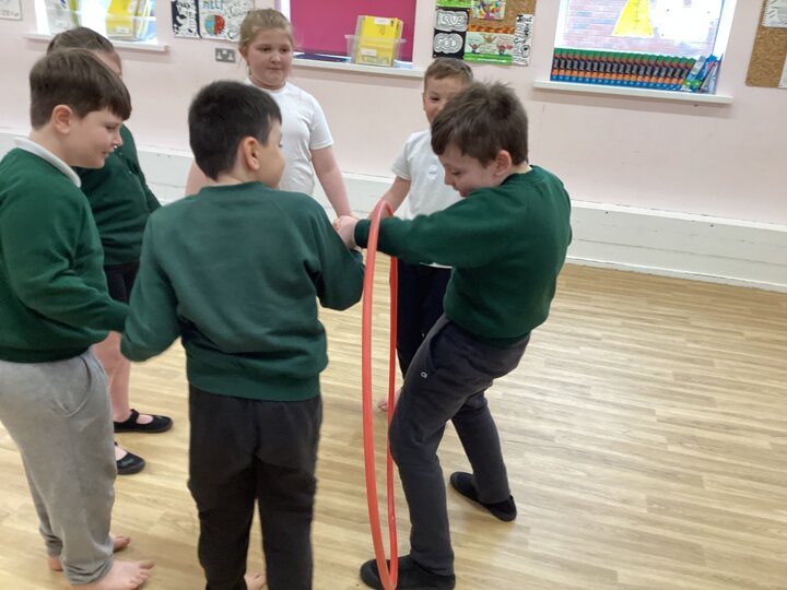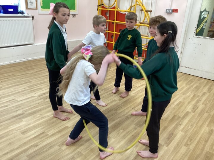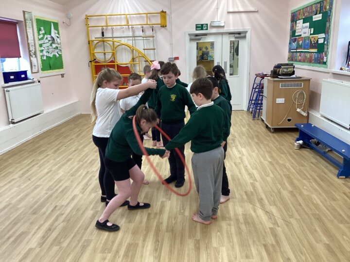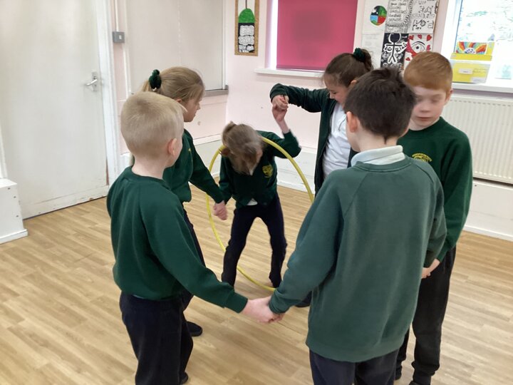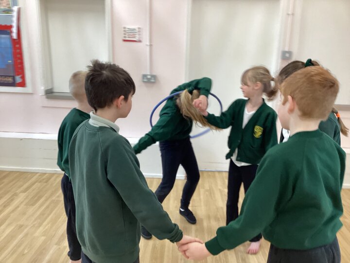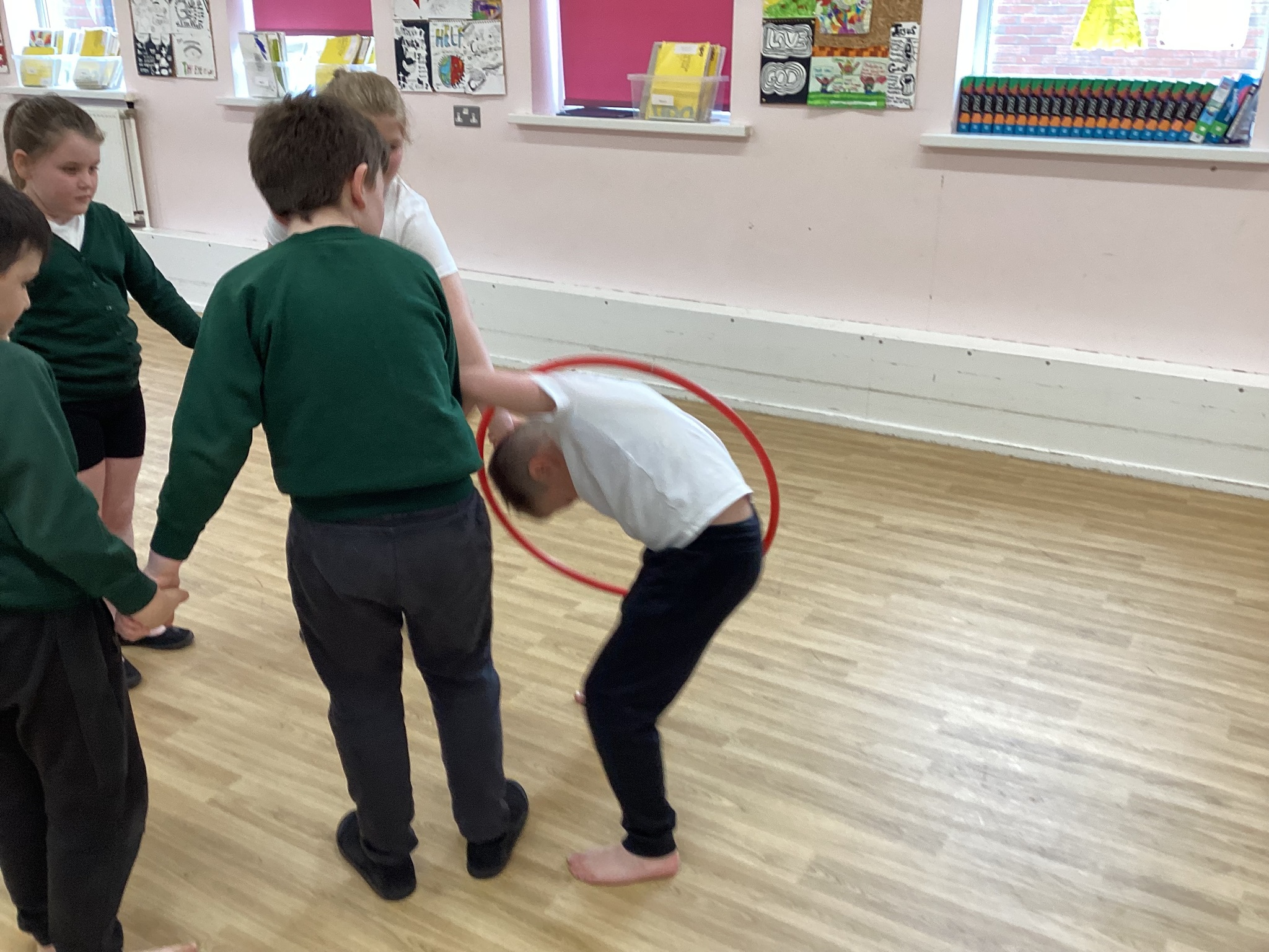 In addition, the children were given challenges in groups to pass a hoop around a circle where everyone held hands. The team could only talk before the task began and after it had finished to evaluate. They all did very well! The hoop was made smaller and the technique had to change, but the children all managed it! In the end, we saw if we could pass a hoop around the whole class!