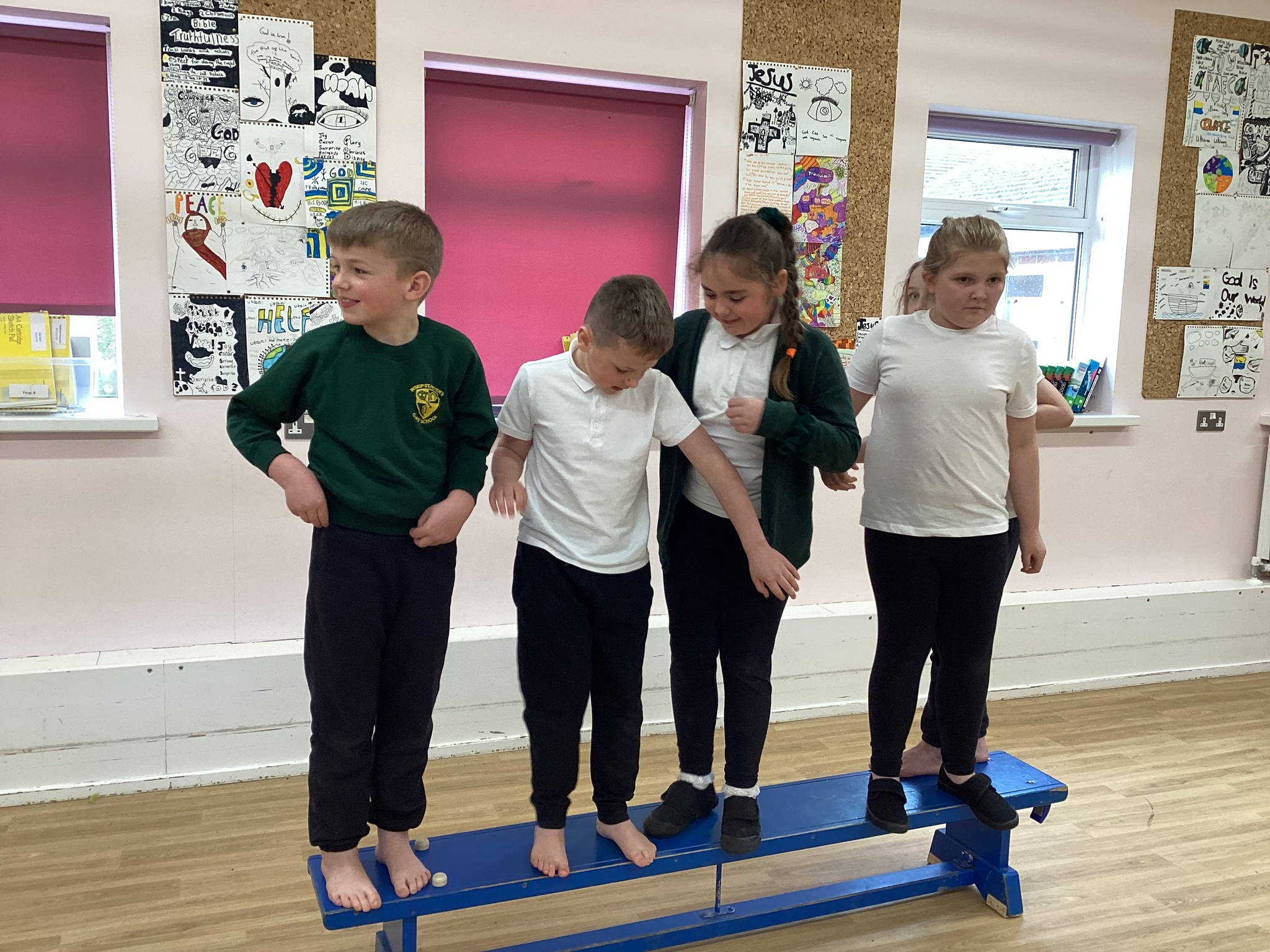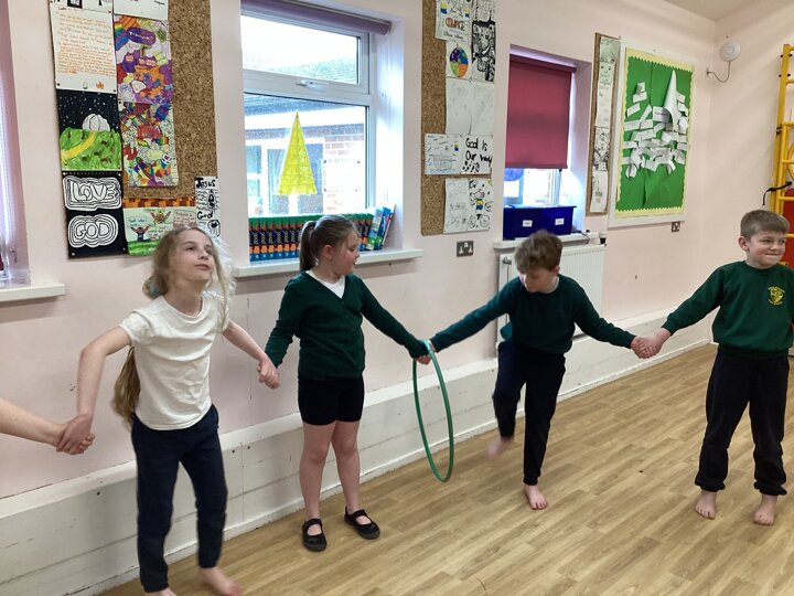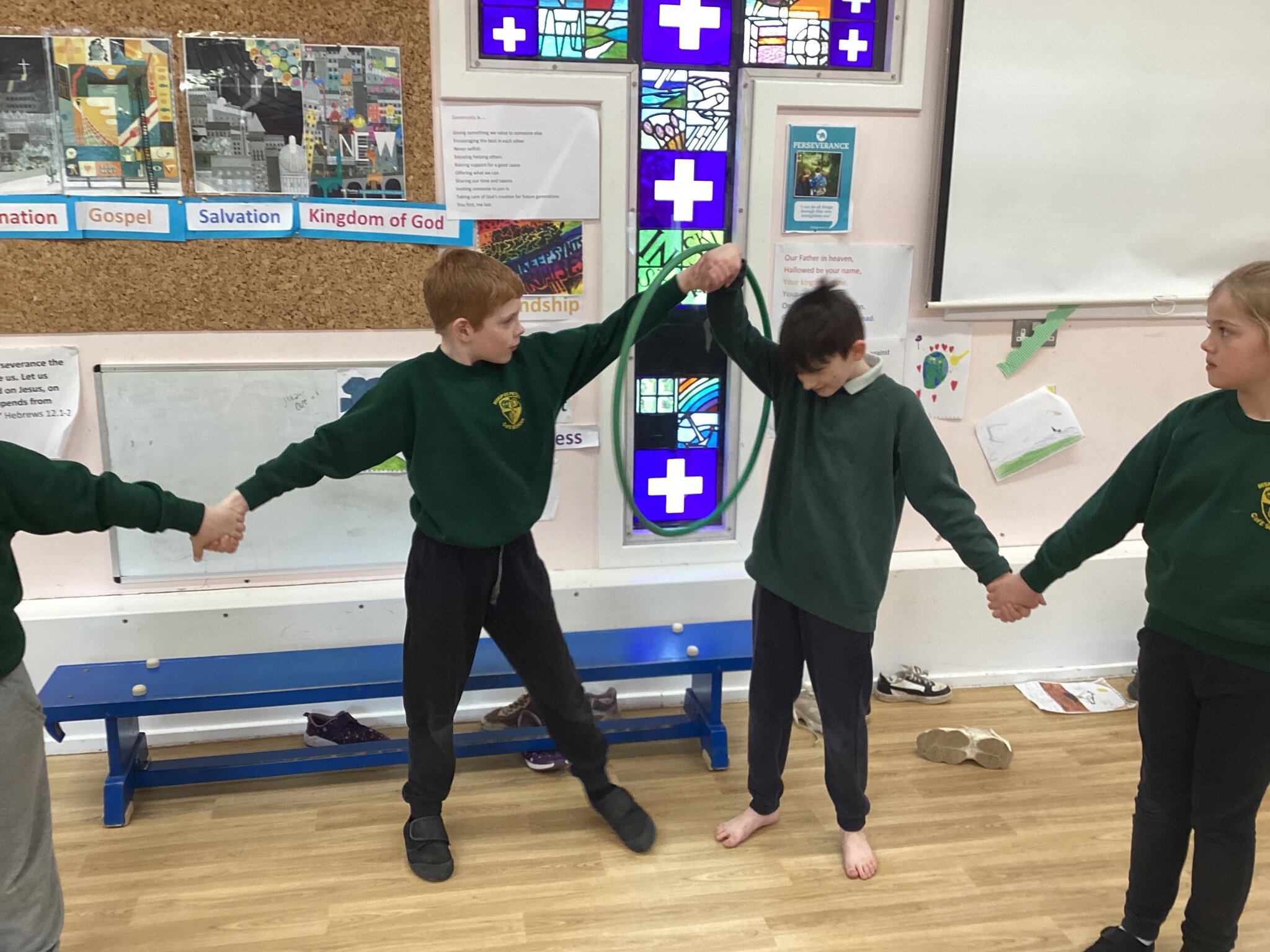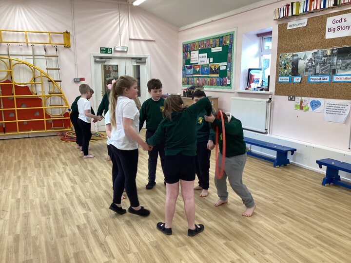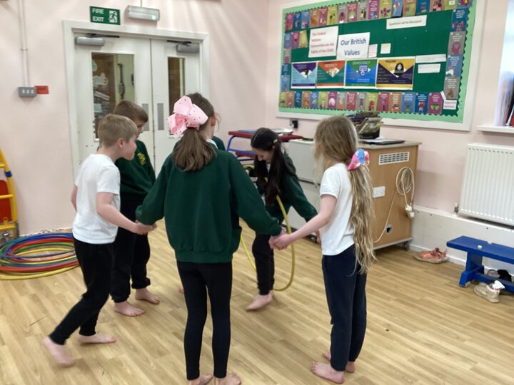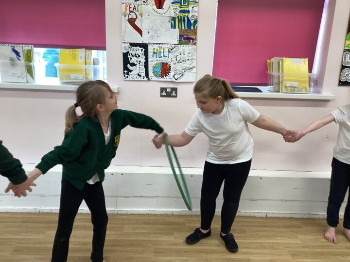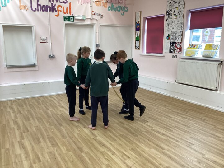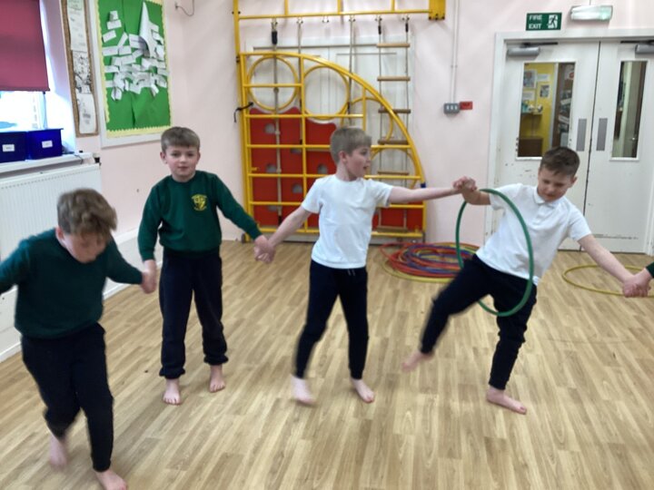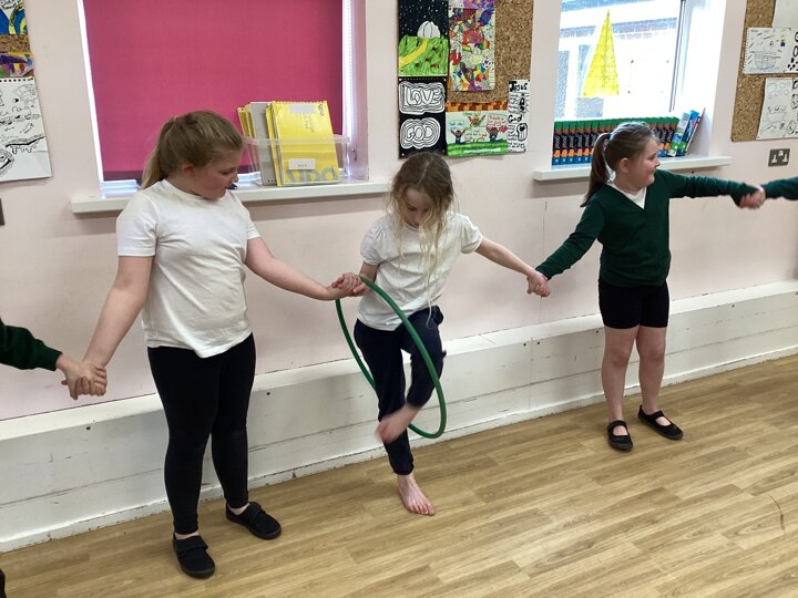 In addition, the children were given challenges in groups to pass a hoop around a circle where everyone held hands. The team could only talk before the task began and after it had finished to evaluate. They all did very well! The hoop was made smaller and the technique had to change, but the children all managed it! In the end, we saw if we could pass a hoop around the whole class!