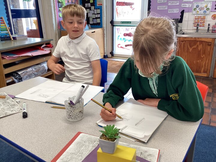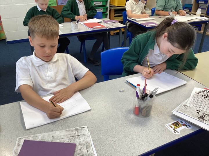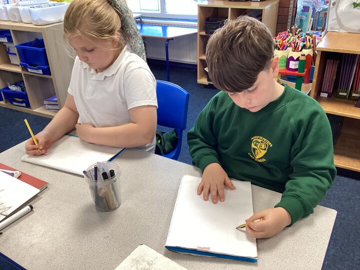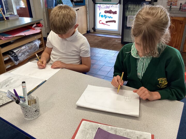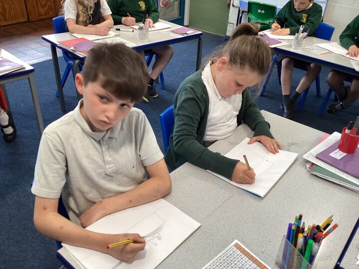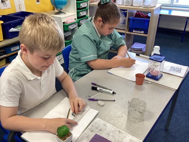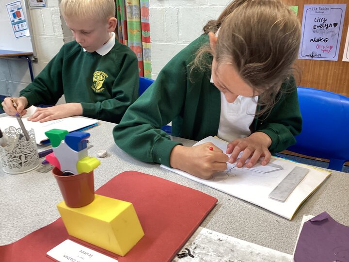 Our art topic this half term is focusing on improving our drawing skills. To start this off, we began looking at breaking down what we see into geometric shapes - rectangles, ovals and triangles. Children have tried copying classroom objects that they could see, firstly drawing them as geometric shapes and then adding details and shading.
