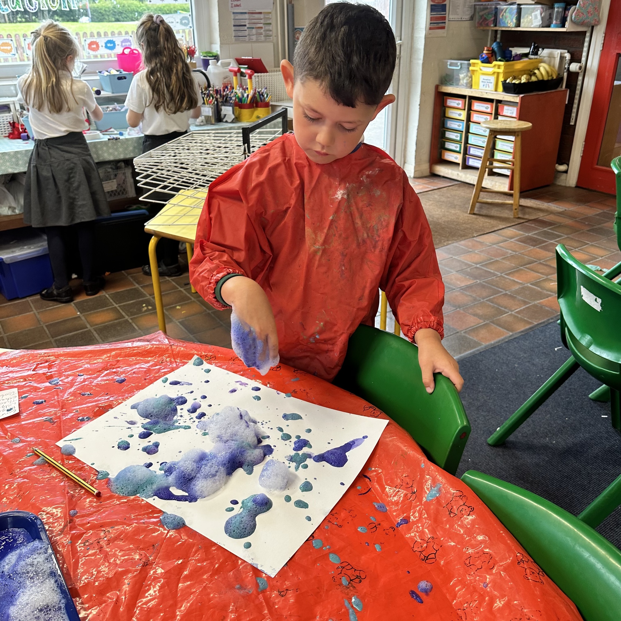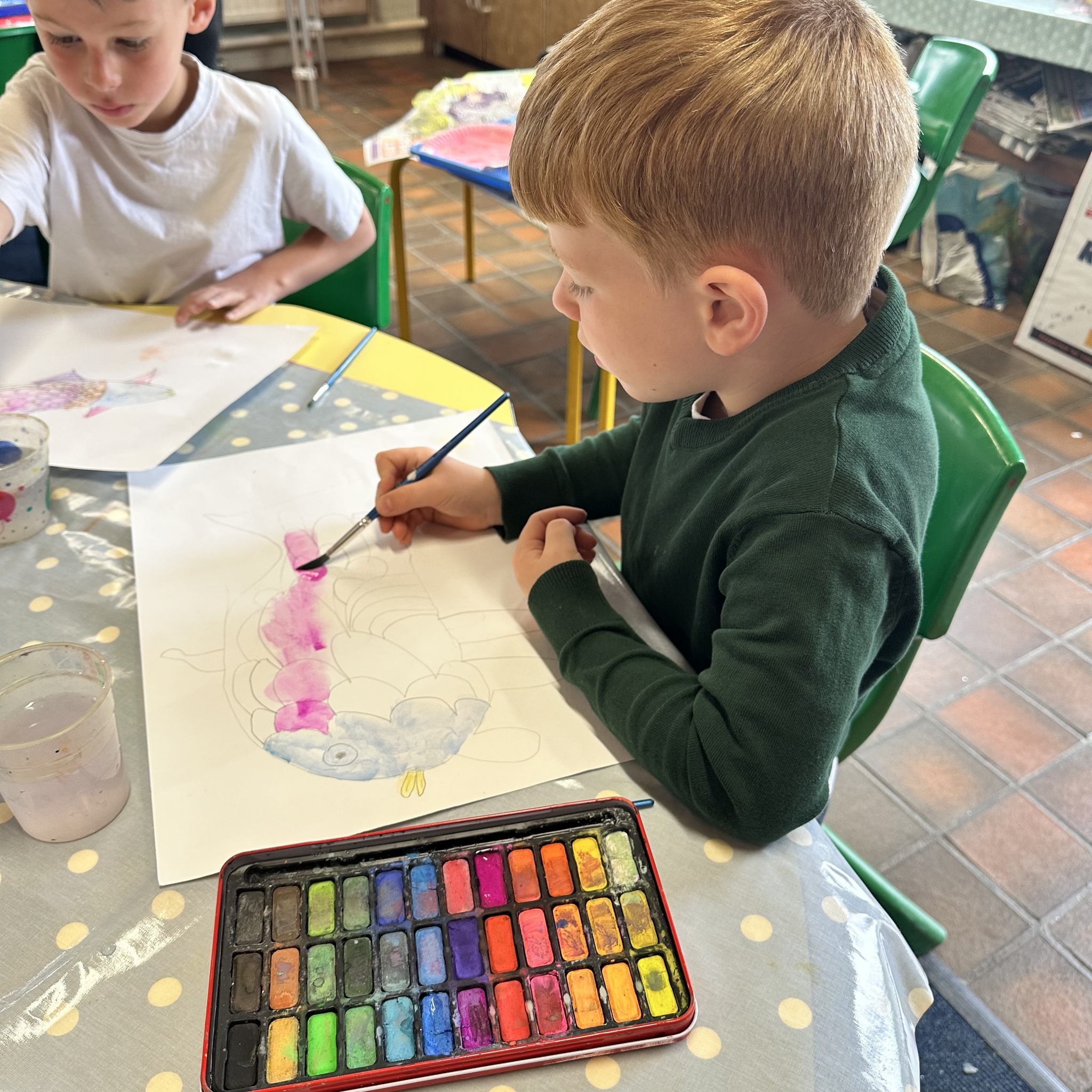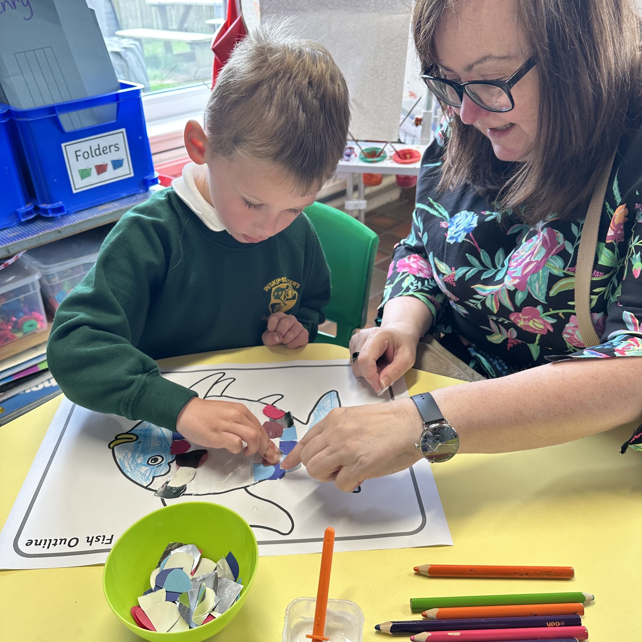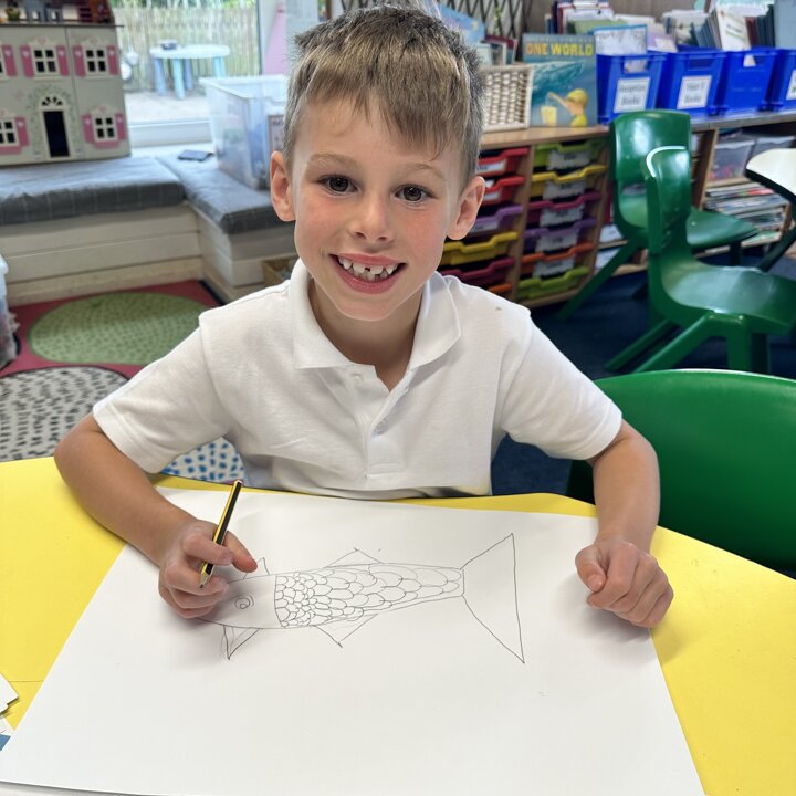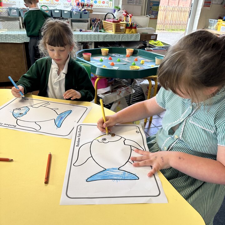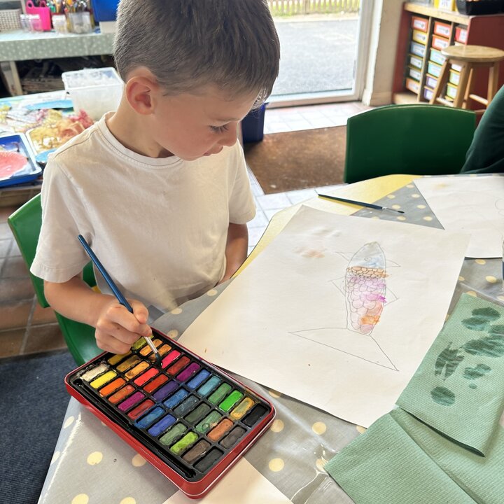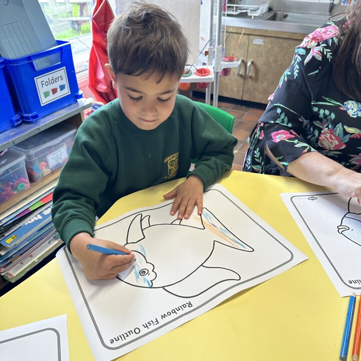 We have had a very busy week being creative and have had so much fun. We read the story The Rainbow Fish by Marcus Pfister which is all about a fish with beautiful scales. The Rainbow Fish is asked to share his scales and when he refuses, he learns very quickly that he has no friends. So he learns to share and make both himself and lots of others happy.