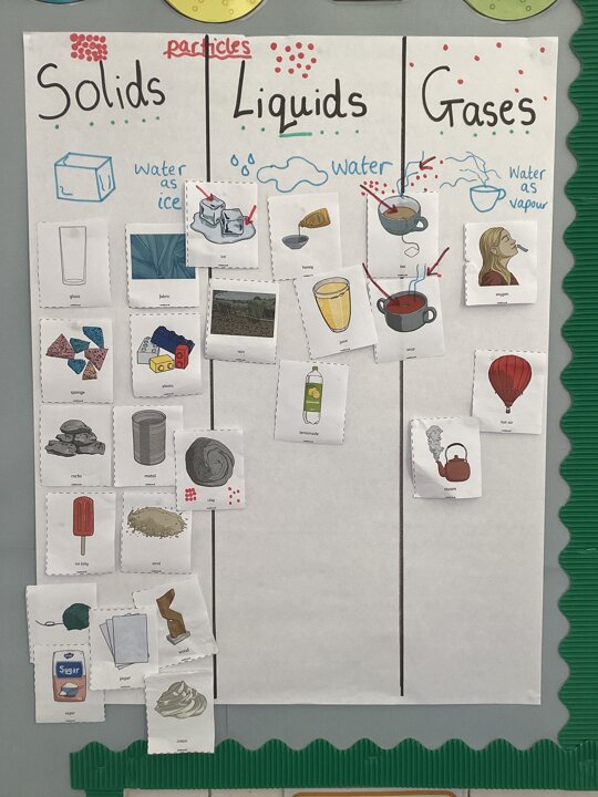 Through discussion, we agreed that some things were clearly a liquid, solid or gas but sometimes it is tricky to tell as they might look, behave or seem like another state. Smoke, cream and ice were points of discussion leading to a discussion of changing state.