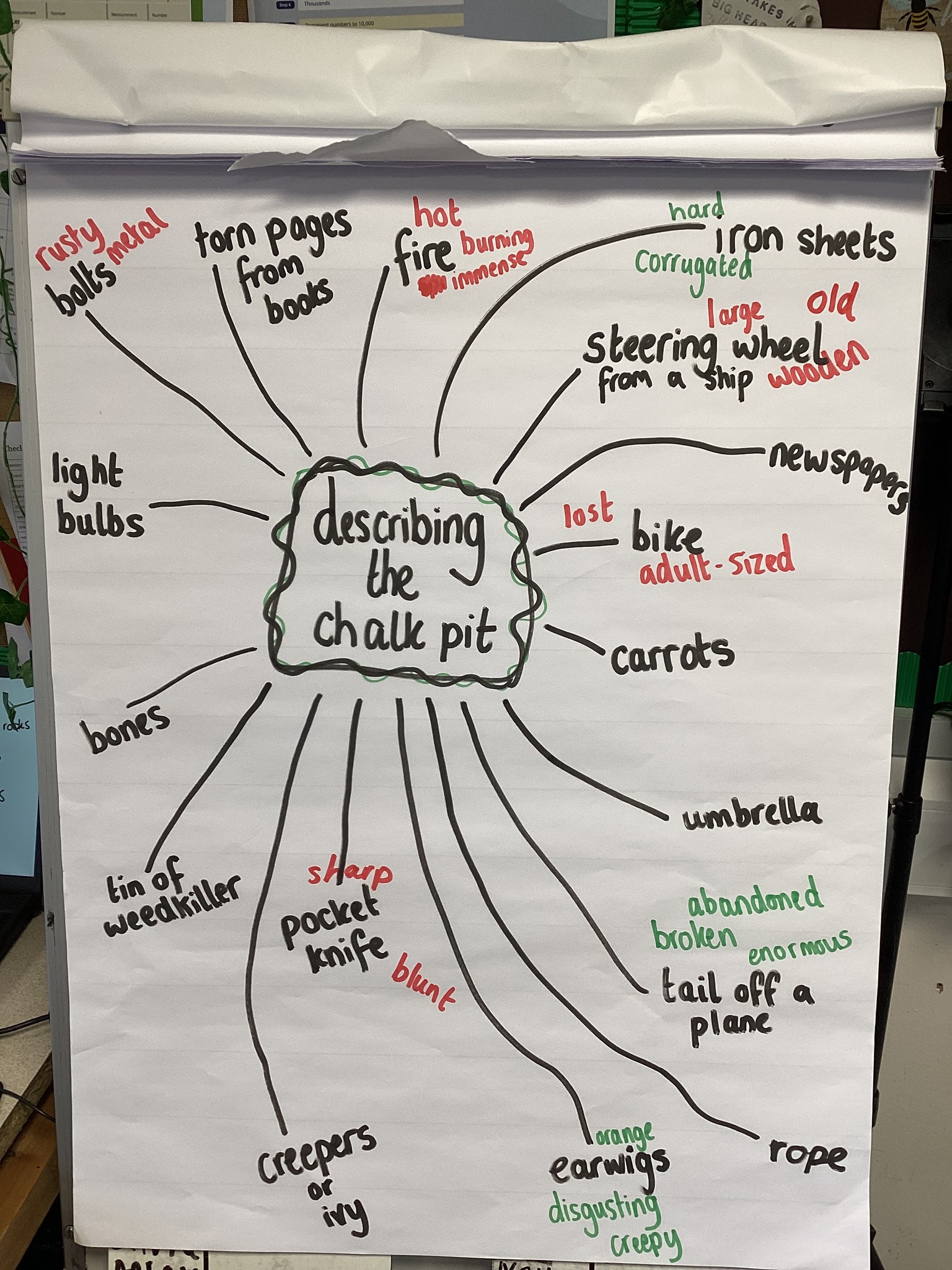 First, we unpicked adjectives in the story before thought showering our own to describe what Barney would have seen in the chalk pit. We drew annotated pictures of the chalk pit to share what we each envisaged.