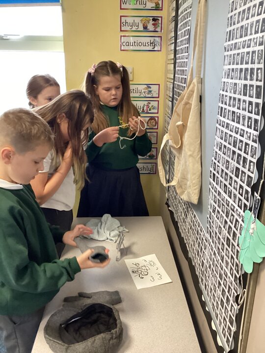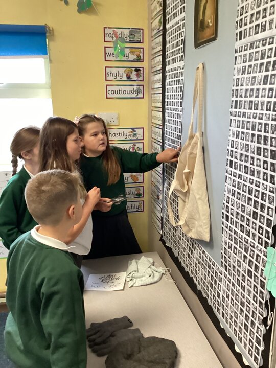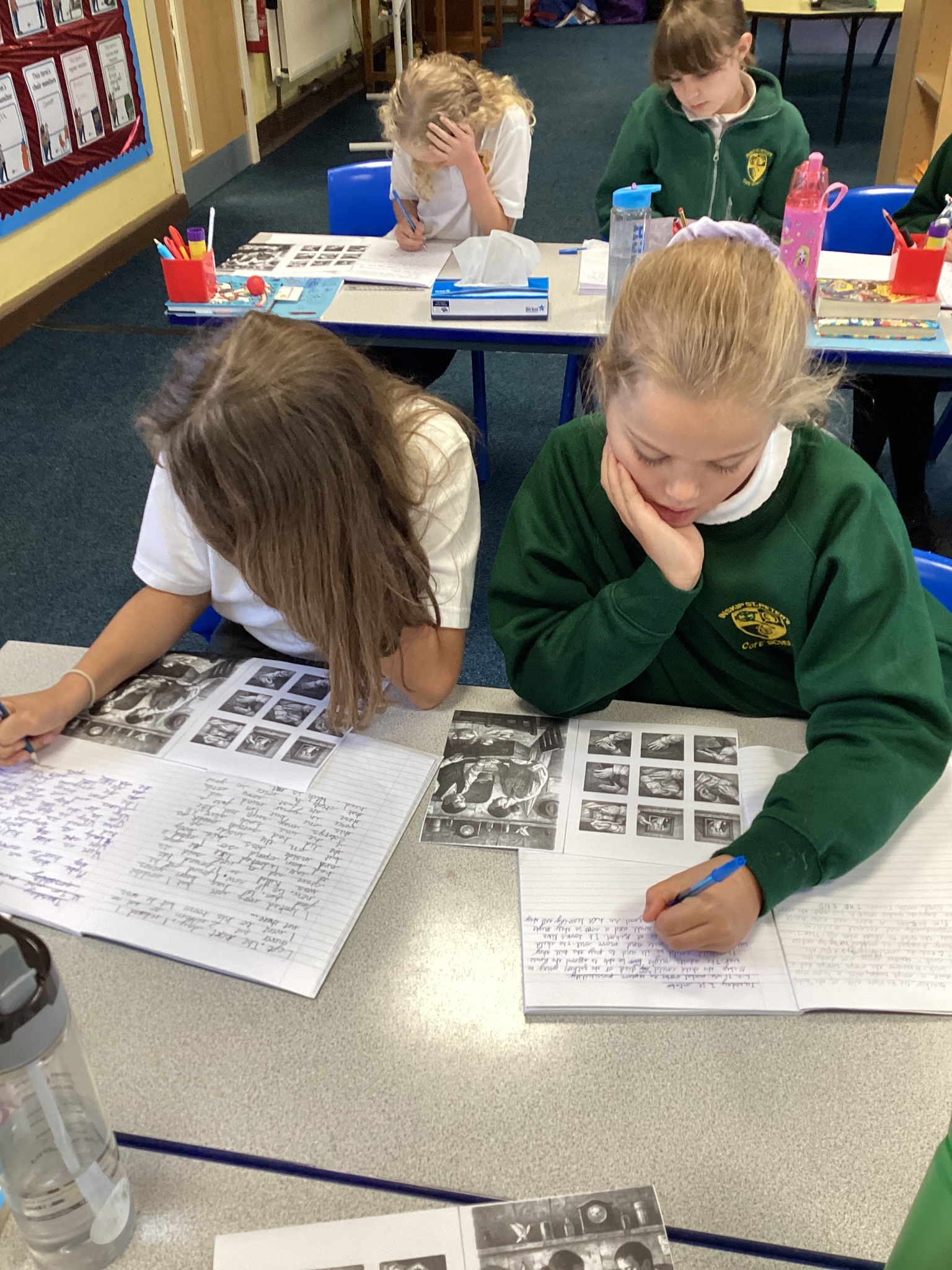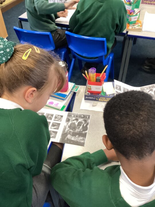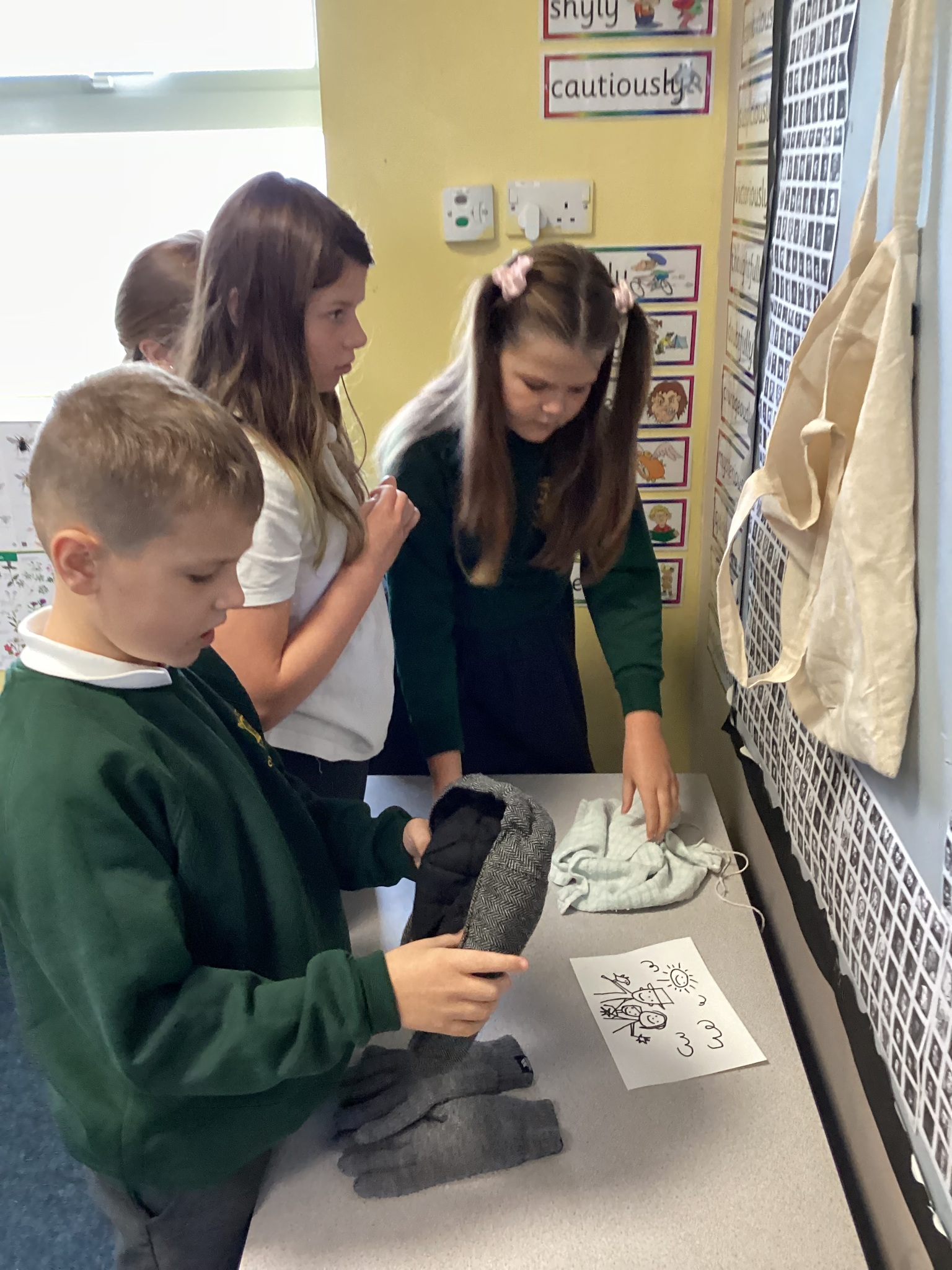 Today the children in Upper School were introduced to a new graphic novel, The Arrival by Shaun Tan that we will be studying for the next few weeks. I did this through a display with items that the children discovered and discussed. We focused the learning through use of modal verbs in our questioning and statements about the book. There was a plain bag with a flat cap, some thick gloves, a wrapped up photo in a frame, a picture drawn by a child in it. The children loved making predictions from the pictures and items. Abbi said that she thought that the picture MUST be precious since it had been wrapped with cloth. Tyreece wondered if the man COULD be a refugee because he was obviously going on a journey and didn’t have much with him. Some children asked questions such as why they looked so sad in the pictures. We will find out more in tomorrow’s lesson!