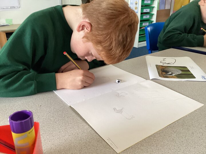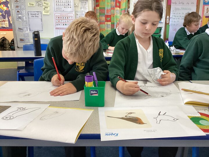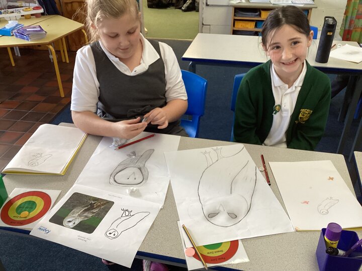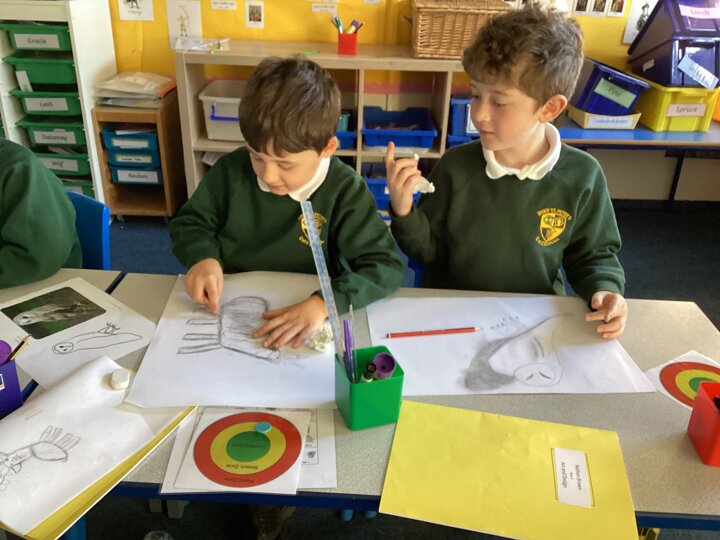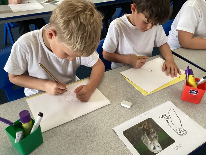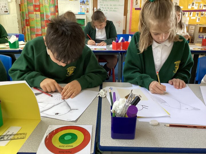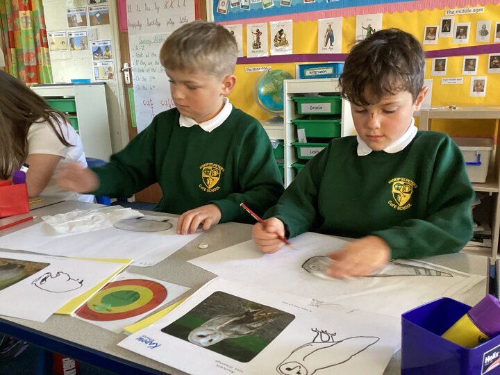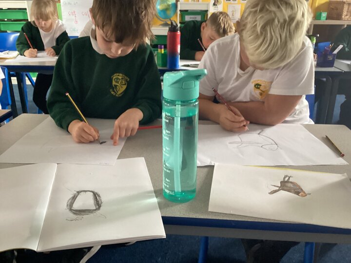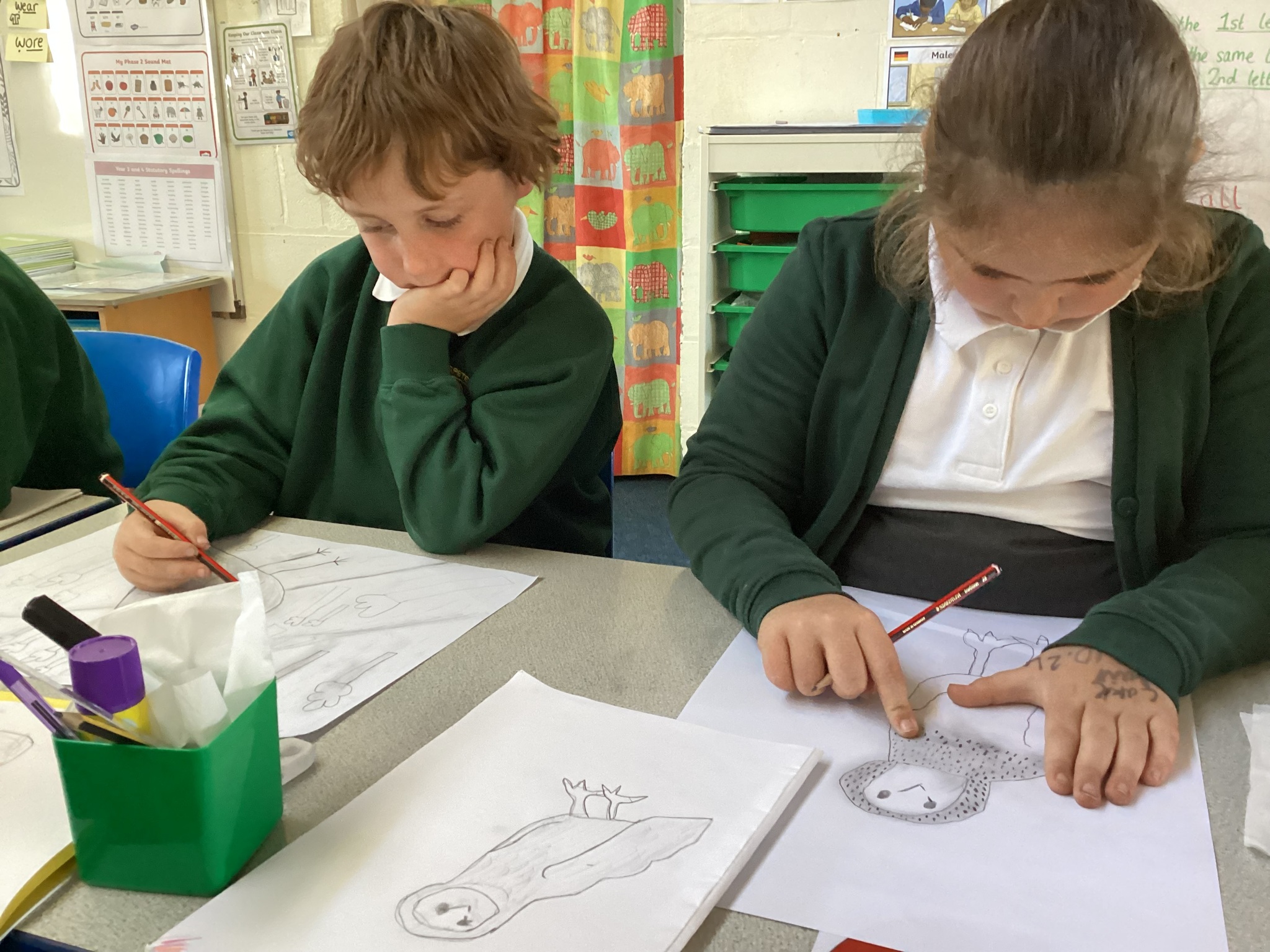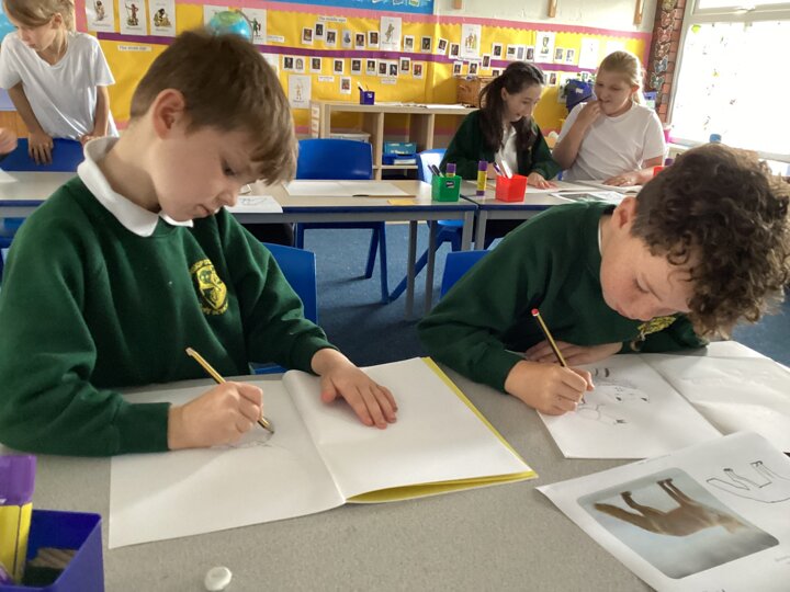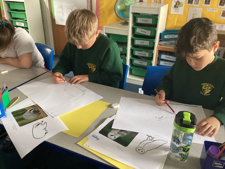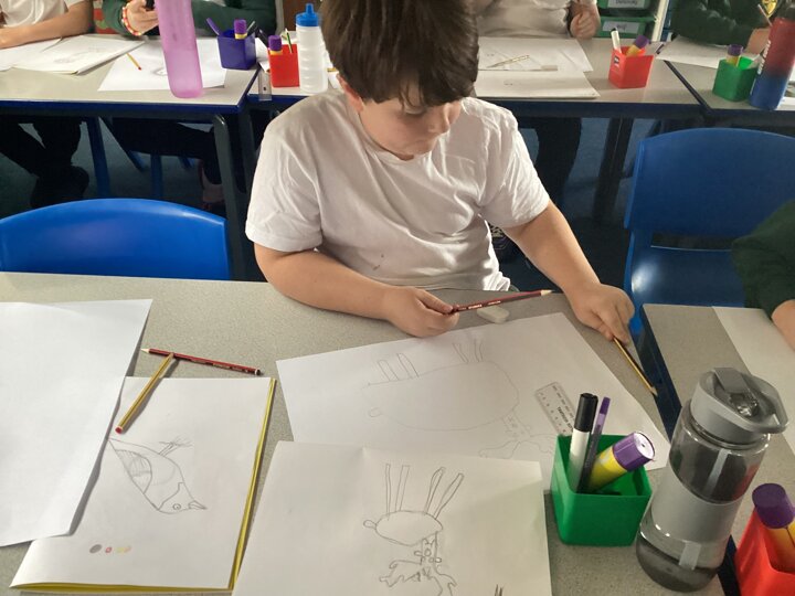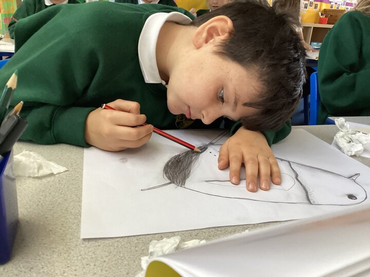 Middle School had to observe for basic shapes and faintly draw these lines first before adding a few details. They were then using their darker art pencils to create bold outlines. Using sketching, shading and blending, the children created some fantastic drawings of the different animals, with a number of children commenting how it was their best piece of art yet!!